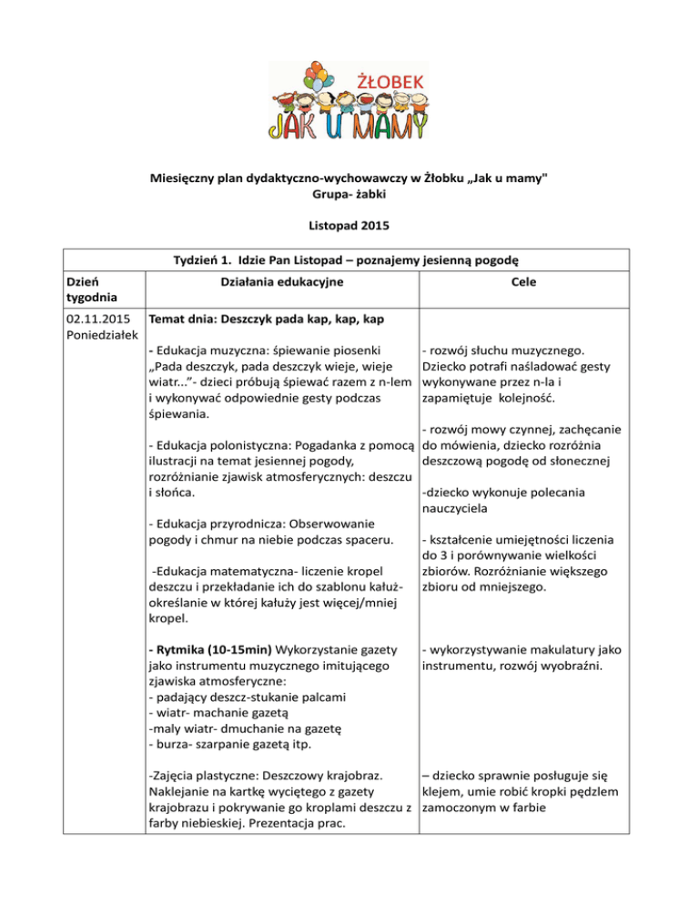 Miesięczny plan dydaktyczno-wychowawczy w Żłobku „Jak u mamy