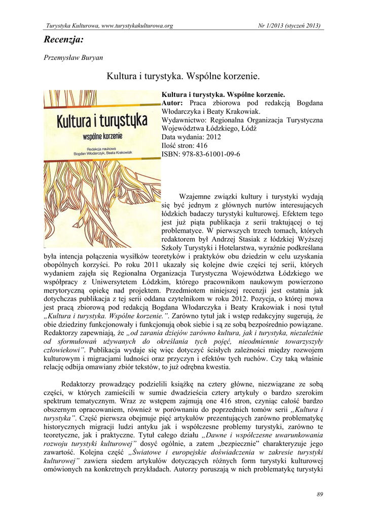 Turystyka Kulturowa, www.turystykakulturowa.org Nr 1/2013 (styczeń 2013) Recenzja: Przemysław Buryan Kultura i turystyka. Wspólne korzenie. Kultura i turystyka. Wspólne korzenie. Autor: Praca zbiorowa pod redakcją Bogdana Włodarczyka i Beaty Krakowiak. Wydawnictwo: Regionalna Organizacja Turystyczna Województwa Łódzkiego, Łódź Data wydania: 2012 Ilość stron: 416 ISBN: 978-83-61001-09-6 Wzajemne związki kultury i turystyki wydają się być jednym z głównych nurtów interesujących łódzkich badaczy turystyki kulturowej. Efektem tego jest już piąta publikacja z serii traktującej o tej problematyce. W pierwszych trzech tomach, których redaktorem był Andrzej Stasiak z łódzkiej Wyższej Szkoły Turystyki i Hotelarstwa, wyraźnie podkreślana była intencja połączenia wysiłków teoretyków i praktyków obu dziedzin w celu uzyskania obopólnych korzyści. Po roku 2011 ukazały się kolejne dwie części tej serii, których wydaniem zajęła się Regionalna Organizacja Turystyczna Województwa Łódzkiego we współpracy z Uniwersytetem Łódzkim, którego pracownikom naukowym powierzono merytoryczną opiekę nad projektem. Przedmiotem niniejszej recenzji jest ostatnia jak dotychczas publikacja z tej serii oddana czytelnikom w roku 2012. Pozycja, o której mowa jest pracą zbiorową pod redakcją Bogdana Włodarczyka i Beaty Krakowiak i nosi tytuł „Kultura i turystyka. Wspólne korzenie.”. Zarówno tytuł jak i wstęp redakcyjny sugerują, że obie dziedziny funkcjonowały i funkcjonują obok siebie i są ze sobą bezpośrednio powiązane. Redaktorzy zapewniają, że „od zarania dziejów zarówno kultura, jak i turystyka, niezależnie od sformułowań używanych do określania tych pojęć, nieodmiennie towarzyszyły człowiekowi”. Publikacja wydaje się więc dotyczyć ścisłych zależności między rozwojem kulturowym i migracjami ludności oraz przyczyn i efektów tych ruchów. Czy taką właśnie relację odbija omawiany zbiór tekstów, to już odrębna kwestia. Redaktorzy prowadzący podzielili książkę na cztery główne, niezwiązane ze sobą części, w których zamieścili w sumie dwadzieścia cztery artykuły o bardzo szerokim spektrum tematycznym. Wraz ze wstępem zajmują one 416 stron, czyniąc całość bardzo obszernym opracowaniem, również w porównaniu do poprzednich tomów serii „Kultura i turystyka”. Część pierwsza obejmuje pięć artykułów prezentujących zarówno problematykę historycznych migracji ludzi antyku jak i współczesne problemy turystyki, zarówno te teoretyczne, jak i praktyczne. Tytuł całego działu „Dawne i współczesne uwarunkowania rozwoju turystyki kulturowej” dosyć ogólnie, a zatem „bezpiecznie” charakteryzuje jego zawartość. Kolejna część „Światowe i europejskie doświadczenia w zakresie turystyki kulturowej” zawiera siedem artykułów dotyczących różnych form turystyki kulturowej omówionych na konkretnych przykładach. Autorzy poruszają w nich problematykę turystyki 89 Turystyka Kulturowa, www.turystykakulturowa.org Nr 1/2013 (styczeń 2013) etnicznej, tematycznej po szlakach, eventowej i industrialnej. Tę część wzbogacają dwa teksty napisane przez badaczy zagranicznych. Artykuł, którego autorem jest Ruben C. Lois Gonzales odnosi się do aktualnego wykorzystania oferty Szlaku Rady Europy Droga św. Jakuba do Santiago de Compostela, natomiast historyczna i industrialna turystyka w Turynie jest przedmiotem prezentacji w tekście Donatelli Sasso z Instytutu Historii im. Gaetano Salvimiego. Część trzecia, o nazwie „Turystyka kulturowa w Polsce i jej regionach – wybrane przykłady”, jest zbiorem artykułów omawiających przykładowe formy turystyki kulturowej w wybranych regionach kraju. Ostatnia część „Miejscowość jako destynacja w turystyce kulturowej” dotyczy natomiast konkretnych, wybranych atrakcji lub ich zespołów badanych z punktu widzenia turystyki kulturowej. Już na etapie pierwszego, pobieżnego przeglądu treści i struktury publikacji ujawnia się jej wyraźny mankament: Jest nim zdecydowanie zbyt duża rozbieżność tematyczna zamieszczonych artykułów. Redaktorom było najwyraźniej trudno przyporządkować je w sensowny sposób do poszczególnych części. Wrażenie wspomnianej rozbieżności czytelnik może odnieść szczególnie podczas lektury pierwszej części monografii, zatytułowanej „Dawne i współczesne uwarunkowania rozwoju turystyki kulturowej”. Taki tytuł mogłaby z powodzeniem nosić osobna publikacja czy nawet seria, rzetelnie i wyczerpująco analizująca tę problematykę. W rzeczywistości jednak otrzymujemy zaledwie pięć tekstów, które zdecydowanie nie spełniają tego zadania. Co więcej, analizują one tak różne zagadnienia, że spięcie ich tak ogólnikową klamrą jest zapewne efektem niemożności ich sklasyfikowania w ramach pozostałych części. Jako pierwszy umieszczony został artykuł „Kulturowo-poznawczy wymiar peregrynacji ludzi antyku” Marka Olędzkiego. Autor ciekawie, aczkolwiek zdecydowanie zbyt krótko, pisze o doświadczeniu krajoznawczym ludzi antyku, przypominając o kilku najważniejszych postaciach tej epoki. W rzeczywistości otrzymujemy jednak zebrane w jednym miejscu powszechnie dostępne i znane już w całości informacje historyczne o prekursorach migracji poznawczych. Wybór tego artykułu jako tekstu otwierającego publikację o tak obszernej problematyce może budzić wrażenie niedosytu. Zamiast niego w tym miejscu raczej oczekiwać należało dobrze udokumentowanego rozważania nad zawartymi w tytule monografii korzeniami kultury i turystyki, w tym nad ewolucją obu dziedzin od ich powstania, ich wzajemnych spotkań i powiązań, aż po dzisiejsze, wspólne funkcjonowanie. Kolejny artykuł autorstwa Andrzeja Kowalczyka, poprzez analizę terminologii naukowej ukazuje związki między zasobem kulturowym a jego atrakcyjnością. Mimo zastosowania nie dla wszystkich ocz
