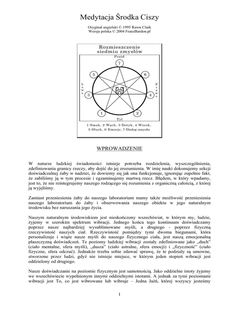 Medytacja Środka Ciszy Oryginał angielski © 1995 Rawn Clark Wersja polska © 2004 FranzBardon.pl Rozmieszczenie siedmiu zmysłów Przód 7 5 L e w o 6 3 4 1 P r a w o 2 Tył 1-Smak, 2-Węch, 3-Dotyk, 4-Wzrok, 5-Słuch, 6-Emocje, 7-Dialog umysłu WPROWADZENIE W naturze ludzkiej świadomości istnieje potrzeba rozdzielenia, wyszczególnienia, zdefiniowania granicy rzeczy, aby dojść do jej zrozumienia. W imię nauki dokonujemy sekcji doświadczalnej żaby w nadziei, że dowiemy się jak ona funkcjonuje, ignorując zupełnie fakt, że zabiliśmy ją w tym procesie i egzaminujemy martwą rzecz. Błędem, w który wpadamy, jest to, że nie reintegrujemy naszego rodzącego się rozumienia z organiczną całością, z której ją wyjęliśmy. Zamiast przeniesienia żaby do naszego laboratorium mamy także możliwość przeniesienia naszego laboratorium do żaby i obserwowania naszego obiektu w jego naturalnym środowisku bez naruszania jego życia. Naszym naturalnym środowiskiem jest nieskończony wszechświat, w którym my, ludzie, żyjemy w szerokim spektrum wibracji. Jednego końca tego kontinuum doświadczamy poprzez nasze najbardziej wysublimowane myśli, a drugiego - poprzez fizyczną rzeczywistość naszych ciał. Rzeczywistość pomiędzy tymi dwoma biegunami, która personalizuje i wiąże nasze myśli do naszego fizycznego ciała, jest naszą emocjonalną płaszczyzną doświadczeń. Te poziomy ludzkiej wibracji zostały zdefiniowane jako „duch” (ciało mentalne, sfera myśli), „dusza” (ciało astralne, sfera emocji) i „fizyczność” (ciało fizyczne, sfera odczuć). Jednakże trzeba sobie zdawać sprawę, że te podziały są umowne, stworzone przez ludzi, gdyż nie istnieje miejsce, w którym jeden stopień wibracji jest oddzielony od drugiego. Nasze doświadczanie na poziomie fizycznym jest samotnością. Jako oddzielne istoty żyjemy we wszechświecie wypełnionym innymi oddzielnymi istotami. A jednak za tymi poziomami wibracji jest To, co jest wibrowane lub wibruje – Jedna Jaźń, której wszyscy jesteśmy 1 ekspresją. Jest to podstawowa struktura, która przywołuje nas w naszej fizycznej samotności i przypomina nam o fundamentalnej prawdzie, że wszyscy jesteśmy w pewien sposób powiązani. Cała ludzka egzystencja jest tańcem pomiędzy doświadczaniem odrębności a pierwotną potrzebą połączenia. Jednym z wielkich paradoksów wszechświata jest to, że to właśnie fakt naszego fizycznego istnienia oślepia nas na poziom, w którym jesteśmy zjednoczeni. Fizyczny świat tak bardzo ściąga naszą świadomą uwagę, że rzadko jesteśmy świadomi tego, co leży poza nim; a właśnie tylko poprzez przerzucenie swojej uwagi dalej, jedynie poprzez odsunięcie jej od świata fizycznego i zwrócenie jej do wewnątrz, możemy doświadczać głębszych poziomów jaźni i zetknąć się z naszą pierwotną Jednością. Zatem główną barierą dla świadomego doświadczania naszej wspólnej wewnętrznej jaźni jest to, że nasze cielesne zmysły pochłaniają większość naszej uwagi. Jest to naturalna konsekwencja fizycznego istnienia i nie można tego osądzać w kategoriach złego czy dobrego. Tak po prostu jest. Zmysły można uważać albo za cudowny dar od łaskawego wszechświata, którego jedynym celem jest dać nam zdolności konieczne do fizycznego życia, albo za przejaw zła, z którym skazani jesteśmy cierpieć i walczyć. Poniższa technika medytacji oparta jest na tym pierwszym podejściu i kładzie nacisk na pozbawioną osądzania kontrolę nad zmysłami. Każdy z nas posiada wrodzoną zdolność do odrzucania zmysłów. Kiedy czytasz te słowa, to czy twoje zmysły słuchu, węchu, zapachu i dotyku nie zostały przygaszone, podczas gdy twoja uwaga skupiła się na widzeniu, odczuciach emocjonalnych i racjonalnym rozważaniu tych słów? To tylko jeden przykład tego, jak podświadomie wybieramy jeden czy dwa bodźce zmysłowe spośród reszty. Aktywnym składnikiem jest tutaj uwaga, czy raczej uwaga świadomości, i właśnie ona jest kluczem, który medytacja środka ciszy (CSM – Center of Stillness Meditation) wykorzystuje w swym ćwiczeniu odrzucania zmysłów. Opierając się na tym, co nieświadomie robimy miliony razy na dzień, CSM sprowadza to do poziomu świadomej zdolności. Osiągnięcie zdolności odrzucania zmysłów w dowolnym momencie wymaga wysiłku i wytrwałości; zwłaszcza chcąc uzyskać w tym jakąś płynność. Lecz nawet pierwsza, krótka chwila separacji od zmysłów, na nowo zaznajamia nas ze środkiem ciszy, tej Pierwotnej Ciszy, którą wszyscy znamy instynktownie. Kiedy już doświadczy się tego spokoju, kwestia wysiłku staje się nieważna w świetle ekscytujących możliwości postrzeganych w tym stanie. Dalsze wzmacnianie kontroli nad zmysłami przychodzi po tym szybko, a wewnętrzne światy otwierają się. Pierwszą rzeczywistością, jaka się otwiera, jest osobowość. W CSM jest to wizualizowane jako sieć świetlnych włókien, które każdy z nas przędzie w strumieniu czasoprzestrzeni. To jest poziom, na którym umieszczamy swoją jaźń w kontekście tego, gdzie i kiedy jesteśmy, i wiążemy się z fizyczną ekspresją. Osobowość jest naszym wytworem – takim, który zazwyczaj tworzymy nieświadomie i posiadamy nad nim niewielką władzę. Tak samo jak moc odrzucania zmysłów, posiadamy również wrodzoną zdolność kształtowania naszej osobowości. Wróć pamięcią do dzieciństwa, kiedy „presja” ze strony rówieśników kierowała cię na to, kim chciałeś być (przynajmniej w jakimś stopniu); był to czas przymierzania różnych masek i wybierania tych, które były „bezpieczne” czy też, miejmy nadzieję, „odpowiednie” dla ciebie. Gdy doroślałeś, to czy nie zamieniałeś niektórych masek nowymi? Każdy z nas ma doświadczenia zmieniania „złych nawyków” lub denerwujących natręctw, by lepiej wpasować się w swoje życie. Mięśnie, których używamy w naszym 