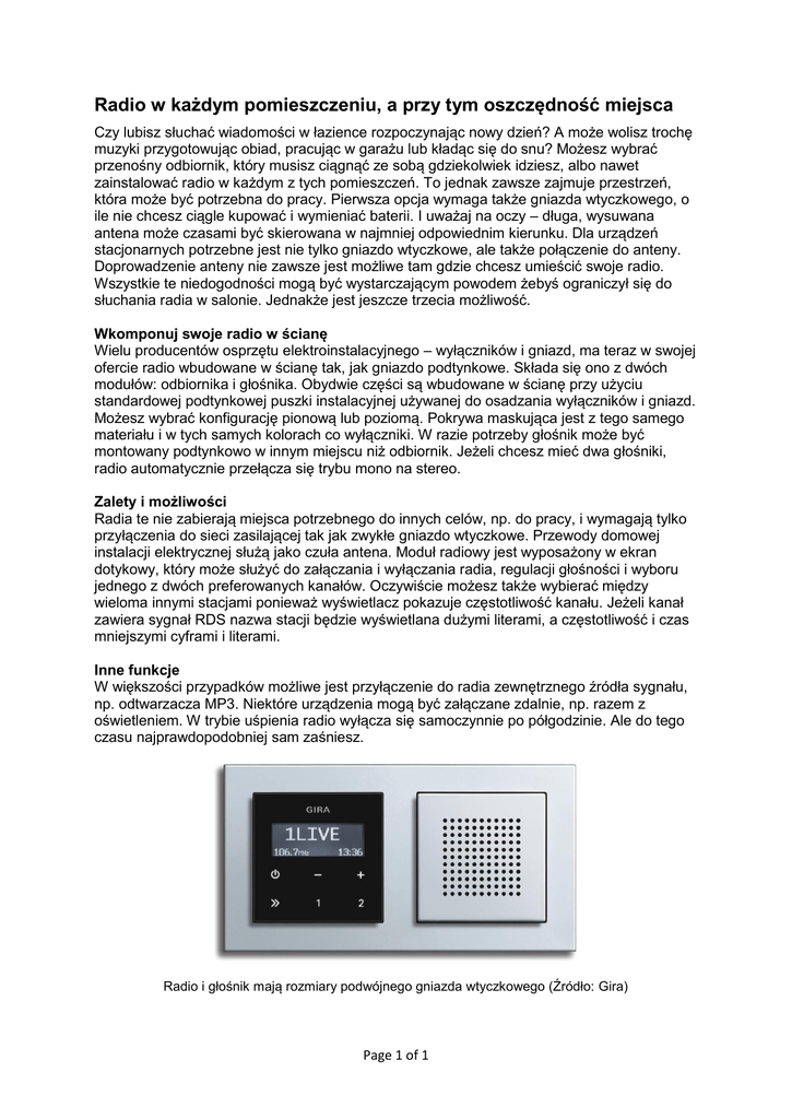 Radio w każdym pomieszczeniu, a przy tym oszczędność miejsca Czy lubisz słuchać wiadomości w łazience rozpoczynając nowy dzień? A może wolisz trochę muzyki przygotowując obiad, pracując w garażu lub kładąc się do snu? Możesz wybrać przenośny odbiornik, który musisz ciągnąć ze sobą gdziekolwiek idziesz, albo nawet zainstalować radio w każdym z tych pomieszczeń. To jednak zawsze zajmuje przestrzeń, która może być potrzebna do pracy. Pierwsza opcja wymaga także gniazda wtyczkowego, o ile nie chcesz ciągle kupować i wymieniać baterii. I uważaj na oczy – długa, wysuwana antena może czasami być skierowana w najmniej odpowiednim kierunku. Dla urządzeń stacjonarnych potrzebne jest nie tylko gniazdo wtyczkowe, ale także połączenie do anteny. Doprowadzenie anteny nie zawsze jest możliwe tam gdzie chcesz umieścić swoje radio. Wszystkie te niedogodności mogą być wystarczającym powodem żebyś ograniczył się do słuchania radia w salonie. Jednakże jest jeszcze trzecia możliwość. Wkomponuj swoje radio w ścianę Wielu producentów osprzętu elektroinstalacyjnego – wyłączników i gniazd, ma teraz w swojej ofercie radio wbudowane w ścianę tak, jak gniazdo podtynkowe. Składa się ono z dwóch modułów: odbiornika i głośnika. Obydwie części są wbudowane w ścianę przy użyciu standardowej podtynkowej puszki instalacyjnej używanej do osadzania wyłączników i gniazd. Możesz wybrać konfigurację pionową lub poziomą. Pokrywa maskująca jest z tego samego materiału i w tych samych kolorach co wyłączniki. W razie potrzeby głośnik może być montowany podtynkowo w innym miejscu niż odbiornik. Jeżeli chcesz mieć dwa głośniki, radio automatycznie przełącza się trybu mono na stereo. Zalety i możliwości Radia te nie zabierają miejsca potrzebnego do innych celów, np. do pracy, i wymagają tylko przyłączenia do sieci zasilającej tak jak zwykłe gniazdo wtyczkowe. Przewody domowej instalacji elektrycznej służą jako czuła antena. Moduł radiowy jest wyposażony w ekran dotykowy, który może służyć do załączania i wyłączania radia, regulacji głośności i wyboru jednego z dwóch preferowanych kanałów. Oczywiście możesz także wybierać między wieloma innymi stacjami ponieważ wyświetlacz pokazuje częstotliwość kanału. Jeżeli kanał zawiera sygnał RDS nazwa stacji będzie wyświetlana dużymi literami, a częstotliwość i czas mniejszymi cyframi i literami. Inne funkcje W większości przypadków możliwe jest przyłączenie do radia zewnętrznego źródła sygnału, np. odtwarzacza MP3. Niektóre urządzenia mogą być załączane zdalnie, np. razem z oświetleniem. W trybie uśpienia radio wyłącza się samoczynnie po półgodzinie. Ale do tego czasu najprawdopodobniej sam zaśniesz. Radio i głośnik mają rozmiary podwójnego gniazda wtyczkowego (Źródło: Gira) Page 1 of 1