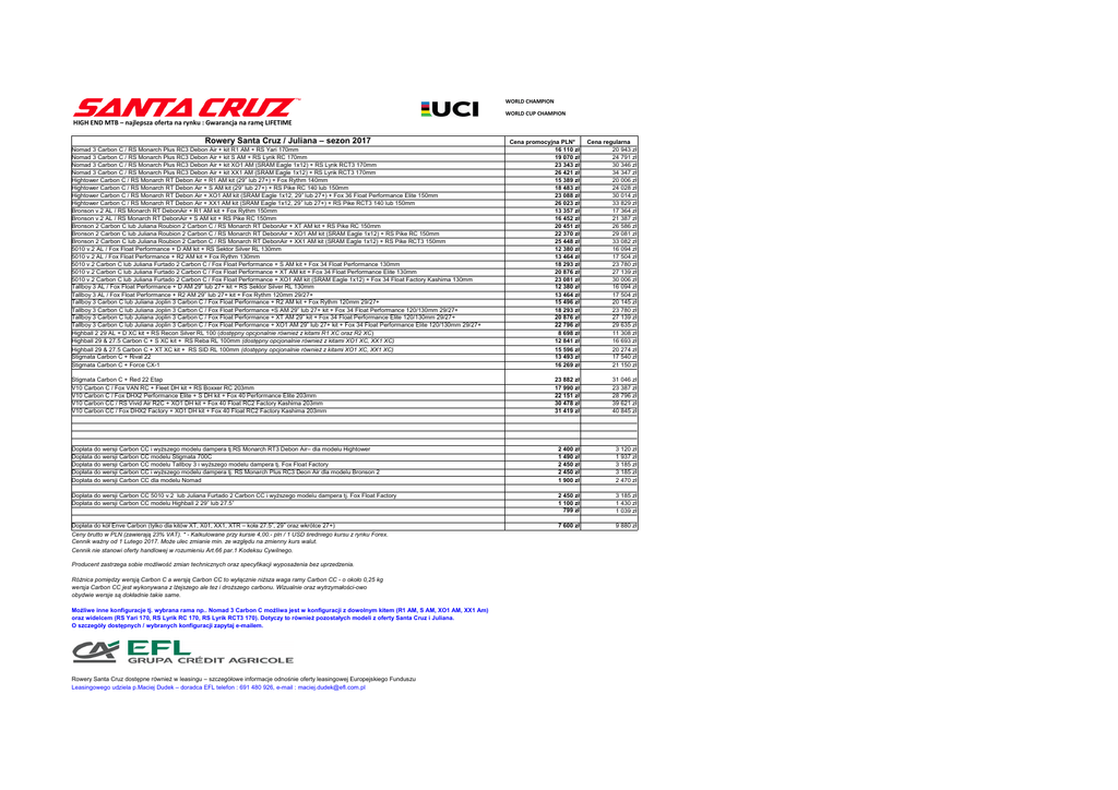 WORLD CHAMPION WORLD CUP CHAMPION HIGH END MTB – najlepsza oferta na rynku : Gwarancja na ramę LIFETIME Rowery Santa Cruz / Juliana – sezon 2017 Cena promocyjna PLN* 16 110 zł 19 070 zł 23 343 zł 26 421 zł 15 389 zł 18 483 zł 23 088 zł 26 023 zł 13 357 zł 16 452 zł 20 451 zł 22 370 zł 25 448 zł 12 380 zł 13 464 zł 18 293 zł 20 876 zł 23 081 zł 12 380 zł 13 464 zł 15 496 zł 18 293 zł 20 876 zł 22 796 zł 8 698 zł 12 841 zł 15 596 zł 13 493 zł 16 269 zł Cena regularna 20 943 zł 24 791 zł 30 346 zł 34 347 zł 20 006 zł 24 028 zł 30 014 zł 33 829 zł 17 364 zł 21 387 zł 26 586 zł 29 081 zł 33 082 zł 16 094 zł 17 504 zł 23 780 zł 27 139 zł 30 006 zł 16 094 zł 17 504 zł 20 145 zł 23 780 zł 27 139 zł 29 635 zł 11 308 zł 16 693 zł 20 274 zł 17 540 zł 21 150 zł 23 882 zł 17 990 zł 22 151 zł 30 478 zł 31 419 zł 31 046 zł 23 387 zł 28 796 zł 39 621 zł 40 845 zł Dopłata do wersji Carbon CC i wyższego modelu dampera tj.RS Monarch RT3 Debon Air– dla modelu Hightower Dopłata do wersji Carbon CC modelu Stigmata 700C Dopłata do wersji Carbon CC modelu Tallboy 3 i wyższego modelu dampera tj. Fox Float Factory Dopłata do wersji Carbon CC i wyższego modelu dampera tj. RS Monarch Plus RC3 Deon Air dla modelu Bronson 2 Dopłata do wersji Carbon CC dla modelu Nomad 2 400 zł 1 490 zł 2 450 zł 2 450 zł 1 900 zł 3 120 zł 1 937 zł 3 185 zł 3 185 zł 2 470 zł Dopłata do wersji Carbon CC 5010 v.2 lub Juliana Furtado 2 Carbon CC i wyższego modelu dampera tj. Fox Float Factory Dopłata do wersji Carbon CC modelu Highball 2 29” lub 27.5” 2 450 zł 1 100 zł 799 zł 3 185 zł 1 430 zł 1 039 zł Dopłata do kół Enve Carbon (tylko dla kitów XT, X01, XX1, XTR – koła 27.5”, 29” oraz wkrótce 27+) Ceny brutto w PLN (zawierają 23% VAT). * - Kalkulowane przy kursie 4,00.- pln / 1 USD średniego kursu z rynku Forex. Cennik ważny od 1 Lutego 2017. Może ulec zmianie min. ze względu na zmienny kurs walut. Cennik nie stanowi oferty handlowej w rozumieniu Art.66 par.1 Kodeksu Cywilnego. 7 600 zł 9 880 zł Nomad 3 Carbon C / RS Monarch Plus RC3 Debon Air + kit R1 AM + RS Yari 170mm Nomad 3 Carbon C / RS Monarch Plus RC3 Debon Air + kit S AM + RS Lyrik RC 170mm Nomad 3 Carbon C / RS Monarch Plus RC3 Debon Air + kit XO1 AM (SRAM Eagle 1x12) + RS Lyrik RCT3 170mm Nomad 3 Carbon C / RS Monarch Plus RC3 Debon Air + kit XX1 AM (SRAM Eagle 1x12) + RS Lyrik RCT3 170mm Hightower Carbon C / RS Monarch RT Debon Air + R1 AM kit (29” lub 27+) + Fox Rythm 140mm Hightower Carbon C / RS Monarch RT Debon Air + S AM kit (29” lub 27+) + RS Pike RC 140 lub 150mm Hightower Carbon C / RS Monarch RT Debon Air + XO1 AM kit (SRAM Eagle 1x12, 29” lub 27+) + Fox 36 Float Performance Elite 150mm Hightower Carbon C / RS Monarch RT Debon Air + XX1 AM kit (SRAM Eagle 1x12, 29” lub 27+) + RS Pike RCT3 140 lub 150mm Bronson v.2 AL / RS Monarch RT DebonAir + R1 AM kit + Fox Rythm 150mm Bronson v.2 AL / RS Monarch RT DebonAir + S AM kit + RS Pike RC 150mm Bronson 2 Carbon C lub Juliana Roubion 2 Carbon C / RS Monarch RT DebonAir + XT AM kit + RS Pike RC 150mm Bronson 2 Carbon C lub Juliana Roubion 2 Carbon C / RS Monarch RT DebonAir + XO1 AM kit (SRAM Eagle 1x12) + RS Pike RC 150mm Bronson 2 Carbon C lub Juliana Roubion 2 Carbon C / RS Monarch RT DebonAir + XX1 AM kit (SRAM Eagle 1x12) + RS Pike RCT3 150mm 5010 v.2 AL / Fox Float Performance + D AM kit + RS Sektor Silver RL 130mm 5010 v.2 AL / Fox Float Performance + R2 AM kit + Fox Rythm 130mm 5010 v.2 Carbon C lub Juliana Furtado 2 Carbon C / Fox Float Performance + S AM kit + Fox 34 Float Performance 130mm 5010 v.2 Carbon C lub Juliana Furtado 2 Carbon C / Fox Float Performance + XT AM kit + Fox 34 Float Performance Elite 130mm 5010 v.2 Carbon C lub Juliana Furtado 2 Carbon C / Fox Float Performance + XO1 AM kit (SRAM Eagle 1x12) + Fox 34 Float Factory Kashima 130mm Tallboy 3 AL / Fox Float Performance + D AM 29” lub 27+ kit + RS Sektor Silver RL 130mm Tallboy 3 AL / Fox Float Performance + R2 AM 29” lub 27+ kit + Fox Rythm 120mm 29/27+ Tallboy 3 Carbon C lub Juliana Joplin 3 Carbon C / Fox Float Performance + R2 AM kit + Fox Rythm 120mm 29/27+ Tallboy 3 Carbon C lub Juliana Joplin 3 Carbon C / Fox Float Performance +S AM 29” lub 27+ kit + Fox 34 Float Performance 120/130mm 29/27+ Tallboy 3 Carbon C lub Juliana Joplin 3 Carbon C / Fox Float Performance + XT AM 29” kit + Fox 34 Float Performance Elite 120/130mm 29/27+ Tallboy 3 Carbon C lub Juliana Joplin 3 Carbon C / Fox Float Performance + XO1 AM 29” lub 27+ kit + Fox 34 Float Performance Elite 120/130mm 29/27+ Highball 2 29 AL + D XC kit + RS Recon Silver RL 100 (dostępny opcjonalnie również z kitami R1 XC oraz R2 XC) Highball 29 & 27.5 Carbon C + S XC kit + RS Reba RL 100mm (dostępny opcjonalnie również z kitami XO1 XC, XX1 XC) Highball 29 & 27.5 Carbon C + XT XC kit + RS SID RL 100mm (dostępny opcjonalnie również z kitami XO1 XC, XX1 XC) Stigmata Carbon C + Rival 22 Stigmata Carbon C + Force CX-1 Stigmata Carbon C + Red 22 Etap V10 Carbon C / Fox VAN RC + Fleet DH kit + RS Boxxer RC 203mm V10 Carbon C / Fox DHX2 Performance Elite + S DH kit + Fox 40 Performance Elite 203mm V10 Carbon CC / RS Vivid Air R2C + XO1 DH kit + Fox 40 Float RC2 Factory Kashima 203mm V10 Carbon CC / Fox DHX2 Factory + XO1 DH kit + Fox 40 Float RC2 Factory Kashima 203mm Producent zastrzega sobie możliwość zmian technicznych oraz specyfikacji wyposażenia bez uprzedzenia. Różnica pomiędzy wersją Carbon C a wersją Carbon CC to wyłącznie niższa waga ramy Carbon CC - o około 0,25 kg wersja Carbon CC jest wykonywana z lżejszego ale tez i droższego carbonu. Wizualnie oraz wytrzymałości-owo obydwie wersje są dokładnie takie same. Możliwe inne konfiguracje tj. wybrana rama np.. Nomad 3 Carbon C możliwa jest w konfiguracji z dowolnym kitem (R1 AM, S AM, XO1 AM, XX1 Am) oraz widelcem (RS Yari 170, RS Lyrik RC 170, RS Lyrik RCT3 170). Dotyczy t