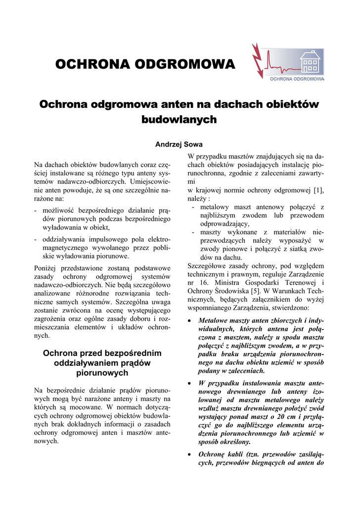 OCHRONA ODGROMOWA Ochrona odgromowa anten na dachach obiektów budowlanych Andrzej Sowa Na dachach obiektów budowlanych coraz częściej instalowane są różnego typu anteny systemów nadawczo-odbiorczych. Umiejscowienie anten powoduje, że są one szczególnie narażone na: - możliwość bezpośredniego działanie prądów piorunowych podczas bezpośredniego wyładowania w obiekt, - oddziaływania impulsowego pola elektromagnetycznego wywołanego przez pobliskie wyładowania piorunowe. Poniżej przedstawione zostaną podstawowe zasady ochrony odgromowej systemów nadawczo-odbiorczych. Nie będą szczegółowo analizowane różnorodne rozwiązania techniczne samych systemów. Szczególna uwaga zostanie zwrócona na ocenę występującego zagrożenia oraz ogólne zasady doboru i rozmieszczania elementów i układów ochronnych. W przypadku masztów znajdujących się na dachach obiektów posiadających instalację piorunochronna, zgodnie z zaleceniami zawartymi w krajowej normie ochrony odgromowej [1], należy : - metalowy maszt antenowy połączyć z najbliższym zwodem lub przewodem odprowadzający, - maszty wykonane z materiałów nieprzewodzących należy wyposażyć w zwody pionowe i połączyć z siatką zwodów na dachu. Szczegółowe zasady ochrony, pod względem technicznym i prawnym, reguluje Zarządzenie nr 16. Ministra Gospodarki Terenowej i Ochrony Środowiska [5]. W Warunkach Technicznych, będących załącznikiem do wyżej wspomnianego Zarządzenia, stwierdzono: • Metalowe maszty anten zbiorczych i indywidualnych, których antena jest połączona z masztem, należy u spodu masztu połączyć z najbliższym zwodem, a w przypadku braku urządzenia piorunochronnego na dachu obiektu uziemić w sposób podany w zaleceniach. • W przypadku instalowania masztu antenowego drewnianego lub anteny izolowanej od masztu metalowego należy wzdłuż masztu drewnianego położyć zwód wystający ponad maszt o 20 cm i przyłączyć go do najbliższego elementu urządzenia piorunochronnego lub uziemić w sposób określony. • Ochronę kabli (tzn. przewodów zasilających, przewodów biegnących od anten do Ochrona przed bezpośrednim oddziaływaniem prądów piorunowych Na bezpośrednie działanie prądów piorunowych mogą być narażone anteny i maszty na których są mocowane. W normach dotyczących ochrony odgromowej obiektów budowlanych brak dokładnych informacji o zasadach ochrony odgromowej anten i masztów antenowych. A. Sowa Ochrona odgromowa anten na dachach obiektów budowlanych odbiorników) należy wykonać przy użyciu odgromników specjalnych. Powyższe wymagania wskazują jednoznacznie, że niezależnie od tego, czy obiekt budowlany posiada urządzenie piorunochronne czy jest jego pozbawiony, wymagane jest uziemienie masztu antenowego. W obiektach posiadających urządzenie piorunochronne odciągi przewodzące masztów antenowych (drut, linka) należy również połączyć z najbliższym zwodem (rys.1.). Zwody poziome instalacji piorunochronnej odciągi Obejma Przewody odprowadzające Obiekt budowlany Rys.1 Ochrona odgromowa metalowego masztu antenowego na dachu budynku. Przewody stosowane do połączeń powinny mieć wymiary nie mniejsze od tych jakie są stosowane do odprowadzania prądów piorunowych, jakie przedstawiono w tablicy 1 [1]. Tablica 1. Najmniejsze wymiary elementów stosowanych jako zwody Drut Taśma Norma PN-86/E05003/01 Linka Bez wyszczególnienia Materiały (wymiary znamionowe w mm) stal ocynkowana miedź 6 10 6 20× 3 20× 4 20× 3 7 ×3 - 7× 2,5 PN-IEC 61024-1. aluminium 2 50 mm 2 70 mm Zastosowanie powyższych zaleceń nie eliminuje wnikania prądu piorunowego do ekranów kabli i wpływania do pomieszczeń z urządzeniami nadawczo-odbiorczymi. Takiego zagrożenia można uniknąć, jeśli anteny umieszczone są w strefie ochronnej tworzonej przez zwody pionowe lub zwody poziome wysokie. Maszt Rodzaj wyrobu nowych warstw metalowych pokrycia dachowego o dostatecznej grubości [1] podstawę masztu antenowego lub zwód pionowy biegnący wzdłuż masztu z materiału nieprzewodzącego należy połączyć blachą pokrycia oraz zapewnić połączenie tego pokrycia z uziomem. 2 35 mm Zalecenie dotyczące uziemiania masztów anten znajduje się również w normie dotyczącej anten zbiorczych [6]. W przypadku braku możliwości przepływu prądu piorunowego w przewodzie uziemiają2 cym można zastosować przewód 16 mm Cu. W obiektach budowlanych, w których wykorzystywania do odprowadzania prądów pioru- Pomiędzy antenami a zwodami powinny być zachowane odpowiednie odstępy izolacyjne. Należy zaznaczyć, że umieszczenie anten w strefie ochronnej nie powinno wpływać na jakość pracy systemu nadawczo- odbiorczego. W obiektach bez instalacji piorunochronnej maszt metalowy lub przewód biegnący wzdłuż masztu wykonanego z materiałów nieprzewodzących należy dołączyć do: a. uziomu naturalnego [1] b. uziomu sztucznego: • fundamentowego • poziomego- uziomy poziome mogą składać się z jednego lub kilku uziomów prostoliniowych promieni)rozmieszczonych w taki sposób, aby kąt między nimi był nie mniejszy od 600. W nowej normie ochrony odgromowej PN-IEC 61024-1 zaleca się, żeby minimalna długość uziomu poziomego wynosiła 5m. • pionowego - pogrążonego w gruncie w taki sposób, aby najniższa jego część umieszczona była na głębokości nie mniejszej od 3m, a najwyższa nie mniej od 0,5m pod powierzchnią gruntu. W przypadku braku wymagań dotyczących wartości rezystancji uziomu należy zastosować uziomy o minimalnych długościach (rys.2 i 3.). A. Sowa Ochrona odgromowa anten na dachach obiektów budowlanych Antena antena Metalowy maszt antenowy Metalowy maszt antenowy Przewód uziemiający Przewód uziemiający wsporniki OBIEKT BUDOWLANY Złącze kontrolne OBIEKT BUDOWLANY Wsporniki Złącze kontrolne ok.0,6m 5m ok. 1m 2,5m Uziom poziomy Uziom pionowy Rys.2. Minimalne wymiary sztucznego uziomu pionowego wykorzystywanych