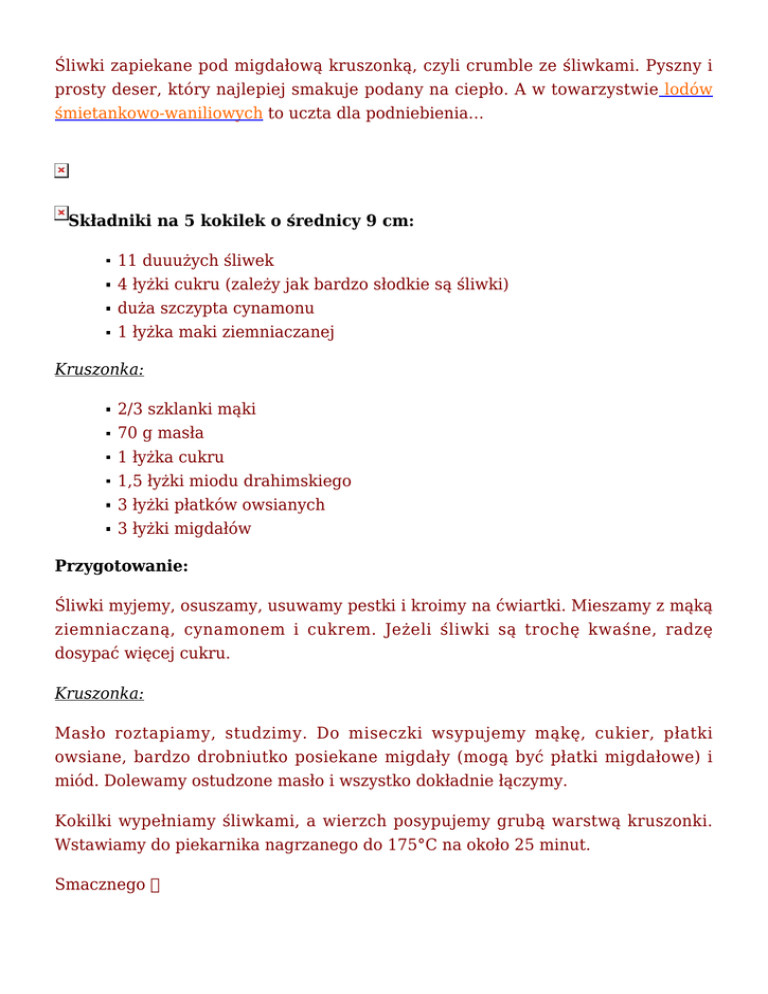 Śliwki zapiekane pod migdałową kruszonką, czyli crumble ze śliwkami. Pyszny i prosty deser, który najlepiej smakuje podany na ciepło. A w towarzystwie lodów śmietankowo-waniliowych to uczta dla podniebienia… Składniki na 5 kokilek o średnicy 9 cm: 11 duuużych śliwek 4 łyżki cukru (zależy jak bardzo słodkie są śliwki) duża szczypta cynamonu 1 łyżka maki ziemniaczanej Kruszonka: 2/3 szklanki mąki 70 g masła 1 łyżka cukru 1,5 łyżki miodu drahimskiego 3 łyżki płatków owsianych 3 łyżki migdałów Przygotowanie: Śliwki myjemy, osuszamy, usuwamy pestki i kroimy na ćwiartki. Mieszamy z mąką ziemniaczaną, cynamonem i cukrem. Jeżeli śliwki są trochę kwaśne, radzę dosypać więcej cukru. Kruszonka: Masło roztapiamy, studzimy. Do miseczki wsypujemy mąkę, cukier, płatki owsiane, bardzo drobniutko posiekane migdały (mogą być płatki migdałowe) i miód. Dolewamy ostudzone masło i wszystko dokładnie łączymy. Kokilki wypełniamy śliwkami, a wierzch posypujemy grubą warstwą kruszonki. Wstawiamy do piekarnika nagrzanego do 175°C na około 25 minut. Smacznego Wilgotne orzechowe ciasto przełożone puszystą, rozpływającą się w ustach pianką z ajerkoniaku. Całość polana gęstą czekoladą i ozdobiona karmelem. Eleganckie i pyszne… Składniki: Ciasto: 8 jajek 2 szklanki mielonych orzechów włoskich 1 szklanka cukru szczypta soli Pianka z ajerkoniaku: 500 ml śmietany 30% 8 łyżeczki żelatyny 1,5 szklanki ajerkoniaku 4 łyżki cukru pudru 0,5 szklanki mleka Polewa czekoladowa: 3 łyżki ciemnego kakao 1/3 szklanki cukru 90 g masła 3 łyżki wody Przygotowanie: Ciasto: Oddzielić żółtka od białek. Żółtka utrzeć z cukrem na puszystą masę. Dodać zmielone orzechy i wymieszać. Białka ubić ze szczyptą soli i delikatnie połączyć z masą. Ciasto podzielić na dwie części. Dwie blaszki o wymiarach około 22 x 32 wyłożyć folią aluminiową i wylać na nich równomiernie masę. Piec w piekarniku nagrzanym do 170 stopni przez około 10 minut. Wystudzić. Pianka z ajerkoniaku: Do rondelka wlać zimne mleko i wsypać żelatynę. Odstawić do napęcznienia. Śmietanę ubić z cukrem pudrem, następnie mieszając, powoli dolewać ajerkoniak. Mleko z żelatyną postawić na gaz i podgrzewać do całkowitego rozpuszczenia żelatyny ( nie wolno zagotować!). Wystudzić, następnie bardzo powoli dolewać do ubitej śmietany, cały czas mieszając (jeżeli wlejemy szybko to zrobią się grudki). Wstawić do lodówki, od czasu do czasu mieszać i sprawdzać czy tężeje. Kiedy zacznie tężeć, rozprowadzić ją na jednej warstwie ciasta. Następnie przykryć drugą, nie odrywając foli aluminiowej, tak aby folia była na wierzchu i delikatnie ją ściągnąć. Ciasto wstawić do lodówki, aż masa całkowicie stężeje. Polewa czekoladowa: W rondelku roztopić masło, dodać resztę składników i dokładnie wymieszać. Gotować na małym ogniu, aż zrobi się gęsta. Tak przygotowaną polewą polać gotowe ciasto. Karmelowe esy-floresy: Zrobić karmel i za pomocą łyżki robić esy-floresy na foli aluminiowej. Gdy stwardnieją delikatnie je oderwać i przyłożyć do boków pokrojonego ciasta. Smacznego Przepis z programu „MasterChef Australia”, ale… zmodyfikowany Tartaletki są bardzo smaczne i pięknie się prezentują. Podanie gruszek w taki sposób… robi wrażenie Jeżeli chcecie ugotować 11 gruszek (tyle wyjdzie tartaletek) to radzę przygotować pół porcji płynu więcej do ich gotowania, wszystko zależy od wielkości gruszek. Składniki: Kruche ciasto: 1 i 1/3 szklanki mąki 120 g masła 3 łyżki cukru pudru 1 jajko 1 żółtko szczypta soli Gruszki: gruszki 3 szklanki białego wytrawnego wina 1 szklanka wody 3/4 szklanki cukru 3 łyżki miodu 3 gwiazdki anyżu 4 ziarenka czarnego pieprzu Masa migdałowa: 100 g masła 100 g zmielonych migdałów 1/2 szklana cukru pudru 2 łyżki mąki tortowej 1 jajko 2 żółtka 2 łyżki likieru o smaku amaretto Przygotowanie: Kruche ciasto: Do miski przesiewamy mąkę, dodajemy sól, cukier puder, żółtko i jajko. Dokładamy masło i siekamy na malutkie kawałeczki. Delikatnie zagniatamy ciasto, ale nie za długo. Ciasto owijamy folią i wstawiamy do lodówki na około 1 godzinę. Po schłodzeniu rozwałkowujemy, wylepiamy foremki i nakłuwamy spód widelcem. Pieczemy 8-10 minut w piekarniku nagrzanym do 175 stopni. Gruszki: Do dużego garnka wlewamy wino, wodę, miód, cukier i przyprawy. Zagotowujemy i mieszamy. Gruszki obieramy i wkładamy do garnka. Gotujemy na małym ogniu około 20- 30 minut. Jeżeli gruszki były twarde, gotujemy dłużej, ale uważamy żeby ich nie rozgotować. Ugotowane gruszki wyjmujemy, studzimy, odkrawamy kawałeczek spodu i delikatnie wycinamy gniazda nasienne. Masa migdałowa: Wszystkie składniki razem utrzeć. Upieczone tartaletki wypełniamy przygotowaną masą migdałową i wstawiamy do piekarnika nagrzanego do 160 stopni na 10 minut. Następnie wyjmujemy, postawiamy na każdej gruszkę (lekko dociskamy) i pieczemy około 10 minut. Gotowe tartaletki ustawiamy na talerzu i posypujemy cukrem pudrem. Smacznego Tartaletki to kruche ciasto wypełnione nadzieniem. Nie zawsze muszą być podawane na słodko, można również na słono. Dzisiaj zrobiłam je z piersią z gęsi, kasztanów i udekorowałam puree ziemniaczanym ze smalczykiem roślinnym. Smakowita pajda zaskoczyła mnie swoim aromatem i smakiem, który idealnie pasuje do puree i nadzienia. Składniki: Spód: 250 g mąki 100 g masła 1 jajko szczyptę soli Nadzienie: 1 duża pierś z gęsi 100 g gotowanych kasztanów 1 łyżka natki pietruszki 3 ziarenka jałowca 1 łyżka ”Smakowitej pajdy” z ziołami ogrodowymi 3 łyżki śmietanki 30 % 1 jajko 2 łyżki startego parmezanu sól, pieprz Puree: 3 ziemniaki 1 łyżka śmietany 18% 1 łyżka „Smakowitej pajdy” z ziołami ogrodowymi Przygotowanie: Spód: Wszystkie składniki zagniatamy do uzyskania jednolitej masy. Owijamy folią 