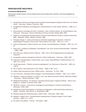 1 PRZESTĘPCZOŚĆ NIELETNICH Zestawienie bibliograficzne Opracowanie: Barbara Zaleska. Centrum Edukacji Nauczycieli w Białymstoku, Zespół ds. informacji pedagogicznej i doradztwa 1. Asocjalność nieletnich przestępców jako przedmiot psychologicznej diagnozy klinicznej / Jan Marian Stanik. - Warszawa : Wydaw. Prawnicze, 1980 2. Chuligaństwo futbolowe a przestępczość / Andrzej Rejzner // Probl. Opiek. Wychow. - 1998, nr 5, s. 30-35 3. Demoralizacja i przestępczość dzieci i młodzieży : atlas / Andrzej Laskow- ski, Andrzej Rejzner, Ewa Tokarczyk. - Warszawa : Centrum Metodyczne Pomocy Psychol.-Pedag. MEN, 1996 4. Diagnoza resocjalizacyjna funkcjonowania nieletnich pod nadzorem kuratora / Grażyna OlszewskaBaka. - Białystok : Białost. Wydaw. Prasowe, 1989 5. Dlaczego zabijają ? : analiza porównawcza nieletnich popełniających zbrodnie i nieletnich popełniających kradzieże / Danuta Raś, Tatiana Betke // Szk. Spec. - 1991, nr1, s.3-13 6. Dzieci mordują dzieci / Adam Frączek; rozm. przepr. Ewa Nowakowska // Polityka. - 1991, nr3, s.3132 1. Dzieci ulicy : problemy, profilaktyka, resocjalizacja / red. nauk. Grażyna Olszewska-Baka. - Białystok : "eRBe", 2000 8. East side story / Natasza Socha // Wprost. - 1991, nr33, s.52-53 Zorganizowana przestępczość nieletnich. 9. Europejskie systemy resocjalizacji nieletnich / Marian Kalinowski. - Warszawa : WSiP, 1991 10. Falowanie resocjalizacyjne / Lesław Pytka; rozm. przepr. Alicja Rafalska // Opieka Wychow. Ter. 1991, nr2, s.29-32 11. Jak do tego doszło...? dziecko w procesie patologizacji / Jan Tatarowicz // Nowa Szk. - 1999, nr3, s.30-33 12. Jak na wojnę / Lidia Ostałowska // Gaz. Wybor. - 2000, nr 281, s.8-11 13. Jedyny, który pozostał przy życiu / Elliott Leyton. - Warszawa : "al. fine", 1996 14. Kij w tornistrze : dlaczego nieletni zabijają? / Ewa Nowakowska // Polityka. - 1991, nr14, s.18,20 15. Mediacja : nieletni przestępcy i ich ofiary / red. nauk. Beata Czarnecka- Dzialuk, Dobrochna Wójcik. - Warszawa : "Oficyna Naukowa", 1999 16. Młodociani przestępcy : ich wartości i orientacja wartościująca / Eugeniusz Bielicki. - Wyd.2 uzup. Bydgoszcz : Wydaw. Uczelniane WSP, 1996 11. Młodzież i przemoc : mechanizmy socjologiczno-psychologiczne / Krystyna Kmiecik-Baran. Warszawa : PWN, 1999 18. Młodociani sprawcy przestepstw o charakterze chuligańskim / Zofia Ostrihanska, Dobrochna Wójcik. - Wrocław : Zakł. Narod. im. Ossolińskich, 1982 19. Mlodzież społecznie niedostosowana / Stefan Turlej. - Warszawa : WSiP, 1982 20. Młodzeż z małych miast : charakterystyka socjokulturowa / Barbara Fatyga // Probl. Opiek. Wychow. - 2000, nr1, s. 10-19 21. Na całość / Guy Gilbert. - Poznań : "W Drodze", 1996 2 22. Niektóre determinanty przestępczych zachowań nieletnich / Teresa Soltysiak // Probl. Alkoh. 1995, nr 11/12, dod. s. I-IV 23. Nieletni gangsterzy / Maciej Łuczak, Ewa Ornacka // Wprost. - 2000, nr24, s.26-29 24. Nieletni sprawcy czynów karalnych / Agata Tyburska // Probl. Opiek.- Wychow. - 1999, nr10, s.3338 25. Nikt z nami nie rozmawia, każdy do nas mówi : wyw. / Maria Dudzikowa // Probl. Opiek.-Wychow. 1998, nr2, s.3-6, III okl. 26. Odpowiedzialność karna nieletnich a rodzaj stosowanych środków prawnych / Agata Tyburska // Probl. Opiek.-Wychow. - 1999, nr6,s.29-36 21. Okrucieństwo i zbrodnia dziecięca : incydent czy znak czasu? : materiały z seminarium "Wirtualne i realne zbrodnie dziecięce w cywilizacji, kulturze, szkole, rodzinie". Warszawa 20-21 marca 2000r. : praca zbiorowa / pod red. Lesława Pytki i Barbary Głowackiej. - Warszawa : Krajowy Komitet Wydaw. Resoc., 2000 28. Osobowość nieletnich przebywających w placówkach resocjalizacyjnych / Bazyli Baran, Aleksander Bielawiec. - Szczecin : Wydaw. Nauk. Uniw. Szczecińskiego, 1994 29. Pisma : szkice, artykuły, rozprawy / Natalia Han-Ilgiewicz. - Warszawa : WSPS, 1995 30. Podstawowe źródła demoralizacji i przestępczości nieletnich : wokół policyjnej analizy. Cz.2 / oprac. Janusz Wencel // Probl. Alkoh. - 1981, nr10/12, s.22-26 31. Postawy wobec agresji a modelowanie zachowań agresywnych u nieletnich przestępców / Małgorzata Toeplitz-Winiewska. - Warszawa : Wydaw. UW, 1980 32. Profilaktyka pedagogiczna : zarys problematyki / Tadeusz Wiśniewski. - Warszawa : PWN, 1989 33. Przemoc dzieci i młodzieży w perspektywie polskiej transformacji ustrojowej / pod red. Jana Papieża, Andrzeja Płukisa. - Toruń : Wydaw. Adam Marszałek, cop. 2000 34. Przestępczość dzieci : etiologia i rozwój / Ewa iabczyńska. - Warszawa : PWN, 1983 35. Przyczyny przestępczości i wizje środków zapobiegawczych : badanie opinii młodzieży / Barbara Karolczak-Biernacka // Edukacja. - 1998, nr2, s.31-42 36. Psychologiczne determinanty przestępczości młodocianych : analiza kryminologiczna / Krystyna Ostrowska. - Warszawa : PWN, 1981 31. Spostrzeganie ludzi przez nieletnich sprawców agresywnych przestępstw / Izabela Marchlewicz // Opieka Wychow. Ter. - 1996, nr4, s.31-38 38. Struktura aspiracji młodzieży przestępczej : badania własne / Wiesław Sikorski // Edukacja. - 1998, nr2, s.90-91 39. Subkultury a przemoc : w perspektywie psychoedukacji, socjalizacji i samo- realizacji dzieci i młodzieży / Marek Jędrzejewski. - Warszawa : "iak", 2001 40. Sytuacyjne uwarunkowania przestępczości młodocianych / Piotr Andrzej Stępniak. - Poznań : Wydaw. Nauk. UAM, 1989 41. Szalikowcy : o zachowaniach dewiacyjnych kibiców sportowych / Przemy- sław Piotrowski. - Toruń : Wydaw. Adam Marszałek, 2000 42. Środowiskowe uwarunkowania zachowań przestępczych nieletnich dziewcząt / Irena Budrewicz. Bydgoszcz : Wydaw. Uczelniane WSP, 1991 43. Trzynastoletni przestępcy : analityczny dokument Komendy Głównej Policji / oprac. Janusz Wencel // Probl. Alkoh. - 1991, nr8/9, s.5-8 44. Wpływ środowiska rodzinnego na przestępczość nieletnich / Krystyna Balińska. - Katowice : UŚ, 1986 3 45. Z zagadnień psychologii socjalizacji : prace Zespołu