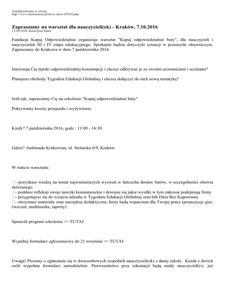 Artykuł pobrany ze strony http://www.ekonsument.pl/news-show-67018.php Zapraszamy na warsztat dla nauczycieli(ek) - Kraków, 7.10.2016 13.09.2016, Katarzyna Salus Fundacja Kupuj Odpowiedzialnie organizuje warsztat "Kupuj odpowiedzialnie buty", dla nauczycieli i nauczycielek III i IV etapu edukacyjnego. Spotkanie będzie dotyczyło sytuacji w przemyśle obuwniczym. Zapraszamy do Krakowa w dniu 7 października 2016. Interesują Cię tajniki odpowiedzialnej konsumpcji i chcesz odkrywać je ze swoimi uczennicami i uczniami? Planujesz obchody Tygodnia Edukacji Globalnej i chcesz dołączyć do nich nową tematykę? Jeśli tak, zapraszamy Cię na szkolenie "Kupuj odpowiedzialnie buty" Pokrywamy koszty przejazdu i wyżywienia. Kiedy? 7 października 2016, godz.: 11:00 - 16:30. Gdzie? Ambasada Krakowian, ul. Stolarska 6/9, Kraków W trakcie warsztatu: - pozyskasz wiedzę na temat najważniejszych wyzwań w łańcuchu dostaw butów, w szczególności obuwia skórzanego - poddasz refleksji swoje nawyki konsumenckie i dowiesz się jakie wysiłki w tym zakresie podejmują firmy - przygotujesz się do wzięcia udziału w Tygodniu Edukacji Globalnej oraz/lub Dniu Bez Kupowania - otrzymasz materiały oraz narzędzia dydaktyczne, które będą wsparciem dla Twojej pracy (propozycje gier, ćwiczeń, multimedia, raporty) Sprawdź program szkolenia >> TUTAJ Wypełnij formularz zgłoszeniowy do 21 września >> TUTAJ Uwaga! Prosimy o zgłaszanie się w dwuosobowych zespołach nauczycieli(ek) z danej szkoły. Każda z dwóch osób wypełnia formularz samodzielnie. Pierwszeństwo przy rekrutacji będą miały nauczycielki/e, już zaangażowane w podobne działania edukacyjne lub mające ciekawe plany na ich rozpoczęcie. Liczba miejsc ograniczona. O wynikach rekrutacji poinformujemy 23 września. Warsztat poprowadzą doświadczone ekspertki współpracujące z FKO, specjalizujące się w kampaniach konsumenckich i działaniach edukacyjnych na rzecz odpowiedzialnej konsumpcji. Marta Gontarska - trenerka, zajmuje się edukacją globalną od osmiu lat. Pracowała przy kampaniach dot. świadomej konsumpcji elektroniki i odzieży w Koalicji KARAT. W okresie 201302015 koordynowała projekt dot. włączania tematyki globalnej do edukacji studentek i studentów kiedrunków i specjalizacji pedagogicznych, w Instytucie Globalnej Odpowiedzialności (IGO). Od wielu lat bierze aktywny udział w procesie międzysektorowym nt. edukacji globalnej i jest autorką wielu analiz, ekspertyz i materiałów edukacyjnych z tej dziedziny. Od 2014 r. współpracuje z Fundacją Kupuj Odpowiedzialnie przy realizacji działań edukacyjnych. Joanna Szabuńko - ekspertka, od 2005 roku zajmuje się kwestiami odpowiedzialnej produkcji i konsumpcji, jako doświadczona koordynatorka ponad 15 projektów edukacyjnych, badawczych i kampanijnych, realizowanych w Polsce i na świecie. Od 10 lat współpracuje z siecią Clean Clothes Campaign i była jedną z założycielek Koalicji Clean Clothes Polska. Od 2012 roku jest również zaangażowana w realizację projektów kampanii "Kupuj Odpowiedzialnie". Obecnie jest vice-prezeską Fundacji Kupuj Odpowiedzialnie, współ-koordynującą wszystkie jej działania na rzecz odpowiedzialnej produkcji i konsumpcji. Od 2015 roku koordynatorka kampanii "Kupuj Odpowiedzialnie Buty" Warsztat jest współfinansowany ze środków Unii Europejskiej oraz programu polskiej współpracy rozwojowej Ministerstwa Spraw Zagranicznych RP.