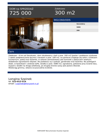 Załakowo DOM na SPRZEDAŻ 300 m2 725 000 902/260/ODS Secondary 5080 200 Opis Załakowo - 6 km od Sierakowic, dom zbudowany z bali o pow. 200 m2 [parter i poddasze użytkowe ] całość podpiwniczona łącznie z tarasem o pow. 100 m2, na parterze znajduje się salon z aneksem kuchennym, pokój oraz łazienka, w salonie zamontowany jest kominek z płaszczem wodnym, dodatkowo ogrzewanie olejowe. Na poddaszu są 3 pokoje, garderoba oraz łazienka. Na podlogach deski, w łazienkach i aneksie kafle, działka o pow. 5080 m2, ogrodzona, położona przy ścianie lasu, wyjazd z działki na drogę asfaltową, po drugiej stronie szosy jest jezioro Okonek. Wodociąg gminny, własna oczyszczalnia ścieków. Longina Szpinek tel. 513-012-514 email: [email protected] HORYZONT Nieruchomości Krystian Szpinek Powered by TCPDF (www.tcpdf.org)