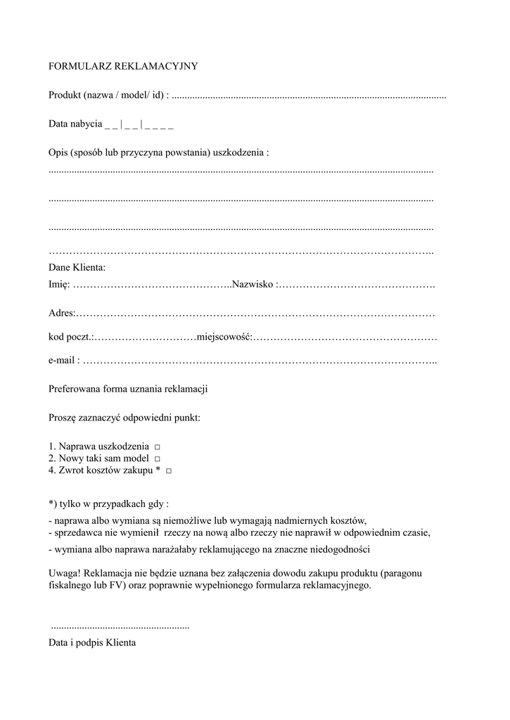 FORMULARZ REKLAMACYJNY Produkt (nazwa / model/ id) : ........................................................................................................... Data nabycia _ _ | _ _ | _ _ _ _ Opis (sposób lub przyczyna powstania) uszkodzenia : ...................................................................................................................................................... ...................................................................................................................................................... ...................................................................................................................................................... ………………………………………………………………………………………………….. Dane Klienta: Imię: ………………………………………..Nazwisko :………………………………………. Adres:…………………………………………………………………………………………… kod poczt.:…………………………miejscowość:……………………………………………… e-mail : ………………………………………………………………………………………….. Preferowana forma uznania reklamacji Proszę zaznaczyć odpowiedni punkt: 1. Naprawa uszkodzenia □ 2. Nowy taki sam model □ 4. Zwrot kosztów zakupu * □ *) tylko w przypadkach gdy : - naprawa albo wymiana są niemożliwe lub wymagają nadmiernych kosztów, - sprzedawca nie wymienił rzeczy na nową albo rzeczy nie naprawił w odpowiednim czasie, - wymiana albo naprawa narażałaby reklamującego na znaczne niedogodności Uwaga! Reklamacja nie będzie uznana bez załączenia dowodu zakupu produktu (paragonu fiskalnego lub FV) oraz poprawnie wypełnionego formularza reklamacyjnego. ...................................................... Data i podpis Klienta ROZPATRZENIE REKLAMACJI Decyzja Reklamacja zostaje rozpatrzona: pozytywnie* / negatywnie * *) niepotrzebne skreślić ……...…………………………. Data i podpis obsługi