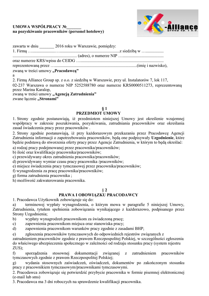 UMOWA WSPÓŁPRACY №_______ na pozyskiwanie pracowników (personel hotelowy) zawarta w dniu _______ 2016 roku w Warszawie, pomiędzy: 1. Firmą …......................….........................................................z siedzibą w …................. ............................................................. (adres), o numerze NIP …....................................... oraz numerze KRS/wpisu do CEIDG …............................................................................... reprezentowaną przez …..............................................................................(imię i nazwisko), zwaną w treści umowy „Pracodawcą” a 2. Firmą Alliance Group sp. z o.o. z siedzibą w Warszawie, przy ul. Instalatorów 7, lok 117, 02-237 Warszawa o numerze NIP 5252588780 oraz numerze KRS0000511273, reprezentowaną przez Marina Karalop, zwaną w treści umowy „Agencją Zatrudnienia” zwane łącznie „Stronami” §1 PRZEDMIOT UMOWY 1. Strony zgodnie postanawiają, iż przedmiotem niniejszej Umowy jest określenie wzajemnej współpracy w zakresie poszukiwania, pozyskiwania, zatrudniania pracowników oraz określania zasad świadczenia pracy przez pracowników . 2. Strony zgodnie postanawiają, iż przy każdorazowym przekazaniu przez Pracodawcę Agencji Zatrudnienia informacji o zapotrzebowaniu pracowników, będą one podpisywały Uzgodnienie, które będzie podstawą do stworzenia oferty pracy przez Agencje Zatrudnienia, w którym to będą określać: a) rodzaj pracy podejmowanej przez pracownika/pracowników; b) ilość oraz kwalifikacje pracownika/pracowników; c) przewidywany okres zatrudnienia pracownika/pracowników; d) przewidywany wymiar czasu pracy pracownika /pracowników; e) miejsce świadczenia pracy tymczasowej przez pracownika/pracowników; f) wynagrodzenia za pracę pracownika/pracowników; g) forma zatrudnienia pracownika ; h) możliwość zakwaterowania pracownika. §2 PRAWA I OBOWIĄZKU PRACODAWCY 1. Pracodawca Użytkownik zobowiązuje się do: a) terminowej wypłaty wynagrodzenia, o którym mowa w paragrafie 5 niniejszej Umowy, Zatrudnienia, tytułem spełnienia zobowiązania wynikającego z każdorazowo, podpisanego przez Strony Uzgodnienia; b) wypłaty wynagrodzeń pracownikom za świadczoną pracę; c) zapewnienia pracownikom miejsca oraz stanowiska pracy; d) zapewnienia pracownikom warunków pracy zgodnie z zasadami BHP; e) zgłoszenia pracowników tymczasowych do odpowiednich rejestrów związanych z zatrudnieniem pracowników zgodnie z prawem Rzeczpospolitej Polskiej, w szczególności zgłoszenia do właściwego ubezpieczenia społecznego w zależności od rodzaju stosunku pracy (system rejestru ZUS); f) sporządzenia stosownej dokumentacji związanej z zatrudnieniem pracowników tymczasowych zgodnie z prawem Rzeczpospolitej Polskiej; g) wydania stosownych zaświadczeń, oświadczeń, dokumentów po zakończonym stosunku pracy z pracownikiem tymczasowym/pracownikami tymczasowymi. 2. Pracodawca zobowiązuje się potwierdzić przybycie pracownika w formie pisemnej elektronicznej (e-mail lub sms) 3. Pracodawca ma 3 dni roboczych na sprawdzenie kwalifikacji pracownika. 1. a) b) c) d) §3 PRAWA I OBOWIĄZKI AGENCJI ZATRUDNIENIA Agencja zatrudnienia zobowiązuje się do: dostarczenia pracowników zgodnie z podpisanym przez Strony Uzgodnieniem; sporządzenia oraz dostarczenia Pracodawcy stosownej dokumentacji pracowników tymczasowych w języku polskim, zawierających wszelkie dane osobowe oraz informacje o pracownikach, jak również potwierdzających kwalifikacje pracowników; udzielenie wszelkich informacyj związanych z formalnościami zatrudnienia pracowników na terenie Rzeczpospolitej Polski; okazać pomoc w organizacji, bądź organizować przejazd kandydata na miejsce zatrudnienia. §4 WYNAGRODZENIE 1. Strony zgodnie postanawiają, iż Pracodawca za wykonane przez Agencję Zatrudnienia zlecenie, wynikające z Uzgodnienia, zapłaci Agencji Zatrudnienia wynagrodzenie. 2. Strony zgodnie postanawiają, iż wysokość wynagrodzenia o którym mowa w punkcie 1 niniejszego paragrafu, ustala się w wysokości 250 zł + VAT (słownie: dwieście pięćdziesiąt złotych plus VAT) płatne jednorazowo za każdego pozyskanego pracownika, z uwzględnieniem p.3 §2 3. Strony zgodnie postanawiają, iż po każdorazowo wykonanym zadaniu wynikającym z Uzgodnienia , Agencja Zatrudnienia będzie wystawiała fakturę VAT. 4. Wynagrodzenie o którym mowa w punkcie 1 niniejszego paragrafu, płatne będzie na rachunek bankowy: Bank Zachodni WBK 21 1090 2590 0000 0001 2964 8558 ALLIANCE GROUP Sp. z o.o. ul.Instalatorów 7 lok 117, 02-237 Warszawa §5 CZAS TRWANIA UMOWY I WARUNKI ROZWIĄZANIA UMOWY 1. Strony zgodnie postanawiają, iż Umowa niniejsza zostaje zawarta na czas nieokreślony. 2. Strony zgodnie postanawiają, iż każdej ze Stron przysługuje prawo wypowiedzenia niniejszej Umowy z zachowaniem 1 – miesięcznego (słownie: jednomiesięcznego) terminu wypowiedzenia, ze skutkiem na koniec miesiąca. 3. Strony zgodnie postanawiają, iż wypowiedzenie winno nastąpić w formie pisemnej, doręczone drugiej Stronie listem poleconym za potwierdzeniem odbioru lub pisemnym potwierdzeniem przez Stronę na dokumencie wypowiedzenia, iż wypowiedzenie otrzymała. 4. Umowę niniejszą sporządzono w dwóch jednobrzmiących egzemplarzach po jednym dla każdej ze Stron. 5. Strony niniejszej umowy, zgodnie postanawiają, iż wszelkie zmiany wymagają formy pisemnej pod rygorem nieważności. 6. Strony ustalają możliwość uszczegółowienia niniejszej Umowy poprzez spisanie odrębnego Uzgodnienia przy realizacji określonych zadań. §6 PRAWO I JURYSDYKCJA 1. Strony niniejszej Umowy zgodnie postanawiają, ze wszelkie spory mogące wyniknąć na tle wykonania przedmiotu niniejszej Umowy rozstrzygnięte będą przez sąd właściwy dla miejsca zakładu głównego Agencji Pracy Tymczasowej. 2. Strony niniejszej Umowy zgodnie postanawiają, że w sprawach n