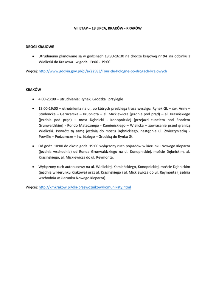 VII ETAP – 18 LIPCA, KRAKÓW - KRAKÓW DROGI KRAJOWE Utrudnienia planowane są w godzinach 13:30-16:30 na drodze krajowej nr 94 na odcinku z Wieliczki do Krakowa w godz. 13:00 - 19:00 Więcej: http://www.gddkia.gov.pl/pl/a/22583/Tour-de-Pologne-po-drogach-krajowych KRAKÓW 4:00-23:00 – utrudnienia: Rynek, Grodzka i przyległe 13:00-19:00 – utrudnienia na ul, po których przebiega trasa wyścigu: Rynek Gł. – św. Anny – Studencka – Garncarska – Krupnicza – al. Mickiewicza (jezdnia pod prąd) – al. Krasińskiego (jezdnia pod prąd) – most Dębnicki - Konopnickiej (przejazd tunelem pod Rondem Grunwaldzkim) - Rondo Matecznego - Kamieńskiego – Wielicka – zawracanie przed granicą Wieliczki. Powrót: tą samą jezdnią do mostu Dębnickiego, następnie ul. Zwierzyniecką Powiśle – Podzamcze – św. Idziego – Grodzką do Rynku Gł. Od godz. 10:00 do około godz. 19:00 wyłączony ruch pojazdów w kierunku Nowego Kleparza (jezdnia wschodnia) od Ronda Grunwaldzkiego na ul. Konopnickiej, moście Dębnickim, al. Krasińskiego, al. Mickiewicza do ul. Reymonta. Wyłączony ruch autobusowy na ul. Wielickiej, Kamieńskiego, Konopnickiej, moście Dębnickim (jezdnia w kierunku Krakowa) oraz al. Krasińskiego i al. Mickiewicza do ul. Reymonta (jezdnia wschodnia w kierunku Nowego Kleparza). Więcej: http://kmkrakow.pl/dla-przewoznikow/komunikaty.html