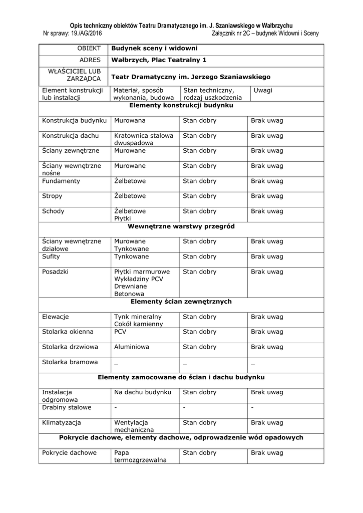 Opis techniczny obiektów Teatru Dramatycznego im. J. Szaniawskiego w Wałbrzychu Nr sprawy: 19./AG/2016 Załącznik nr 2C – budynek Widowni i Sceny OBIEKT ADRES WŁAŚCICIEL LUB ZARZĄDCA Budynek sceny i widowni Wałbrzych, Plac Teatralny 1 Teatr Dramatyczny im. Jerzego Szaniawskiego Element konstrukcji lub instalacji Materiał, sposób Stan techniczny, wykonania, budowa rodzaj uszkodzenia Elementy konstrukcji budynku Konstrukcja budynku Murowana Stan dobry Brak uwag Konstrukcja dachu Kratownica stalowa dwuspadowa Murowane Stan dobry Brak uwag Stan dobry Brak uwag Ściany wewnętrzne nośne Fundamenty Murowane Stan dobry Brak uwag Żelbetowe Stan dobry Brak uwag Stropy Żelbetowe Stan dobry Brak uwag Schody Żelbetowe Stan dobry Płytki Wewnętrzne warstwy przegród Brak uwag Ściany wewnętrzne działowe Sufity Murowane Tynkowane Tynkowane Stan dobry Brak uwag Stan dobry Brak uwag Posadzki Płytki marmurowe Stan dobry Wykładziny PCV Drewniane Betonowa Elementy ścian zewnętrznych Brak uwag Elewacje Stan dobry Brak uwag Stolarka okienna Tynk mineralny Cokół kamienny PCV Stan dobry Brak uwag Stolarka drzwiowa Aluminiowa Stan dobry Brak uwag Stolarka bramowa _ _ _ Ściany zewnętrzne Uwagi Elementy zamocowane do ścian i dachu budynku Instalacja odgromowa Drabiny stalowe Na dachu budynku Stan dobry Brak uwag - - - Klimatyzacja Wentylacja Stan dobry Brak uwag mechaniczna Pokrycie dachowe, elementy dachowe, odprowadzenie wód opadowych Pokrycie dachowe Papa termozgrzewalna Stan dobry Brak uwag Opis techniczny obiektów Teatru Dramatycznego im. J. Szaniawskiego w Wałbrzychu Nr sprawy: 19./AG/2016 Załącznik nr 2C – budynek Widowni i Sceny Rynny i rury spustowe Obróbki blacharskie Stalowe Stan dobry – ocynkowane Stalowe Stan dobry ocynkowane Instalacja centralnego ogrzewania Brak uwag Kotły, węzły cieplne Węzeł CO Stan dobry Brak uwag Grzejniki Stal Stan dobry Brak uwag Rury Stal Stan dobry Brak uwag Inne urządzenia grzewcze Źródło ciepłej wody _ _ _ Węzeł CO Stan dobry Brak uwag Przewody ciepłej wody Stal Stan dobry Brak uwag Brak uwag Instalacja gazowa Przewody - - - Zabezpieczenia przeciwpożarowe budynku Hydranty Wewnętrzne Stan dobry Brak uwag Sprzęt ppoż. Klapy dymowe ROP Drogi ewakuacyjne Gaśnice Tak Jest Stan dobry Stan dobry Stan dobry Brak uwag Brak uwag Brak uwag Ochrona środowiska Kanalizacja deszczowa Kanalizacja ściekowa Jest Stan dobry Brak uwag Jest Stan dobry Brak uwag Przewody kominowe Przewody spalinowe/dymowe Przewody wentylacyjne _ _ _ Murowane, KO Stan dobry Brak uwag Estetyka otoczenia Estetyka otoczenia Kostka granitowa Stan dobry Brak uwag Zieleń - - - Dojścia opaski przy budynku Chodnik ogólnodostępny Stan dobry Brak uwag Ogrodzenie - - -