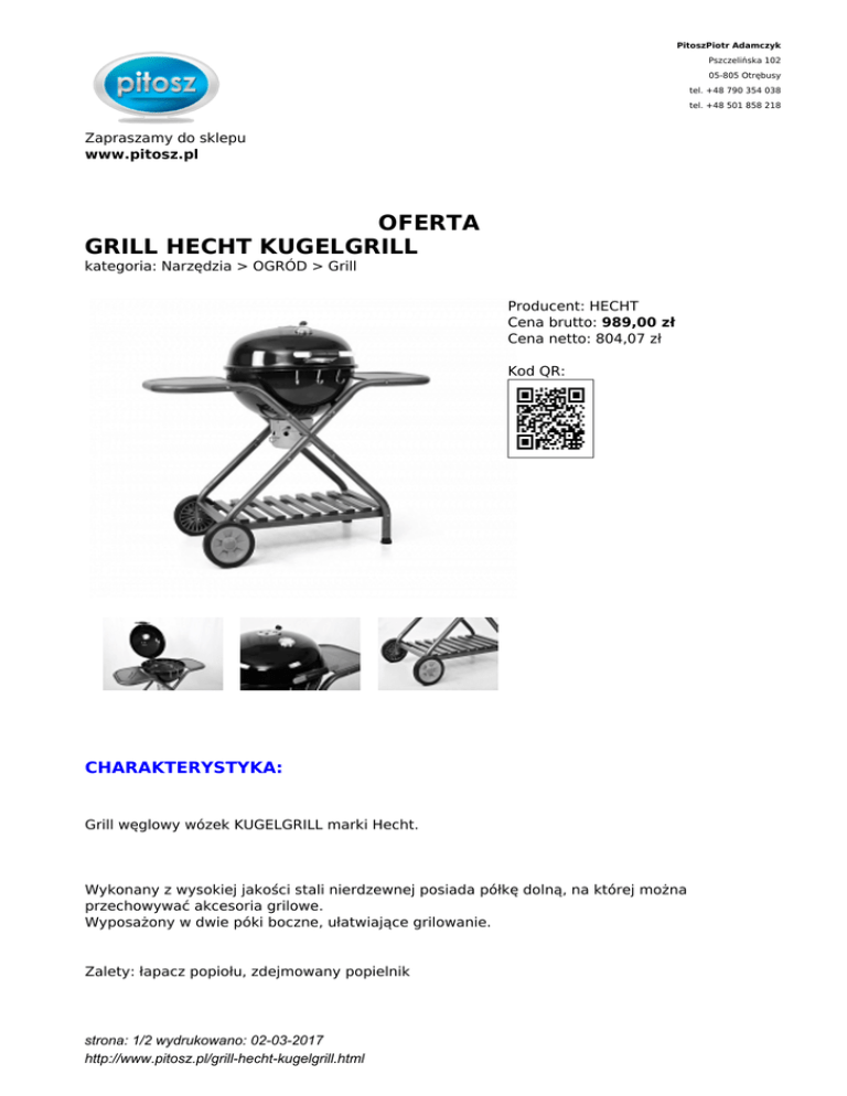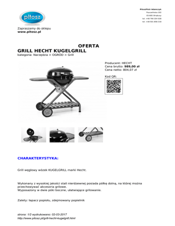 PitoszPiotr Adamczyk Pszczelińska 102 05-805 Otrębusy tel. +48 790 354 038 tel. +48 501 858 218 Zapraszamy do sklepu www.pitosz.pl OFERTA GRILL HECHT KUGELGRILL kategoria: Narzędzia > OGRÓD > Grill Producent: HECHT Cena brutto: 989,00 zł Cena netto: 804,07 zł Kod QR: CHARAKTERYSTYKA: Grill węglowy wózek KUGELGRILL marki Hecht. Wykonany z wysokiej jakości stali nierdzewnej posiada półkę dolną, na której można przechowywać akcesoria grilowe. Wyposażony w dwie póki boczne, ułatwiające grilowanie. Zalety: łapacz popiołu, zdejmowany popielnik strona: 1/2 wydrukowano: 02-03-2017 http://www.pitosz.pl/grill-hecht-kugelgrill.html DANE TECHNICZNE: - Plastikowe koła dla ułatwienia transportu - Rozmiar techniczne: 116 x 60 x 98 cm strona: 2/2 wydrukowano: 02-03-2017 http://www.pitosz.pl/grill-hecht-kugelgrill.html