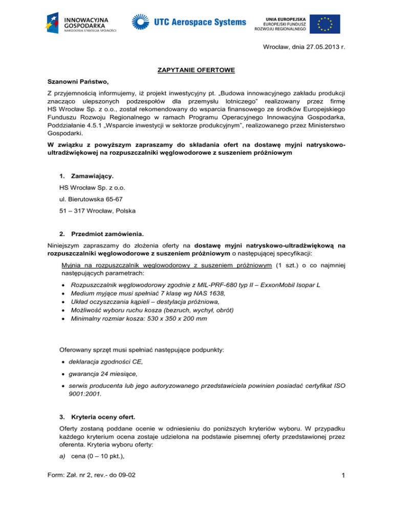 Wrocław, dnia 27.05.2013 r. ZAPYTANIE OFERTOWE Szanowni Państwo, Z przyjemnością informujemy, iż projekt inwestycyjny pt. „Budowa innowacyjnego zakładu produkcji znacząco ulepszonych podzespołów dla przemysłu lotniczego” realizowany przez firmę HS Wrocław Sp. z o.o., został rekomendowany do wsparcia finansowego ze środków Europejskiego Funduszu Rozwoju Regionalnego w ramach Programu Operacyjnego Innowacyjna Gospodarka, Poddziałanie 4.5.1 „Wsparcie inwestycji w sektorze produkcyjnym”, realizowanego przez Ministerstwo Gospodarki. W związku z powyższym zapraszamy do składania ofert na dostawę myjni natryskowoultradźwiękowej na rozpuszczalniki węglowodorowe z suszeniem próżniowym 1. Zamawiający. HS Wrocław Sp. z o.o. ul. Bierutowska 65-67 51 – 317 Wrocław, Polska 2. Przedmiot zamówienia. Niniejszym zapraszamy do złożenia oferty na dostawę myjni natryskowo-ultradźwiękową na rozpuszczalniki węglowodorowe z suszeniem próżniowym o następującej specyfikacji: Myjnia na rozpuszczalnik węglowodorowy z suszeniem próżniowym (1 szt.) o co najmniej następujących parametrach: Rozpuszczalnik węglowodorowy zgodnie z MIL-PRF-680 typ II – ExxonMobil Isopar L Medium myjące musi spełniać 7 klasę wg NAS 1638, Układ oczyszczania kąpieli – destylacja próżniowa, Możliwość wyboru ruchu kosza (bezruch, wychył, obrót) Minimalny rozmiar kosza: 530 x 350 x 200 mm Oferowany sprzęt musi spełniać następujące podpunkty: deklaracja zgodności CE, gwarancja 24 miesiące, serwis producenta lub jego autoryzowanego przedstawiciela powinien posiadać certyfikat ISO 9001:2001. 3. Kryteria oceny ofert. Oferty zostaną poddane ocenie w odniesieniu do poniższych kryteriów wyboru. W przypadku każdego kryterium ocena zostaje udzielona na podstawie pisemnej oferty przedstawionej przez oferenta. Kryteria wyboru oferty: a) cena (0 – 10 pkt.), Form: Zał. nr 2, rev.- do 09-02 1 b) warunki płatności (0 - 10 pkt.), c) Parametry maszyny (np. poziom energochłonności, filtracja, itp) (0 - 10 pkt.), d) doświadczenie w realizacji zamówień o takich samych lub zbliżonych parametrach (ocena będzie dokonywana na podstawie dołączonych do oferty referencji) (0 - 10 pkt.), e) sposób zapewnienia obsługi posprzedażowej (np. maksymalny czas oczekiwania na naprawę, zapewnienie dodatkowego wsparcia) (0 - 10 pkt.). 4. Sposób przygotowania oferty. Złożona oferta powinna zawierać co najmniej: a) nazwę i adres oferenta, b) być sporządzona na papierze firmowym oferenta lub opatrzona pieczątką firmową, c) posiadać datę sporządzenia, d) być podpisana przez przedstawiciela oferenta należycie upełnomocnionego do zaciągania zobowiązań w imieniu oferenta. Oferta powinna być ważna przynajmniej przez okres 6 miesięcy (oferta musi być ważna na dzień złożenia zamówienia). Nadmienia się, iż zgodnie ze standardami Grupy Kapitałowej UTC, do której należy HS Wrocław Sp. z o.o., zakupy oraz współpraca z podwykonawcami przebiegają w oparciu o kryteria ochrony środowiska i zasady społecznej odpowiedzialności biznesu. Potencjalni kooperanci powinni zapoznać się z polityką wyboru dostawców realizowaną przez HS Wrocław (stanowiącą załącznik do zapytania ofertowego) oraz zawrzeć w ofercie poniższe oświadczenie: „Oświadczam, że zapoznałem się z zasadami „Polityki wyboru wykonawców i dostawców realizowaną przez HS Wrocław Sp. z o.o,”, która stanowi załącznik do zapytania ofertowego.” 5. Termin realizacji zamówienia. Oczekuje się realizacji zamówienia najpóźniej do dnia 01.09.2013 . 6. Forma wynagrodzenia oraz termin płatności. Wynagrodzenie za dostawę wyposażenia zostanie uregulowane w formie przelewu bankowego na konto podane przez Oferenta. Sugerowany termin płatności to 60 dni po wystawieniu faktury. 7. Koszt dostawy. Koszt dostawy urządzeń leży po stronie Dostawcy. 8. Sposób i termin składania ofert Uprasza się o dostarczenie oferty (w języku polskim lub angielskim) w terminie do dnia 07.06.2013 do godz. 12:00 w wersji elektronicznej na adresy email pracowników Zamawiającego podane poniżej, ew. listem poleconym, poprzez firmę kurierską lub osobiście w siedzibie Spółki na Sekretariacie Głównym. W przypadku braku zainteresowania z Państwa strony udziałem w postępowaniu ofertowym uprzejmie prosimy o potwierdzenie zaistniałego faktu. Form: Zał. nr 2, rev.- do 09-02 2 Informuje się nadto, iż w przypadku jakichkolwiek wątpliwości językiem rozstrzygającym jest język polski. Wyjaśnień dotyczących zapytania ofertowego udzielają: Jarosław Hoffmann, Dział Zakupów, tel. 781 500 222, [email protected] Michał Szylar, Dział Technologiczny, tel. 781 502 966, [email protected] Mirosław Wojcik, Dział Technologiczny, tel. 601 766 425, [email protected] Form: Zał. nr 2, rev.- do 09-02 3