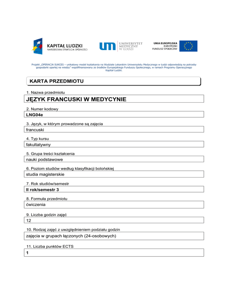Projekt „OPERACJA SUKCES – unikatowy model kształcenia na Wydziale Lekarskim Uniwersytetu Medycznego w Łodzi odpowiedzią na potrzeby gospodarki opartej na wiedzy” współfinansowany ze środków Europejskiego Funduszu Społecznego, w ramach Programu Operacyjnego Kapitał Ludzki. KARTA PRZEDMIOTU 1. Nazwa przedmiotu JĘZYK FRANCUSKI W MEDYCYNIE 2. Numer kodowy LNG04e 3. Język, w którym prowadzone są zajęcia francuski 4. Typ kursu fakultatywny 5. Grupa treści kształcenia nauki podstawowe 6. Poziom studiów według klasyfikacji bolońskiej studia magisterskie 7. Rok studiów/semestr II rok/semestr 3 8. Formuła przedmiotu ćwiczenia 9. Liczba godzin zajęć 12 10. Rodzaj zajęć z uwzględnieniem podziału godzin zajęcia w grupach łączonych (24-osobowych) 11. Liczba punktów ECTS 1 12. Jednostka dydaktyczna prowadząca przedmiot Centrum Nauczania Języków Obcych UM w Łodzi 13. Imię i nazwisko osoby egzaminującej lub zaliczającej przedmiot mgr E. Barczyk 14. Osoby prowadzące zajęcia mgr E. Barczyk 15. Wymagania wstępne i wymagania równoległe znajomość języka francuskiego na poziomie średnim 16. Cele i założenia nauczania przedmiotu Pobudzenie motywacji do nauki języka francuskiego. Rozwijanie kompetencji komunikacyjnych w kontekście pacjent-lekarz, lekarz-pacjent, lekarz-lekarz. Motywowanie do samodzielnego rozszerzania słownictwa specjalistycznego. Przyswajanie materiału w sposób bierny – rozumienie prostych tekstów medycznych i aktywny – dialog z pacjentem. 17. Metody dydaktyczne łączone i przeplatane: komunikacja werbalna, materiały pisane i przekaz audio 18. Wykaz literatury podstawowej i uzupełniającej - Glanowska J, Janicka S: Pharmacie…. Pharmacien… étudiant en Pharmacie, Państwowy Zakład Wydawnictw Lekarskich, Warszawa 1983 – wybrane teksty - Mourlbon-Dallies F, Tolas J. santé-médecine.com, CLE INTERNATIONAL, Paris 2004 - Anselme B: Le corp humain, NATHAN, Paris 1998 - Materiały autorskie 19. Forma i warunki zaliczenia przedmiotu aktywne uczestnictwo w zajęciach 20. Treści merytoryczne budujące wiedzę - medyczne słownictwo i zwroty w ścisłym związku z przyszłym zawodem, - styl języka naukowego, - język a kontekście z pacjentem 21. Efekty kształcenia – umiejętności i kompetencje Po ukończonym kursie student powinien: - mieć opanowane słownictwo medyczne przerabiane na zajęciach - potrafić poprawnie czytać proste teksty medyczne i jej rozumieć - potrafić rozmawiać z pacjentem (zebrać wywiad) - mieć podstawową wiedzę na temat systemu służby zdrowia we Francji 22. Informacje dodatkowe dostępne są pod adresem [email protected]