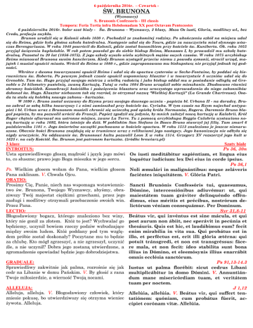 6 października 2016r. – Czwartek - ŚW. BRUNONA (Wyznawcy) S. Brunonis Confessoris - III classis Tempora: Feria Tertia infra Hebdomadam XX post Octavam Pentecostes 6 października 2016r. kolor szat biały - Św. Brunona – Wyznawcy, 3 klasy, Msza Os iusti, Gloria, modlitwy wł., bez Credo, prefacja zwykła. Brunon urodził się w Kolonii około 1030 r. Pochodził ze znakomitej rodziny. Po ukończeniu szkół na miejscu udał się do Reims, gdzie była głośna szkoła katedralna. Następnie udał się do Tours, gdzie za nauczyciela miał słynnego wówczas Berengariusza. W roku 1048 powrócił do Kolonii, gdzie został kanonikiem przy kościele św. Kuniberta. Ok. roku 1055 przyjął święcenia kapłańskie. W rok potem powołał go do siebie biskup Reims, Manasses I, by prowadził mu szkołę katedralną. Pozostał tu 20 lat (1056-1075). Z jego szkoły wyszło wielu wybitnych mężów owych czasów. W roku 1075 arcybiskup Reims mianował Brunona swoim kanclerzem. Kiedy Brunon wystąpił przeciw niemu z powodu symonii, stracił urząd, majątek i musiał opuścić miasto. Wrócił do Reims w 1080 r., gdzie zaproponowano mu biskupstwo; nie przyjął jednak tej godności. Wkrótce z dwoma towarzyszami opuścił Reims i udał się do opactwa cystersów w Seche-Fontaine, by poddać się kierownictwu św. Roberta. Po pewnym jednak czasie opuścił wspomniany klasztor i w towarzystwie 8 uczniów udał się do Grenoble. Tam św. Hugo przyjął swojego mistrza z wielką radością i jako biskup oddał mu w posiadanie odległą od Grenoble o 24 kilometry pustelnię, zwaną Kartuzją. Tutaj w roku 1084 Bruno urządził sobie mieszkanie. Zbudowano również skromny kościółek. Konsekracji kościółka i poświęcenia klasztoru oraz uroczystego wprowadzenia do niego zakonników dokonał św. Hugo. Klasztor niebawem tak się rozrósł, że otrzymał nazwę "Wielkiej Kartuzji" (La Grande Chartreuse). Osada ta stała się kolebką nowego zakonu - kartuzów. W 1090 r. Bruno został wezwany do Rzymu przez swojego dawnego ucznia - papieża bł. Urbana II - na doradcę. Bruno zabrał ze sobą kilku towarzyszy i z nimi zamieszkał przy kościele św. Cyriaka. W tym czasie na Rzym najechał antypapież i bł. Urban wraz z Brunonem musieli chronić się ucieczką pod opiekę króla Normanów, Rogera. Daremnie Bruno błagał papieża, by mu pozwolił wrócić do Francji. Papież zgodził się jedynie, by mnich założył nową kartuzję w Kalabrii. Król Roger chętnie ofiarował mu ustronne miejsce, zwane La Torre. Tu z pomocą arcybiskupa Reggio Calabria wystawiono nową kartuzję w roku 1092, która istnieje do dziś. W pobliskim San Stefano in Bosco Bruno stworzył jej filię. Tam zmarł 6 października 1101 r. Jego śmiertelne szczątki pochowano w kościele opactwa. W roku 1513 znaleziono je jeszcze nienaruszone. Obecnie kości Brunona znajdują się w trumience wraz z relikwiami jego następcy. Jego kanonizacja nie odbyła się nigdy uroczyście. Na oddawanie św. Brunonowi kultu pozwolił Leon X w roku 1514. Grzegorz XV rozszerzył jego kult w 1623 r. na cały Kościół. Św. Brunon jest patronem kartuzów. (źródło: brewiarz.pl) 3 klasy Szaty białe INTROITUS: Ps 36, 30n Usta sprawiedliwego głoszą mądrość i język jego mówi Os iusti meditábitur sapiéntiam, et lingua eius to, co słuszne; prawo jego Boga mieszka w jego sercu. loquétur iudícium: lex Dei eius in corde ipsíus. Ps 36,1 Ps. Wielkim głosem wołam do Pana, wielkim głosem Noli æmulári in malignántibus: neque zeláveris Pana zaklinam. V. Chwała Ojcu. faciéntes iniquitátem. V. Glória Patri. ORATIO: Prosimy Cię, Panie, niech nas wspomaga wstawiennic- Sancti Brunónis Confessóris tui, quaesumus, two św. Brunona, Twojego Wyznawcy, abyśmy, obra- Dómine, intercessiónibus adiuvémur: ut, qui ziwszy Twój majestat ciężkimi grzechami, przez jego maiestátem tuam gráviter delinquéndo offénzasługi i modlitwy otrzymali przebaczenie swoich win. dimus, eius méritis et précibus, nostrórum dePrzez Pana. lictórum véniam consequámur. Per Dominum. LECTIO: Syr 31,8-11 Błogosławiony bogacz, którego znaleziono bez winy, Beátus vir, qui invéntus est sine mácula, et qui który nie gonił za złotem. Któż to jest? Wychwalać go post aurum non ábiit, nec sperávit in pecúnia et będziemy, uczynił bowiem rzeczy podziw wzbudzające thesáuris. Quis est hic, et laudábimus eum? fecit między swoim ludem. Któż poddany pod tym wzglę- enim mirabília in vita sua. Qui probátus est in dem próbie został doskonały? Poczytane mu to będzie illo, et perféctus est, erit illi glória ætérna: qui za chlubę. Kto mógł zgrzeszyć, a nie zgrzeszył, uczynić potuit tránsgredi, et non est transgréssus: fáceźle, a nie uczynił? Dobra jego zostaną utwierdzone, a re mala, et non fecit: ídeo stabilíta sunt bona zgromadzenie opowiadać będzie jego dobrodziejstwa. illíus in Dómino, et eleemósynis illíus enarrábit omnis ecclésia sanctórum. GRADUALE: Ps 91,13-14.3 Sprawiedliwy zakwitnie jak palma, rozrośnie się jak Iustus ut palma florébit: sicut cedrus Líbani cedr na Libanie w domu Pańskim. V. By głosić z rana multiplicábitur in domo Dómini. V. AnnuntiánTwoje miłosierdzie, a wierność Twoją nocami. dum mane misericórdiam tuam, et veritátem tuam per noctem. ALLELUJA: J 1,12 Alleluja, alleluja. V. Błogosławiony człowiek, który Allelúia, allelúia. V. Beátus vir, qui suffert tenzniesie pokusę, bo utwierdziwszy się otrzyma wieniec tatiónem: quóniam, cum probátus fúerit, acżywota. Alleluja. cípiet corónam vitæ. Allelúia. EVANGELIUM: W owym czasie mówił Jezus uczniom swoim: Niech będą przepasane biodra wasze i zapalone pochodnie! A wy [bądźcie] podobni do ludzi, oczekujących swego pana, kiedy z uczty weselnej powróci, aby mu zaraz otworzyć, gdy nadejdzie i zakołacze. Szczęśliwi owi słudzy, których pan zastanie czuwających, gdy nadejdzie. Zaprawdę, powiadam wam: Przepasz
