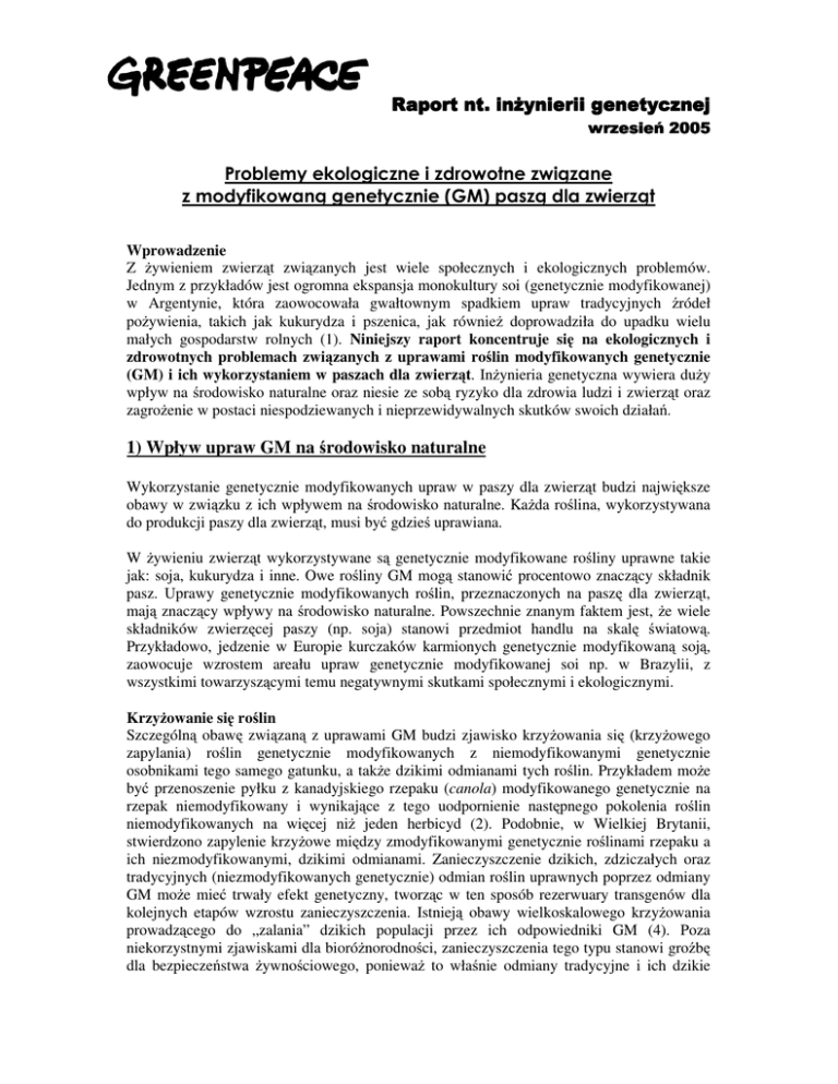 Raport nt. inżynierii genetycznej wrzesień 2005 Problemy ekologiczne i zdrowotne związane z modyfikowaną genetycznie (GM) paszą dla zwierząt Wprowadzenie Z żywieniem zwierząt związanych jest wiele społecznych i ekologicznych problemów. Jednym z przykładów jest ogromna ekspansja monokultury soi (genetycznie modyfikowanej) w Argentynie, która zaowocowała gwałtownym spadkiem upraw tradycyjnych źródeł pożywienia, takich jak kukurydza i pszenica, jak również doprowadziła do upadku wielu małych gospodarstw rolnych (1). Niniejszy raport koncentruje się na ekologicznych i zdrowotnych problemach związanych z uprawami roślin modyfikowanych genetycznie (GM) i ich wykorzystaniem w paszach dla zwierząt. Inżynieria genetyczna wywiera duży wpływ na środowisko naturalne oraz niesie ze sobą ryzyko dla zdrowia ludzi i zwierząt oraz zagrożenie w postaci niespodziewanych i nieprzewidywalnych skutków swoich działań. 1) Wpływ upraw GM na środowisko naturalne Wykorzystanie genetycznie modyfikowanych upraw w paszy dla zwierząt budzi największe obawy w związku z ich wpływem na środowisko naturalne. Każda roślina, wykorzystywana do produkcji paszy dla zwierząt, musi być gdzieś uprawiana. W żywieniu zwierząt wykorzystywane są genetycznie modyfikowane rośliny uprawne takie jak: soja, kukurydza i inne. Owe rośliny GM mogą stanowić procentowo znaczący składnik pasz. Uprawy genetycznie modyfikowanych roślin, przeznaczonych na paszę dla zwierząt, mają znaczący wpływy na środowisko naturalne. Powszechnie znanym faktem jest, że wiele składników zwierzęcej paszy (np. soja) stanowi przedmiot handlu na skalę światową. Przykładowo, jedzenie w Europie kurczaków karmionych genetycznie modyfikowaną soją, zaowocuje wzrostem areału upraw genetycznie modyfikowanej soi np. w Brazylii, z wszystkimi towarzyszącymi temu negatywnymi skutkami społecznymi i ekologicznymi. Krzyżowanie się roślin Szczególną obawę związaną z uprawami GM budzi zjawisko krzyżowania się (krzyżowego zapylania) roślin genetycznie modyfikowanych z niemodyfikowanymi genetycznie osobnikami tego samego gatunku, a także dzikimi odmianami tych roślin. Przykładem może być przenoszenie pyłku z kanadyjskiego rzepaku (canola) modyfikowanego genetycznie na rzepak niemodyfikowany i wynikające z tego uodpornienie następnego pokolenia roślin niemodyfikowanych na więcej niż jeden herbicyd (2). Podobnie, w Wielkiej Brytanii, stwierdzono zapylenie krzyżowe między zmodyfikowanymi genetycznie roślinami rzepaku a ich niezmodyfikowanymi, dzikimi odmianami. Zanieczyszczenie dzikich, zdziczałych oraz tradycyjnych (niezmodyfikowanych genetycznie) odmian roślin uprawnych poprzez odmiany GM może mieć trwały efekt genetyczny, tworząc w ten sposób rezerwuary transgenów dla kolejnych etapów wzrostu zanieczyszczenia. Istnieją obawy wielkoskalowego krzyżowania prowadzącego do „zalania” dzikich populacji przez ich odpowiedniki GM (4). Poza niekorzystnymi zjawiskami dla bioróżnorodności, zanieczyszczenia tego typu stanowi groźbę dla bezpieczeństwa żywnościowego, ponieważ to właśnie odmiany tradycyjne i ich dzikie odpowiedniki zawierają nowe geny (np. odporności na suszę), które mogą zostać wykorzystane do ulepszenia istniejących upraw poprzez techniki rozmnażania konwencjonalnego. Wpływ na bioróżnorodność Do wspomnianych powyżej głównych obaw związanych z uprawami genetycznie modyfikowanych roślin, należy doliczyć kolejne, dobrze udokumentowane oddziaływania tychże na środowisko naturalne. Dotyczą one insekto- i herbicydooporności roślin GM. Do owych niekorzystnych zjawisk należą: a) rośliny GM z genem Bt, odpowiedzialnym za odporność na insekty (5): • Oddziaływanie toksyczne na organizmy spoza grupy docelowej, takie jak motyle. Udowodniono na przykład, że długoterminowa ekspozycja na działanie pyłku kukurydzy z modyfikacją Bt wykazuje działanie szkodliwe dla larw motyla Monarch w Ameryce Północnej (6). • Oddziaływanie toksyczne na owady pożyteczne. Przykładem jest niekorzystny wpływ roślin z genem Bt na złotooki zielone (7). Złotooki są pożytecznymi owadami, odgrywającymi ważną rolę w naturalnej kontroli liczebności szkodników roślin uprawnych. Oddziaływanie toksyczne roślin z genem Bt ma w tym przypadku charakter pośredni – złotooki zjadają szkodniki, które z kolei wcześniej pożywiały się roślinami GM. • Pojawienie się odporności na insektycydy, skutkujące wzrostem ich zużycia. Dla przykładu, w USA istnieje szereg wymagań co do konieczności utrzymywania obszarów roślin wolnych od modyfikacji Bt, w celu spowolnienia procesu uodpornienia insektów na toksynę Bt. Ostoje tego typu mogą nie sprawdzić się na małoobszarowych gospodarstw Europy i innych rejonów, gdzie brak wielkich farm, takich jak w USA. Problem ten pojawił się w przypadku bawełny z genem Bt w Indiach (8). • Niekorzystny wpływ na ekosystem glebowy. Korzenie roślin z genem Bt wydzielają toksynę do gleby (9). Aktywną toksynę Bt zawierają również, pozostawiane na polach, resztki pożniwne (10). Toksyna Bt utrzymuje się w glebie zwłaszcza w przypadku szczególnie chłodnej zimy (11). Zwiększa to ryzyko akumulacji toksyny w glebie (12) oraz wpływa negatywnie na niegroźne organizmy glebowe i kondycję całego ekosystemu glebowego. b) uprawy odporne na herbicydy (13): • Toksyczny wpływ herbicydów na ekosystem. W przypadku herbicydu Roundup (stosowanego w uprawach Monsanto’s Roundup Ready) wykazano jego toksyczny wpływ na kijanki, powodowanie skażenia środowiska wodnego oraz obniżanie bioróżnorodności (14). Wykazano też, że jedna z odmian Roundupu stanowi potencjalne czynnik zakłócający działanie systemu endokrynnego (tzn. może ingerować w funkcjonowanie hormonów) (15). • Zanikanie chwastów, spadek ich różnorodności, a co za tym idzie spadek bioróżnorodności. Dowiedziono 