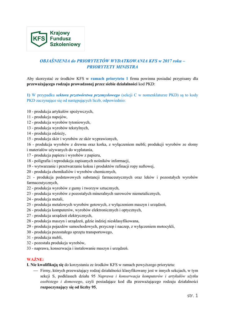 OBJAŚNIENIA do PRIORYTETÓW WYDATKOWANIA KFS w 2017 roku – PRIORYTETY MINISTRA Aby skorzystać ze środków KFS w ramach priorytetu 1 firma powinna posiadać przypisany dla przeważającego rodzaju prowadzonej przez siebie działalności kod PKD: 1) W przypadku sektora przetwórstwa przemysłowego (sekcji C w nomenklaturze PKD) są to kody PKD zaczynające się od następujących liczb, odpowiednio: 10 - produkcja artykułów spożywczych, 11 - produkcja napojów, 12 - produkcja wyrobów tytoniowych, 13 - produkcja wyrobów tekstylnych, 14 - produkcja odzieży, 15 - produkcja skór i wyrobów ze skór wyprawionych, 16 - produkcja wyrobów z drewna oraz korka, z wyłączeniem mebli; produkcji wyrobów ze słomy i materiałów używanych do wyplatania, 17 - produkcja papieru i wyrobów z papieru, 18 - poligrafia i reprodukcja zapisanych nośników informacji, 19 - wytwarzanie i przetwarzanie koksu i produktów rafinacji ropy naftowej, 20 - produkcja chemikaliów i wyrobów chemicznych, 21 - produkcja podstawowych substancji farmaceutycznych oraz leków i pozostałych wyrobów farmaceutycznych, 22 - produkcja wyrobów z gumy i tworzyw sztucznych, 23 - produkcja wyrobów z pozostałych mineralnych surowców niemetalicznych, 24 - produkcja metali, 25 - produkcja metalowych wyrobów gotowych, z wyłączeniem maszyn i urządzeń, 26 - produkcja komputerów, wyrobów elektronicznych i optycznych, 27 - produkcja urządzeń elektrycznych, 28 - produkcja maszyn i urządzeń, gdzie indziej niesklasyfikowana, 29 - produkcja pojazdów samochodowych, przyczep i naczep, z wyłączeniem motocykli, 30 - produkcja pozostałego sprzętu transportowego, 31 - produkcja mebli, 32 - pozostała produkcja wyrobów, 33 - naprawa, konserwacja i instalowanie maszyn i urządzeń. WAŻNE: I. Nie kwalifikują się do korzystania ze środków KFS w ramach powyższego priorytetu:  Firmy, których przeważający rodzaj działalności klasyfikowany jest w innych sekcjach, w tym sekcji S, podklasach działu 95 Naprawa i konserwacja komputerów i artykułów użytku osobistego i domowego, czyli posiadające kod dla przeważającego rodzaju działalności rozpoczynający się od liczby 95, str. 1  Firmy naprawiające pojazdy samochodowe, które klasyfikowane są w sekcji G, w podklasach działu 45 Handel hurtowy i detaliczny pojazdami detalicznymi; naprawa pojazdów samochodowych, czyli posiadające kod dla przeważającego rodzaju działalności rozpoczynający się od liczby 45. II. Granice pomiędzy działalnością wytwórczą a działalnościami występującymi w innych sekcjach klasyfikacji PKD mogą być niewystarczająco ostre. Działalności klasyfikowane w sekcji C Przetwórstwo przemysłowe charakteryzują się przekształceniem surowców i materiałów w nowy wyrób. Określenie, który wyrób jest nowym wyrobem często ma charakter subiektywny i ostateczna decyzja w tej sprawie należy do powiatowego urzędu pracy. 2) W przypadku sektora transportowego i gospodarki magazynowej (sekcja H w nomenklaturze PKD) są to kody PKD rozpoczynające się od następujących liczb, odpowiednio: 49 - transport lądowy oraz transport rurociągowy, 50 - transport wodny, 51 - transport lotniczy, 52 - magazynowanie i działalność wspomagająca transport, 53 - działalność pocztowa i kurierska. UWAGI: Do tej sekcji należą przedsiębiorstwa, które prowadzą działalność związaną z przewozem osób lub towarów realizowaną przez transport kolejowy, rurociągowy, drogowy, wodny lub powietrzny, działalność wspomagającą przewozy świadczoną przez stacje, porty, dworce kolejowe, autobusowe itp. terminale w zakresie kontroli ruchu, obsługi pasażerów, bagażu i ładunków, wynajmem sprzętu transportowego z kierowcą lub załogą oraz działalność pocztową i kurierską. Wskazanie sektorów priorytetowych przy wydatkowaniu środków KFS ma przyczynić się przede wszystkim do niwelowania braków kadrowych w zawodzie kierowca samochodów ciężarowych/ciągników siodłowych. Branża transportowa wielokrotnie raportowała do MRPiPS o braku na polskim rynku ok. 30 tys. kierowców zawodowych. WAŻNE: I. Nie kwalifikują się do korzystania ze środków KFS w ramach powyższego priorytetu firmy klasyfikowane w poniższych sekcjach, działach bądź grupach, czyli z kodem dla przeważającego rodzaju działalności rozpoczynającym się od liczb, odpowiednio:  33.1 - firmy zajmujące się wykonywaniem generalnych przeglądów i napraw środków transportu, z wyłączeniem pojazdów samochodowych  42 – firmy zajmujące się budową, utrzymaniem i naprawą dróg kołowych, szynowych, portów morskich, płyt lotnisk,  45.20 – firmy zajmujące się konserwacją i naprawą pojazdów samochodowych,  77.1 i 77.3 - firmy prowadzące wynajem środków transportu bez kierowcy lub załogi. str. 2 3) W przypadku sektora opieki zdrowotnej i pomocy społecznej (sekcja Q w nomenklaturze PKD) są to kody PKD dla przeważającego rodzaju działalności zaczynające się od następujących liczb: 86 - opieka zdrowotna, 87 - pomoc społeczna z zakwaterowaniem, 88 - pomoc społeczna bez zakwaterowania. UWAGI: Sekcja ta obejmuje: opiekę zdrowotną w szpitalach lub innych placówkach, działalność fizjoterapeutyczną, działalność pogotowia ratunkowego, pomoc społeczną z zakwaterowaniem, która wymaga w pewnym stopniu opieki zdrowotnej, pomoc społeczną niewymagającą zaangażowania specjalistów w zakresie opieki medycznej. WAŻNE:  Nie powinny być finansowane ze środków KFS w 2017 roku, wzorem lat poprzednich, wymienione w art. 108 pkt 1fc ustawy o promocji zatrudnienia…. staże podyplomowe wraz z kosztem obsługi określonym w przepisach o zawodach lekarza i lekarza dentysty oraz szkolenia specjalizacyjne lekarzy i lekarzy dentystów, o których mowa w przepisach o zawodach lekarza i lekarza dentysty, a także specjalizacje pielęgniarek i położnych, o których mowa w przepisach o zawodach pielęgniarki i położnej. A