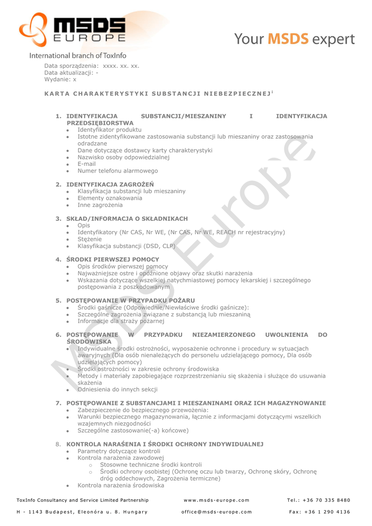 Data sporządzenia: xxxx. xx. xx. Data aktualizacji: Wydanie: x KARTA CHARAKTERYSTYKI SUBSTANCJI NIEBEZPIECZNEJ i 1. IDENTYFIKACJA SUBSTANCJI/MIESZANINY I IDENTYFIKACJA PRZEDSIĘBIORSTWA Identyfikator produktu Istotne zidentyfikowane zastosowania substancji lub mieszaniny oraz zastosowania odradzane Dane dotyczące dostawcy karty charakterystyki Nazwisko osoby odpowiedzialnej E-mail Numer telefonu alarmowego 2. IDENTYFIKACJA ZAGROŻEŃ Klasyfikacja substancji lub mieszaniny Elementy oznakowania Inne zagrożenia 3. SKŁAD/INFORMACJA O SKŁADNIKACH Opis Identyfikatory (Nr CAS, Nr WE, (Nr CAS, Nr WE, REACH nr rejestracyjny) Stężenie Klasyfikacja substancji (DSD, CLP) 4. ŚRODKI PIERWSZEJ POMOCY Opis środków pierwszej pomocy Najważniejsze ostre i opóźnione objawy oraz skutki narażenia Wskazania dotyczące wszelkiej natychmiastowej pomocy lekarskiej i szczególnego postępowania z poszkodowanym 5. POSTĘPOWANIE W PRZYPADKU POŻARU Środki gaśnicze (Odpowiednie/Niewłaściwe środki gaśnicze): Szczególne zagrożenia związane z substancją lub mieszaniną Informacje dla straży pożarnej 6. POSTĘPOWANIE W PRZYPADKU NIEZAMIERZONEGO UWOLNIENIA DO ŚRODOWISKA Indywidualne środki ostrożności, wyposażenie ochronne i procedury w sytuacjach awaryjnych (Dla osób nienależących do personelu udzielającego pomocy, Dla osób udzielających pomocy) Środki ostrożności w zakresie ochrony środowiska Metody i materiały zapobiegające rozprzestrzenianiu się skażenia i służące do usuwania skażenia Odniesienia do innych sekcji 7. POSTĘPOWANIE Z SUBSTANCJAMI I MIESZANINAMI ORAZ ICH MAGAZYNOWANIE Zabezpieczenie do bezpiecznego przewożenia: Warunki bezpiecznego magazynowania, łącznie z informacjami dotyczącymi wszelkich wzajemnych niezgodności Szczególne zastosowanie(-a) końcowe) 8. KONTROLA NARAŚENIA I ŚRODKI OCHRONY INDYWIDUALNEJ Parametry dotyczące kontroli Kontrola narażenia zawodowej o Stosowne techniczne środki kontroli o Środki ochrony osobistej (Ochronę oczu lub twarzy, Ochronę skóry, Ochronę dróg oddechowych, Zagrożenia termiczne) Kontrola narażenia środowiska ToxInfo Consultancy and Service Limited Partnership www.msds-europe.com Te l.: +36 70 335 8480 H - 1143 Budapest, Eleonóra u. 8. Hungary [email protected] Fax: +36 1 290 4136 9. WŁAŚCIWOŚCI FIZYCZNE I CHEMICZNE Informacje na temat podstawowych właściwości fizycznych i chemicznych Inne informacje znajdujące zastosowanie 10. STABILNOŚĆ I REAKTYWNOŚĆ Reaktywność Stabilność chemiczna Możliwość występowania niebezpiecznych reakcji Warunki, których należy unikać Materiały niezgodne Niebezpieczne produkty rozkładu 11. INFORMACJE TOKSYKOLOGICZNE Informacje dotyczące skutków toksykologicznych W przypadku substancji podlegających rejestracji, krótkie podsumowanie informacji uzyskanych z przeprowadzonych badań Istotne właściwości toksykologiczne substancji niebezpiecznych Informacje dotyczące prawdopodobnych dróg ekspozycji Objawy związane z właściwościami fizycznymi, chemicznymi i toksykologicznymi Opóźnione i bezpośrednie skutki, jak również trwałe skutki ekspozycji krótko i długoterminowych Interaktywne efekty Brak szczegółowych danych Inne informacje znajdujące zastosowanie 12. INFORMACJE EKOLOGICZNE Ekotoksyczność Trwałość i zdolność do rozkładu Zdolność do bioakumulacji Mobilność w glebie Wyniki oceny właściwości PBT i vPvB Inne szkodliwe skutki działania 13. POSTĘPOWANIE Z ODPADAMI Metody unieszkodliwiania odpadów o Informacje dotyczące usuwania produktu o Informacje dotyczących składowania opakowań Określa się właściwości fizyczne lub chemiczne, które mogą mieć wpływ na sposoby przetwarzania odpadów Odprowadzanie odpadów do ścieków Specjalne środki ostrożności w odniesieniu do wszelkich zalecanych sposobów unieszkodliwiania odpadów 14. INFORMACJE DOTYCZĄCE TRANSPORTU Numer UN Prawidłowa nazwa przewozowa UN Klasa(-y) zagrożenia w transporcie Materiał do pakowania Produkt niebezpieczny dla środowiska Szczególne środki ostrożności dla użytkowników Transport luzem zgodnie z załącznikiem II do konwencji MARPOL 73/78 i kodeksem IBC 15. INFORMACJE DOTYCZĄCE PRZEPISÓW PRAWNYCH Przepisy prawne dotyczące bezpieczeństwa, ochrony zdrowia i środowiska specyficzne dla substancji lub mieszaniny Ocena bezpieczeństwa chemicznego 16. INNE INFORMACJE Informacje o wersji Pełny tekst skrótów występujących w karcie charakterystyki Wykorzystana literatura/źródła Pełny tekst zwrotów R zawartych w pkt 2 i 3 Pełny tekst zwrotów H zawartych w pkt 2 i 3 Porady dotyczące szkoleń Zalecane ograniczenia stosowania (niewymagane przez prawo zalecenia dostawcy) i We would like to draw your attention that the above mentioned sample is not a complete MSDS, please obtain further information from the Regulation 453/2010/EU or ask an expert. ToxInfo Consultancy and Service Limited Partnership 2