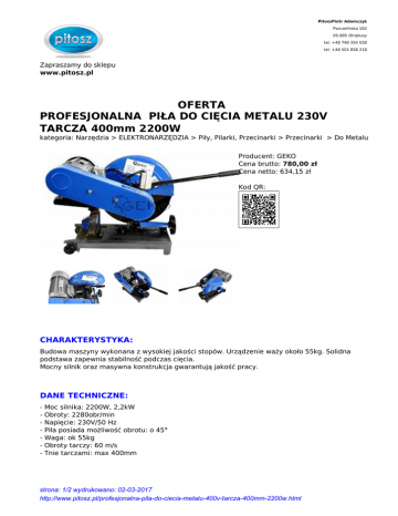 PitoszPiotr Adamczyk Pszczelińska 102 05-805 Otrębusy tel. +48 790 354 038 tel. +48 501 858 218 Zapraszamy do sklepu www.pitosz.pl OFERTA PROFESJONALNA PIŁA DO CIĘCIA METALU 230V TARCZA 400mm 2200W kategoria: Narzędzia > ELEKTRONARZĘDZIA > Piły, Pilarki, Przecinarki > Przecinarki > Do Metalu Producent: GEKO Cena brutto: 780,00 zł Cena netto: 634,15 zł Kod QR: CHARAKTERYSTYKA: Budowa maszyny wykonana z wysokiej jakości stopów. Urządzenie waży około 55kg. Solidna podstawa zapewnia stabilność podczas cięcia. Mocny silnik oraz masywna konstrukcja gwarantują jakość pracy. DANE TECHNICZNE: - Moc silnika: 2200W, 2,2kW Obroty: 2280obr/min Napięcie: 230V/50 Hz Piła posiada możliwość obrotu: o 45° Waga: ok 55kg Obroty tarczy: 60 m/s Tnie tarczami: max 400mm strona: 1/2 wydrukowano: 02-03-2017 http://www.pitosz.pl/profesjonalna-pila-do-ciecia-metalu-400v-tarcza-400mm-2200w.html WYPOSAŻENIE PODSTAWOWE: - Piła do cięcia metalu - Tarcza tnąca do metalu 400mm strona: 2/2 wydrukowano: 02-03-2017 http://www.pitosz.pl/profesjonalna-pila-do-ciecia-metalu-400v-tarcza-400mm-2200w.html