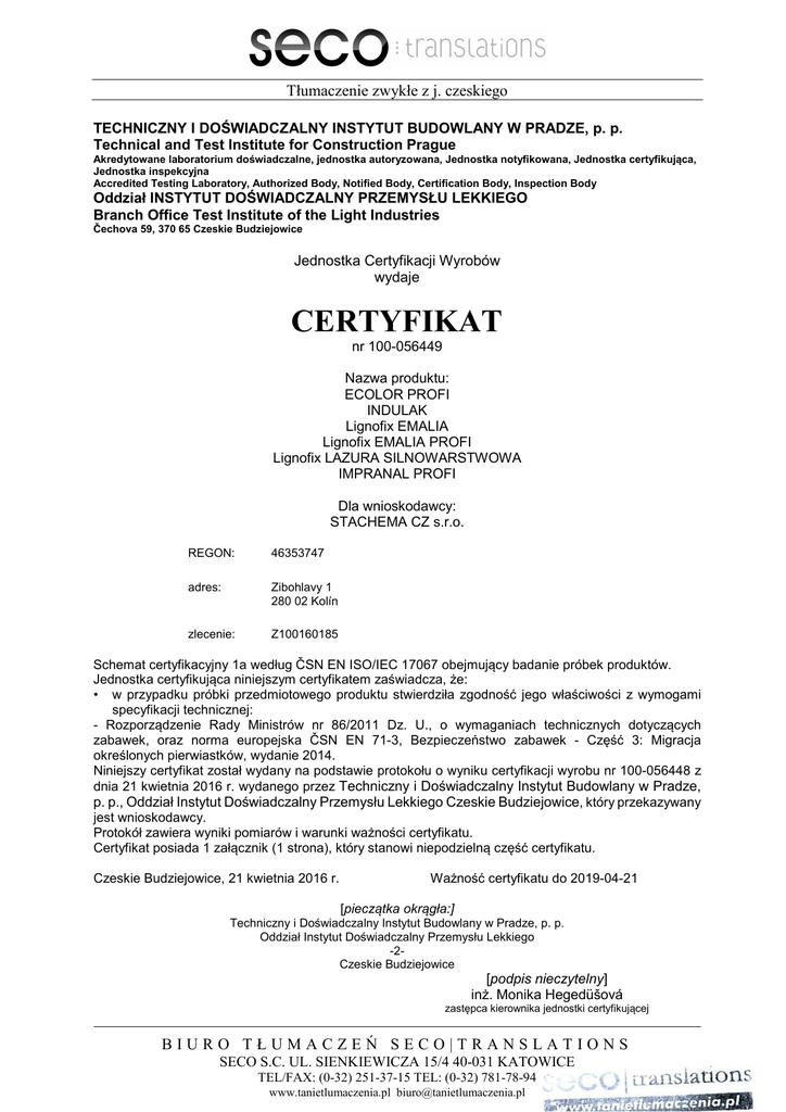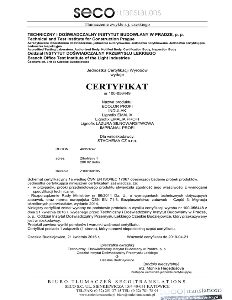 Tłumaczenie zwykłe z j. czeskiego TECHNICZNY I DOŚWIADCZALNY INSTYTUT BUDOWLANY W PRADZE, p. p. Technical and Test Institute for Construction Prague Akredytowane laboratorium doświadczalne, jednostka autoryzowana, Jednostka notyfikowana, Jednostka certyfikująca, Jednostka inspekcyjna Accredited Testing Laboratory, Authorized Body, Notified Body, Certification Body, Inspection Body Oddział INSTYTUT DOŚWIADCZALNY PRZEMYSŁU LEKKIEGO Branch Office Test Institute of the Light Industries Čechova 59, 370 65 Czeskie Budziejowice Jednostka Certyfikacji Wyrobów wydaje CERTYFIKAT nr 100-056449 Nazwa produktu: ECOLOR PROFI INDULAK Lignofix EMALIA Lignofix EMALIA PROFI Lignofix LAZURA SILNOWARSTWOWA IMPRANAL PROFI Dla wnioskodawcy: STACHEMA CZ s.r.o. REGON: 46353747 adres: Zibohlavy 1 280 02 Kolín zlecenie: Z100160185 Schemat certyfikacyjny 1a według ČSN EN ISO/IEC 17067 obejmujący badanie próbek produktów. Jednostka certyfikująca niniejszym certyfikatem zaświadcza, że: • w przypadku próbki przedmiotowego produktu stwierdziła zgodność jego właściwości z wymogami specyfikacji technicznej: - Rozporządzenie Rady Ministrów nr 86/2011 Dz. U., o wymaganiach technicznych dotyczących zabawek, oraz norma europejska ČSN EN 71-3, Bezpieczeństwo zabawek - Część 3: Migracja określonych pierwiastków, wydanie 2014. Niniejszy certyfikat został wydany na podstawie protokołu o wyniku certyfikacji wyrobu nr 100-056448 z dnia 21 kwietnia 2016 r. wydanego przez Techniczny i Doświadczalny Instytut Budowlany w Pradze, p. p., Oddział Instytut Doświadczalny Przemysłu Lekkiego Czeskie Budziejowice, który przekazywany jest wnioskodawcy. Protokół zawiera wyniki pomiarów i warunki ważności certyfikatu. Certyfikat posiada 1 załącznik (1 strona), który stanowi niepodzielną część certyfikatu. Czeskie Budziejowice, 21 kwietnia 2016 r. Ważność certyfikatu do 2019-04-21 [pieczątka okrągła:] Techniczny i Doświadczalny Instytut Budowlany w Pradze, p. p. Oddział Instytut Doświadczalny Przemysłu Lekkiego -2Czeskie Budziejowice [podpis nieczytelny] inż. Monika Hegedüšová zastępca kierownika jednostki certyfikującej BIURO TŁUMACZEŃ SECO|TRANSLATIONS SECO S.C. UL. SIENKIEWICZA 15/4 40-031 KATOWICE TEL/FAX: (0-32) 251-37-15 TEL: (0-32) 781-78-94 www.tanietlumaczenia.pl [email protected] Załącznik do certyfikatu 100-056449 Warunki ważności i stosowania certyfikatu: 1. 2. 3. a) b) c) d) e) 4. 5. Certyfikat zgodności powinien być używany tylko do celów, do których został wydany. Certyfikowany produkt powinien być stale zgodny ze specyfikacją techniczną. Posiadacz certyfikatu powinien: informować jednostkę certyfikującą o wszystkich zmianach: modyfikacji produktów lub procesu produkcji, zmianach materiałowych, zmianach systemu zarządzania produkcją, które wpływają na zgodność certyfikowanego produktu; informować jednostkę certyfikującą o zmianach we własności, strukturze lub zarządzie; prowadzić ewidencję wszystkich skarg dotyczących niezgodności certyfikowanego produktu z wymaganiami stosownej normy; podjąć odpowiednie środki w celu usunięcia niezgodności i prowadzić dokumentację podjętych środków; na żądanie przedstawić jednostce certyfikującej wyżej wymienioną ewidencję skarg. Jednostka certyfikująca przeprowadza powtórną ocenę produktu w przypadku, gdy dojdzie do zmian wpływających na właściwości produktu, do zmiany specyfikacji technicznych lub do istotnych zmian w zakresie własności, struktury lub zarządzania firmy. Wnioskodawca może złożyć odwołanie od niniejszego certyfikatu w Technicznym i Doświadczalnym Instytucie Budowlanym w Pradze p. p., Wydział Zarządzania Jakością, w terminie 15 dni od dnia doręczenia niniejszego certyfikatu. Niniejszy załącznik stanowi niepodzielną część certyfikatu nr 100-056449. [pieczątka okrągła:] Techniczny i Doświadczalny Instytut Budowlany w Pradze, p. p. Oddział Instytut Doświadczalny Przemysłu Lekkiego -2Czeskie Budziejowice Czeskie Budziejowice, 21 kwietnia 2016 r. [podpis nieczytelny] inż. Monika Hegedüšová zastępca kierownika jednostki certyfikującej Koniec tłumaczenia BIURO TŁUMACZEŃ SECO|TRANSLATIONS SECO S.C. UL. SIENKIEWICZA 15/4 40-031 KATOWICE TEL/FAX: (0-32) 251-37-15 TEL: (0-32) 781-78-94 www.tanietlumaczenia.pl [email protected]
