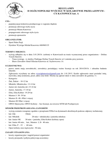 REGULAMIN II OGÓLNOPOLSKI WYŚCIGU W KOLARSTWIE PRZEŁAJOWYM CX KATOWICE kat. A CEL: - popularyzacja kolarstwa przełajowego w regionie śląskim - promocja zdrowego trybu życia - promocja Miasta Katowice - propagowanie zdrowego stylu życia - promocja sponsorów ORGANIZATOR: - Sport Pełen Pasji - Dyrektor Wyścigu Michał Kucewicz 606960135 TERMIN I MIEJSCE: - wyścig odbędzie się w dniu 3.01.2015r. (sobota) w Katowicach na trasie wyznaczonej przez organizatora – Dolina Trzech Stawów. Trasa wyścigu –w okolicy Parkingu Dolina Trzech Stawów ul. Lotnisko przy jeziorze. Biuro Zawodów Hotel Silesian Katowice ul. Szybowcowa 1A UCZESTNICWO: - prawo startu mają zawodniczki, zawodnicy posiadający ważne licencje na rok 2014/2015r. i aktualne badania lekarski. - Zgłoszenia wysyłamy na adres [email protected] do 1.01.2015. Każde zgłoszenie musi posiadać imię, nazwisko, datę urodzenia, pesel, adres oraz klub. Można się zgłosić także w dniu zawodów do godziny 11. - Kategorie: - Żak, Żakini – 10-12 lat - Młodzik, Młodziczka- 13-14 lat - Junior mł, Juniorka mł.-15-16 lat - Junior, Juniorka- 17-18 lat - Elita, Elita Kobiet- 19-29 lat - Masters I- 30- 39 lat - Masters II- 40- 49lat i więcej - Masters III 50lat i więcej - OPEN Mężczyźni, OPEN Kobiety – bez licencji, na rowerze MTB lub Przełajowym SPOSÓB PRZEPROWADZANIA ZAWODÓW - wyścig zostanie rozegrany zgodnie z przepisami PZKol na dystansach określonych podczas odprawy technicznej. - kat: Żak 10min - kat: Młodzik 20 min.+ młodziczka i juniorka młodsza - kat: Junior Mł. 30 min.+ juniorka, Elita Kobiet (kobiety open) - kat: Junior 40 min , kat., Masters I, II- 40 min. - kat: Elita, P – 23 - 60 min. - Open kobiety oraz mężczyźni– 50 min. ZASADY FINASOWANIA - koszty organizacyjne i nagród ponosi organizator - koszty przejazdu i pobytu pokrywają uczestnicy - startowe dla wszystkich kategorii jest zgodne z przepisami PZKOL startowe dla kategorii open to 20zł do 29.12.2014 a po tym terminie 30zł NAGRODY - organizator zapewnia nagrody finansowe i rzeczowe oraz puchary dla zwycięzców w poszczególnych kat. wiekowych. NOCLEGI Hotel Silesia http://www.silesianhotel.pl/ POSTANOWIENIA KOŃCOWE - każdy uczestnik wyścigu startuje na własną odpowiedzialność - organizator nie bierze odpowiedzialności za rzeczy zagubione i skradzione podczas trwania zawodów - wszyscy zawodnicy powinni być ubezpieczeni przez macierzyste kluby - organizator nie ponosi odpowiedzialności za wypadki powstałe w czasie zawodów - organizator zapewnia opiekę medyczną - skład komisji sędziowskiej wyznaczy organizator - w sprawach sportowych nie objętych niniejszym regulaminem i przepisami PZKol decyduje sędzia główny w porozumieniu z organizatorem - Organizator może zmienić godziny startów które zostaną podane na odprawie technicznej PROGRAM MINUTOWY 3.01.2015r. 8:00- 9:30- zapisy zawody OPEN 8:00-11:00 – zapisy i weryfikacja zawodników w biurze wyścigu HOTEL SILESIAN 8:00- 12:00 – zapisy Elita 10:00 – Start zawodów OPEN 11:05 – start kat. Żak, Żakini, 11:20 - Młodzik, Młodziczka, juniorka mł., 11:55 – start kat. Junior mł., kobiety OPEN 12:50 – start kat. Junior, Masters I, Masters II, Masters III 13:50– start kat. Elita 15:30 – uroczyste zakończenie wyścigu, wręczenie nagród i pucharów HOTEL SILESIAN
