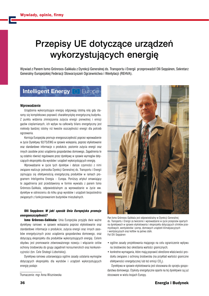 Wywiady, opinie, firmy Przepisy UE dotyczące urządzeń wykorzystujących energię Wywiad z Panem Ismo Grönroos-Saikkala z Dyrekcji Generalnej ds. Transportu i Energii przeprowadził Olli Seppänen, Sekretarz Generalny Europejskiej Federacji Stowarzyszeń Ogrzewnictwa i Wentylacji (REHVA). Wprowadzenie Urządzenia wykorzystujące energię odgrywają istotną rolę gdy staramy się kompleksowo poprawić charakterystykę energetyczną budynku. Z punktu widzenia zmniejszenia zużycia energii pierwotnej i emisji gazów cieplarnianych, ich wpływ na całkowity bilans energetyczny jest niekiedy bardziej istotny niż kwestie oszczędności energii dla potrzeb ogrzewania. Komisja Europejska promuje energooszczędność poprzez wprowadzenie w życie Dyrektywy 92/75/EWG w sprawie wskazania, poprzez etykietowanie oraz standardowe informacje o produkcie, poziomie zużycia energii oraz innych zasobów przez urządzenia gospodarstwa domowego, Zagadnienia te są ostatnio również regulowane przez dyrektywę w sprawie wymogów dotyczących ekoprojektu dla wyrobów i urządzeń wykorzystujących energię. Wprowadzanie w życie tych dyrektyw i dalsze czynności z nimi związane realizuje jednostka Dyrekcji Generalnej ds. Transportu i Energii zajmująca się efektywnością energetyczną produktów w ramach programem Inteligentna Energia – Europa. Poniższy artykuł omawiający te zagadnienia jest przedstawiony w formie wywiadu z panem Ismo Grönroos-Saikkala, odpowiedzialnym za wprowadzanie w życie ww. dyrektyw w odniesieniu do kilku grup wyrobów i urządzeń bezpośrednio związanych z funkcjonowaniem budynków mieszkalnych. Olli Seppänen: W jaki sposób Unia Europejska promuje energooszczędność? Ismo Grönroos-Saikkala: Unia Europejska przyjęła dwie ważne dyrektywy ramowe: w sprawie wskazania poprzez etykietowanie oraz standardowe informacje o produkcie, zużycia energii oraz innych zasobów energetycznych przez urządzenia gospodarstwa domowego, oraz dotyczącą ekoprojektu dla produktów wykorzystujących energię. Celem obydwu jest promowanie zrównoważonego rozwoju i włączanie celów ochrony środowiska do grupy zagadnień konsumenckich oraz konkurencyjności (tzn. Cele Strategii Lizbońskiej). Dyrektywa ramowa ustanawiająca ogólne zasady ustalania wymogów dotyczących ekoprojektu dla wyrobów i urządzeń wykorzystujących energię podaje: Tłumaczenie: mgr Anna Wiszniewska 36 Pan Ismo Grönroos-Saikkala jest odpowiedzialny w Dyrekcji Generalnej ds. Transportu i Energii za tworzenie i wprowadzanie w życie przepisów opartych na dyrektywach w sprawie etykietowania i ekoprojektu dotyczących silników przemysłowych, wentylatorów i pomp, domowych urządzeń klimatyzacyjnych i wentylacyjnych oraz kotłów na paliwa stałe. Fot Olli Seppänen • ogólne zasady projektowania mającego na celu ograniczenie wpływu na środowisko bez określania wartości granicznych; • konkretne wymagania, które mają poprawić określone właściwości produktu związane z ochroną środowiska (na przykład wartości graniczne efektywności energetycznej lub też emisji CO2). Dyrektywa w sprawie etykietowania jest stosowana do sprzętu gospodarstwa domowego. Etykiety energetyczne oparte na tej dyrektywie są już stosowane w wielu krajach Europy. Energia i Budynek Wywiady, opinie, firmy O. S.: Jak zdefiniowane zostały przepisy dotyczące określonego rodzaju sprzętu – czy obowiązują one we wszystkich krajach? I G-S.: Dyrektywy ramowe w sprawie etykiet energetycznych i ekoprojektu zostały przyjęte w prawodawstwie krajowym po czym zaczęły obowiązywać w Państwach Członkowskich. Dyrektywy te dotyczą tylko Państw Członkowskich. Dyrektywy ramowe mogą być wprowadzane w życie jako Dyrektywy Komisji, Przepisy lub Decyzje w celu ustalenia ogólnych lub szczegółowych wymagań dotyczących konkretnych produktów wykorzystujących energię. Przepisy te obowiązują producentów oraz ich reprezentantów przy wprowadzaniu tych produktów na rynek. W pewnym uproszczeniu, proces ten realizowany jest w następujący sposób. Komisja przygotowuje propozycję przepisu w oparciu np. o dyrektywę w sprawie etykietowania a następnie przedstawia ją Komitetowi Regulacyjnemu, który składa się z reprezentantów wszystkich Państw Członkowskich. Komitet Regulacyjny głosuje nad przyjęciem przepisu. Jeśli propozycja zostaje przyjęta, Komisja ją zatwierdza. Wszystkie artykuły danego przepisu muszą być przestrzegane we wszystkich Państwach Członkowskich bez wprowadzania zmian na poziomie krajowym. Jednolita implementacja w całej Unii Europejskiej jest korzystna dla producentów działających na rynku wewnętrznym. O. S.: Do jakich produktów odnoszą się dyrektywy w sprawie etykiet energetycznych i ekoprojektu? I G-S.: Dyrektywa w sprawie ekoprojektu może być stosowana do wszystkich produktów wykorzystujących energię z wyjątkiem pojazdów i maszyn przeznaczonych do transportu. Dyrektywa w sprawie etykiet energetycznych odnosi się do wszelkiego rodzaju sprzętów gospodarstwa domowego. Obie dyrektywy ramowe poddawane są obecnie modyfikacji aby można było rozszerzyć ich zastosowanie do wszystkich produktów mających wpływ na zużycie energii, a dotyczy to nawet okien. Nowelizacje obu dyrektyw mają się ukazać najpóźniej do 2012 roku. O. S.: Jak dyrektywa w sprawie ekoprojektu została przyjęta w Państwach Członkowskich? I G-S.: Punktem wyjścia dyrektywy było to, że różnice w przepisach krajowych dotyczących produktów zużywających energię mogą spowodować powstanie barier handlowych i niekorzystnie wpłynąć na konkurencję w Unii Europejskiej. Mogą mieć więc istotny wpływ na funkcjonowanie rynku wewnętrznego. Harmonizacja przepisów krajowych jest sposobem zapobiegania powstawaniu barier handlowych i niezdrowej konkurencji. Już prawie wszystkie kraje zaadaptowały swoje przepisy do wymagań dyrektywy (terminem na wdrożenie tych przepisów był sierp
