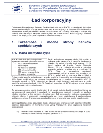 Europejski Zwi zek Banków Spółdzielczych Groupement Européen des Banques Coopératives Europäische Vereinigung der Genossenschaftsbanken Ład korporacyjny Członkowie Europejskiego Zwi zku Banków Spółdzielczych (EACB) popieraj cel, jakim jest wzmocnienie dobrych praktyk na obszarze ładu korporacyjnego w organizacjach bankowych. Niew tpliwie warto jest okre li zestaw jasnych zasad na potrzeby najlepszych praktyk, aby unikn niepo danych skutków niedoci gni na obszarze ładu korporacyjnego banków, które m. in. mog przyczynia si do kryzysów finansowych. 1. To samo i spółdzielczych mocne strony banków 1.1. Karta identyfikacyjna Banki spółdzielcze stanowi około 20% udziału w unijnym rynku depozytów i kredytów bankowych, dlatego s wa n cz ci tego sektora. (1) W takich krajach, jak Austria, Francja, Finlandia, Niemcy, Włochy i Holandia ich udział w rynku jest znacznie wy szy i znajduje si w przedziale 2550%. Cho w pozostałych pa stwach członkowskich udział w rynku jest mniejszy ni 20%, to wci jest on znacz cy. Na przykład w Polsce udział banków spółdzielczych w rynku kredytów i depozytów wynosi odpowiednio 8% i 10%. Banki spółdzielcze s głównym kredytodawc w przypadku europejskich M P. W Kanadzie wynosi on 30%, natomiast w Japonii udział instytucji spółdzielczych w rynku kredytów jest na poziomie ok. 24%. W Szwajcarii wynosi on ok. 20% i zajmuje trzecie miejsce w szwajcarskim sektorze bankowym. EACB reprezentuje i promuje banki spółdzielcze w Europie oraz ich broni: • 4200 lokalnych banków detalicznych • 78 milionów członków • 205 milionów klientów • 860 tysi cy pracowników • 68 tysi cy oddziałów Od samego pocz tku swojej działalno ci, tj. od ponad stulecia, banki spółdzielcze kieruj si ugruntowanymi warto ciami i zasadami. Ich podstawowe warto ci i zasady to: zaufanie mi dzy członkami a ich bankami, demokratyczny ład korporacyjny, ostro ne zarz dzanie, blisko klienta i uczciwo , zaanga owanie na rzecz udziałówców i społecze stwa, solidarno , solidne finansowanie, przedsi biorczo oraz wspieranie swojej niezale no ci. Banki spółdzielcze maj obowi zek dba o ekonomiczne interesy swoich członków i klientów poprzez dostarczanie im kompleksowych usług finansowych oraz wspieranie lokalnych społeczno ci. (1) Raport Oliviera Wymana pt. "The outlook for co-operative banking in Europe in 2012 banking on values, building on agility", grudzie 2012. • • ! •" # • '''( .%(.&&/ • 0 $% & '& . ! ( 1 ( !• .%(.&&/ ) &%%* +' , - !- !
