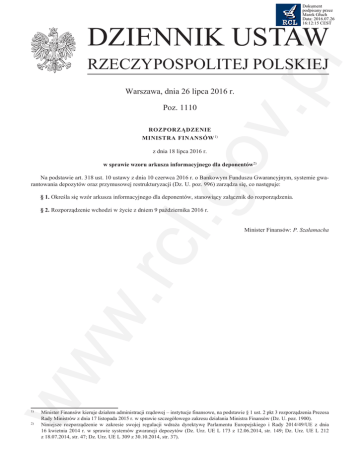 Dokument podpisany przez Marek Głuch Data: 2016.07.26 16:12:15 CEST DZIENNIK USTAW v.p l RZECZYPOSPOLITEJ POLSKIEJ Warszawa, dnia 26 lipca 2016 r. Poz. 1110 ROZPORZĄDZENIE MINISTRA FINANSÓW 1) .go z dnia 18 lipca 2016 r. w sprawie wzoru arkusza informacyjnego dla deponentów2) Na podstawie art. 318 ust. 10 ustawy z dnia 10 czerwca 2016 r. o Bankowym Funduszu Gwarancyjnym, systemie gwarantowania depozytów oraz przymusowej restrukturyzacji (Dz. U. poz. 996) zarządza się, co następuje: § 1. Określa się wzór arkusza informacyjnego dla deponentów, stanowiący załącznik do rozporządzenia. ww w. rcl § 2. Rozporządzenie wchodzi w życie z dniem 9 października 2016 r. Minister Finansów kieruje działem administracji rządowej – instytucje finansowe, na podstawie § 1 ust. 2 pkt 3 rozporządzenia Prezesa Rady Ministrów z dnia 17 listopada 2015 r. w sprawie szczegółowego zakresu działania Ministra Finansów (Dz. U. poz. 1900). 2) Niniejsze rozporządzenie w zakresie swojej regulacji wdraża dyrektywę Parlamentu Europejskiego i Rady 2014/49/UE z dnia 16 kwietnia 2014 r. w sprawie systemów gwarancji depozytów (Dz. Urz. UE L 173 z 12.06.2014, str. 149; Dz. Urz. UE L 212 z 18.07.2014, str. 47; Dz. Urz. UE L 309 z 30.10.2014, str. 37). 1) Minister Finansów: P. Szałamacha Załącznik do rozporządzenia Ministra Finansów Dziennik Ustaw –2– z dnia 18 lipca 2016 r. (poz. …) WZÓR Załącznik do rozporządzenia Ministra Finansów z dnia 18 lipca 2016 r. (poz. 1110) v.p l WZÓR Poz. 1110 ARKUSZ INFORMACYJNY DLA DEPONENTÓW ARKUSZ INFORMACYJNY DLA DEPONENTÓW Depozyty w ............................................. [nazwa podmiotu objętego Bankowy Fundusz Gwarancyjny1) systemem gwarantowania] .go są gwarantowane przez: równowartość w złotych 100 000 euro w odniesieniu do każdego deponenta w jednym podmiocie objętym systemem gwarantowania.2) Zakres ochrony: [nazwa podmiotu objętego systemem gwarantowania] [w stosownych przypadkach:] korzysta z następujących znaków towarowych: [wstawić wszystkie znaki towarowe w. rcl stosowane na mocy tego samego zezwolenia]. Jeżeli deponent posiada więcej depozytów w tym samym podmiocie objętym systemem gwarantowania: Jeżeli deponent posiada wspólny rachunek z inną osobą / innymi osobami: wszystkie depozyty w tym samym podmiocie objętym systemem gwarantowania są sumowane, a suma podlega limitowi równowartości w złotych 100 000 euro3) limit równowartości w złotych 100 000 euro ma zastosowanie do każdego z deponentów oddzielnie4) Okres wypłaty w przypadku niewypłacalności podmiotu ww objętego systemem gwarantowania: 7 dni roboczych5) –2– Dziennik Ustaw Poz. 1110 Złoty v.p l Waluta wypłaty: –3– Bankowy Fundusz Gwarancyjny [wstawić adres Bankowego Funduszu Gwarancyjnego] Kontakt: Telefon: [wstawić numer infolinii Bankowego Funduszu Gwarancyjnego] Faks: [wstawić Gwarancyjnego] numer faksu Bankowego Funduszu Informacje dodatkowe: Potwierdzenie otrzymania przez deponenta:6) Informacje dodatkowe: 1) .go E-mail: [wstawić adres e-mail Bankowego Funduszu Gwarancyjnego] https://www.bfg.pl/ System odpowiedzialny za ochronę depozytu. w. rcl Bankowy Fundusz Gwarancyjny jest odpowiedzialny za ochronę depozytów. 2) 3) Ogólny zakres ochrony. Jeżeli depozyt nie jest dostępny, gdyż podmiot objęty systemem gwarantowania nie jest w stanie wypełnić swoich zobowiązań finansowych, wypłaty na rzecz deponentów dokonuje Bankowy Fundusz Gwarancyjny. Kwota wypłaty wynosi maksymalnie równowartość w złotych 100 000 euro w odniesieniu do każdego deponenta w jednym podmiocie objętym systemem gwarantowania. Oznacza to, że w celu określenia kwoty objętej gwarancją sumowane są wszystkie depozyty ulokowane w tym samym podmiocie objętym systemem gwarantowania. Przykładowo, jeżeli deponent posiada równowartość w złotych 90 000 euro na rachunku oszczędnościowym i równowartość w złotych 20 000 euro na rachunku bieżącym w tym samym podmiocie objętym systemem gwarantowania, wypłacona zostanie ww jedynie kwota równowartości w złotych 100 000 euro. [Tylko w stosownych przypadkach:] Metoda ta jest również stosowana w przypadku, gdy podmiot objęty systemem gwarantowania prowadzi działalność pod różnymi znakami towarowymi. [Wpisać nazwę podmiotu objętego systemem gwarantowania prowadzącego rachunek] działa również pod nazwą [wpisać wszystkie inne znaki towarowe tego samego podmiotu objętego systemem gwarantowania]. Oznacza to, że suma wszystkich depozytów –3– Dziennik Ustaw –4– Poz. 1110 ulokowanych pod jednym lub wieloma z tych znaków towarowych jest gwarantowana łącznie v.p l do wysokości równowartości w złotych 100 000 euro. Do obliczenia równowartości euro w złotych przyjmuje się kurs średni ogłaszany przez Narodowy Bank Polski w dniu spełnienia warunku gwarancji, w rozumieniu art. 2 pkt 10 ustawy z dnia 10 czerwca 2016 r. o Bankowym Funduszu Gwarancyjnym, systemie gwarantowania depozytów oraz przymusowej restrukturyzacji (Dz. U. poz. 996), wobec danego podmiotu objętego systemem gwarantowania depozytów. 4) Limit ochrony wspólnych rachunków. do każdego z deponentów. .go W przypadku wspólnych rachunków limit równowartości w złotych 100 000 euro stosuje się Jednakże depozyty na rachunku, do którego dwie lub więcej osób jest uprawnionych jako członkowie spółki osobowej, stowarzyszenia lub jednostki organizacyjnej nieposiadającej osobowości prawnej, której odrębna ustawa przyznaje zdolność prawną, są do celów obliczenia górnego limitu równowartości w złotych 100 000 euro sumowane i traktowane jako depozyt jednego deponenta. W przypadku gdy środki lub należności deponenta będącego osobą fizyczną pocho- w. rcl dzą z: 1) odpłatnego zbycia: a) nieruchomości zabudowanej budynkiem mieszkalnym jednorodzinnym w rozumieniu przepisów ustawy z dnia 7 lipca 1994 r. – Prawo budowlane (Dz. U. z 2016 r. poz. 290, z późn. z