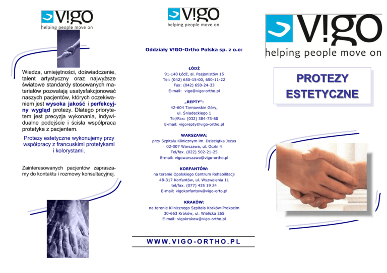 Oddziały V!GO-Ortho Polska sp. z o.o: Wiedza, umiejętności, doświadczenie, talent artystyczny oraz najwyższe światowe standardy stosowanych materiałów pozwalają usatysfakcjonować naszych pacjentów, których oczekiwaniem jest wysoka jakość i perfekcyjny wygląd protezy. Dlatego priorytetem jest precyzja wykonania, indywidualne podejście i ścisła współpraca protetyka z pacjentem. Protezy estetyczne wykonujemy przy współpracy z francuskimi protetykami i kolorystami. ŁÓDŹ 91-140 Łódź, al. Pasjonistów 15 Tel: (042) 650-15-00, 650-11-22 Fax: (042) 650-24-33 E-mail: [email protected] „REPTY”: 42-604 Tarnowskie Góry, ul. Śniadeckiego 1 Tel/Fax: (032) 384-73-60 E-mail: [email protected] WARSZAWA: przy Szpitalu Klinicznym im. Dzieciątka Jezus 02-007 Warszawa, ul. Oczki 4 Tel/fax. (022) 502-21-25 E-mail: [email protected] Zainteresowanych pacjentów zapraszamy do kontaktu i rozmowy konsultacyjnej. KORFANTÓW: na terenie Opolskiego Centrum Rehabilitacji 48-317 Korfantów, ul. Wyzwolenia 11 tel/fax. (077) 435 19 24 E-mail: [email protected] KRAKÓW: na terenie Klinicznego Szpitala Kraków-Prokocim 30-663 Kraków, ul. Wielicka 265 E-mail: [email protected] W W W. V I G O - O R T H O . P L PROTEZY ESTETYCZNE Wykonujemy protezy estetyczne na różnych poziomach amputacji: PROTEZY RAMIENIA I PRZEDRAMIENIA Protezy kosmetyczne są bardzo trudne do odróżnienia od naturalnych części ciała. Szczególny nacisk kładziemy na wierne i naturalistyczne odtworzenie detali - paznokci, porów, zmarszczek, linii papilarnych. PROTEZY CAŁKOWITE DŁONI ETAPY ZAOPATRZENIA 1 Punktem wyjścia jest zawsze analiza indywidualnej budowy anatomicznej pacjenta, faktury i karnacji jego skóry, a nawet własnych przyzwyczajeń. PROTEZY CZĘŚCIOWE DŁONI Po wstępnych usta2 leniach dotyczących rodzaju zaopatrzenia, pobierana jest miara ze zdrowej kończyny, która służy do wykonania cienkiej przezroczystej silikonowej rękawicy. PROTEZY PALCÓW PROTEZY ESTETYCZNE KOŃCZYN DOLNYCH PROTEZY ESTETYCZNE TWARZY (OCZU, USZU) Protezy estetyczne mają za zadanie jak najwierniejsze odtworzenie utraconych częściowo lub całkowicie kończyn. Do wykonania stosowane są głównie silikony oddające strukturę naturalnej skóry pacjenta i indywidualnie koloryzowane przy pacjencie. Zewnętrzna warstwa przezroczystego silikonu zapewnia odporność warstwy wewnętrznej przed uszkodzeniami mechanicznymi i daje realistyczną głębię koloru. W zależności od preferencji i możliwości pacjenta możemy zaoferować trzy podstawowe rozwiązania w zakresie protetyki kończyn górnych: Protezy tzw. wierne kopie z pobraniem miary ze zdrowej kończyny, wykonywane z silikonu i ręcznie malowane Protezy o tzw. zbliżonym wyglądzie bez pobrania miary, silikonowe i ręcznie malowane (Ewentualnie korzysta się z gotowej miary dobieranej dla pacjenta z bazy). 3 Proteza jest trwała - przy normalnej eksploatacji (ważnymi czynnikami są temperatura, eksploatacja mechaniczna, długotrwałość ekspozycji) pacjent może używać protezę dłoni wiele lat. Protezy wykonane z rękawicy PCV do wyboru jest paleta kilkunastu odcieni skóry h e l p i n g Silikonowa rękawica jest koloryzowana od wewnętrznej strony przez wyspecjalizowanych artystów. Koloryzacja odbywa się w obecności pacjenta, dzięki czemu udaje się osiągnąć efekt idealnego odwzorowania koloru i tekstury skóry utraconej kończyny. Dobierany jest również kształt paznokci, które potem mogą być malowane i zdobione. Proteza jest mocowana podciśnieniowo. p e o p l e m o v e o n