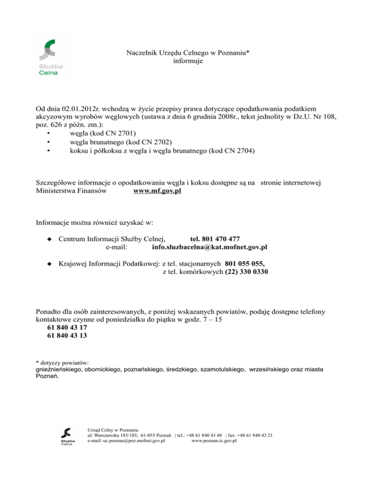 Naczelnik Urzędu Celnego w Poznaniu* informuje Od dnia 02.01.2012r. wchodzą w życie przepisy prawa dotyczące opodatkowania podatkiem akcyzowym wyrobów węglowych (ustawa z dnia 6 grudnia 2008r., tekst jednolity w Dz.U. Nr 108, poz. 626 z późn. zm.): • węgla (kod CN 2701) • węgla brunatnego (kod CN 2702) • koksu i półkoksu z węgla i węgla brunatnego (kod CN 2704) Szczegółowe informacje o opodatkowaniu węgla i koksu dostępne są na stronie internetowej Ministerstwa Finansów www.mf.gov.pl Informacje można również uzyskać w: Centrum Informacji Służby Celnej, tel. 801 470 477 e-mail: [email protected] Krajowej Informacji Podatkowej: z tel. stacjonarnych 801 055 055, z tel. komórkowych (22) 330 0330 Ponadto dla osób zainteresowanych, z poniżej wskazanych powiatów, podaję dostępne telefony kontaktowe czynne od poniedziałku do piątku w godz. 7 – 15 61 840 43 17 61 840 43 13 * dotyczy powiatów: gnieźnieńskiego, obornickiego, poznańskiego, średzkiego, szamotulskiego, wrzesińskiego oraz miasta Poznań. Urząd Celny w Poznaniu ul. Warszawska 183/185, 61-055 Poznań | tel.: +48 61 840 43 48 | fax: +48 61 840 43 21 e-mail: [email protected] www.poznan.ic.gov.pl