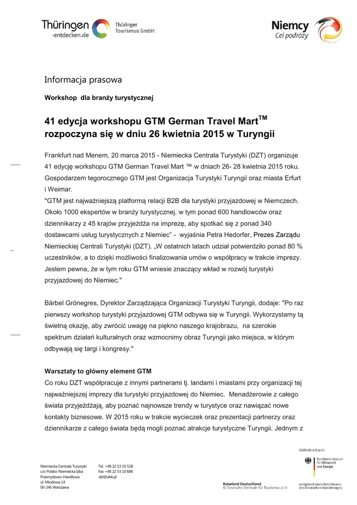 Informacja prasowa Workshop dla branży turystycznej 41 edycja workshopu GTM German Travel MartTM rozpoczyna się w dniu 26 kwietnia 2015 w Turyngii Frankfurt nad Menem, 20 marca 2015 - Niemiecka Centrala Turystyki (DZT) organizuje 41 edycję workshopu GTM German Travel Mart ™ w dniach 26- 28 kwietnia 2015 roku. Gospodarzem tegorocznego GTM jest Organizacja Turystyki Turyngii oraz miasta Erfurt i Weimar. "GTM jest najważniejszą platformą relacji B2B dla turystyki przyjazdowej w Niemczech. Około 1000 ekspertów w branży turystycznej, w tym ponad 600 handlowców oraz dziennikarzy z 45 krajów przyjeżdża na imprezę, aby spotkać się z ponad 340 dostawcami usług turystycznych z Niemiec” - wyjaśnia Petra Hedorfer, Prezes Zarządu Niemieckiej Centrali Turystyki (DZT). „W ostatnich latach udział potwierdziło ponad 80 % uczestników, a to dzięki możliwości finalizowania umów o współpracy w trakcie imprezy. Jestem pewna, że w tym roku GTM wniesie znaczący wkład w rozwój turystyki przyjazdowej do Niemiec." Bärbel Grönegres, Dyrektor Zarządzająca Organizacji Turystyki Turyngii, dodaje: "Po raz pierwszy workshop turystyki przyjazdowej GTM odbywa się w Turyngii. Wykorzystamy tą świetną okazję, aby zwrócić uwagę na piękno naszego krajobrazu, na szerokie spektrum działań kulturalnych oraz wzmocnimy obraz Turyngii jako miejsca, w którym odbywają się targi i kongresy." Warsztaty to główny element GTM Co roku DZT współpracuje z innymi partnerami tj. landami i miastami przy organizacji tej najważniejszej imprezy dla turystyki przyjazdowej do Niemiec. Menadżerowie z całego świata przyjeżdżają, aby poznać najnowsze trendy w turystyce oraz nawiązać nowe kontakty biznesowe. W 2015 roku w trakcie wycieczek oraz prezentacji partnerzy oraz dziennikarze z całego świata będą mogli poznać atrakcje turystyczne Turyngii. Jednym z Niemiecka Centrala Turystyki c/o Polsko-Niemiecka Izba Przemysłowo-Handlowa ul. Miodowa 14 00-246 Warszawa Tel. +48 22 53 10 528 Fax +48 22 53 10 688 [email protected] najważniejszym tematów będzie Rok Jubileuszu Reformacji (2017). Oficjalne otwarcie imprezy odbędzie się w Erfurcie w katedrze mariackiej. Głównym punktem spotkań będą 2-dniowe warsztaty na terenie targów w Erfurcie, na których wystawcy tj. hotele, przewoźnicy oraz regionalne organizacje turystyczne zaprezentują swoja ofertę turystyczną. Zrównoważony rozwój to jeden z głównych tematów DZT przy promocji turystyki do Niemiec. Dlatego też GTM od wielu lat organizowany jest w konwencji „zielonych spotkań”. Organizatorzy preferują przyjazd uczestników koleją, hotele usytuowane są tak, aby można było korzystać z komunikacji miejskiej oraz inteligentnych rozwiązań logistycznych w zakresie transferów. Procedury zapraszania uczestników odbywają się jedynie drogą elektroniczna, zaproszenia drukowane są na certyfikowanym papierze ekologicznym. Przy budowie stoisk dla wystawców używane są materiały przyjazne środowisku oraz możliwe do ponownego użycia. Catering zaplanowany został na bazie produktów lokalnych i sezonowych. Do obsługi gości używane będą naczynia i sztućce jednorazowego użytku. W roku 2015 organizacja my-green-meeting.de przyznała organizatorom GTM pieczęć GreenNote. O DZT Niemiecka Centrala Turystyki (DZT) to narodowa „izba turystyki” Niemiec z siedzibą główną we Frankfurcie nad Menem. Centrala zajmuje się promowaniem Niemiec jako kraju turystycznego na zlecenie Federalnego Ministerstwa Gospodarki i Technologii (BMWi), które wspiera ją na mocy uchwały niemieckiego Bundestagu. DZT zajmuje się tworzeniem strategii i produktów oraz działaniami marketingowymi w celu dalszego umocnienia pozytywnego wizerunku Niemiec za granicą jako celu podróży oraz wspierania turystyki niemieckiej. DZT posiada 30 przedstawicielstw zagranicznych na całym świecie. Bliższe informacje można znaleźć w naszym internetowym centrum prasowym na stronie www.germany.travel/presse. Niemiecka Centrala Turystyki c/o Polsko-Niemiecka Izba Przemysłowo-Handlowa ul. Miodowa 14 00-246 Warszawa Tel. +48 22 53 10 528 Fax +48 22 53 10 688 [email protected]