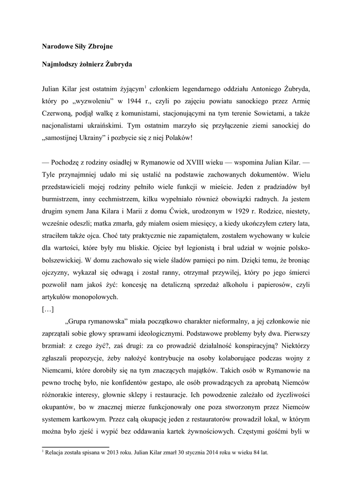 Narodowe Siły Zbrojne Najmłodszy żołnierz Żubryda Julian Kilar jest ostatnim żyjącym 1 członkiem legendarnego oddziału Antoniego Żubryda, który po „wyzwoleniu” w 1944 r., czyli po zajęciu powiatu sanockiego przez Armię Czerwoną, podjął walkę z komunistami, stacjonującymi na tym terenie Sowietami, a także nacjonalistami ukraińskimi. Tym ostatnim marzyło się przyłączenie ziemi sanockiej do „samostijnej Ukrainy” i pozbycie się z niej Polaków! — Pochodzę z rodziny osiadłej w Rymanowie od XVIII wieku — wspomina Julian Kilar. — Tyle przynajmniej udało mi się ustalić na podstawie zachowanych dokumentów. Wielu przedstawicieli mojej rodziny pełniło wiele funkcji w mieście. Jeden z pradziadów był burmistrzem, inny cechmistrzem, kilku wypełniało również obowiązki radnych. Ja jestem drugim synem Jana Kilara i Marii z domu Ćwiek, urodzonym w 1929 r. Rodzice, niestety, wcześnie odeszli; matka zmarła, gdy miałem osiem miesięcy, a kiedy ukończyłem cztery lata, straciłem także ojca. Choć taty praktycznie nie zapamiętałem, zostałem wychowany w kulcie dla wartości, które były mu bliskie. Ojciec był legionistą i brał udział w wojnie polskobolszewickiej. W domu zachowało się wiele śladów pamięci po nim. Dzięki temu, że broniąc ojczyzny, wykazał się odwagą i został ranny, otrzymał przywilej, który po jego śmierci pozwolił nam jakoś żyć: koncesję na detaliczną sprzedaż alkoholu i papierosów, czyli artykułów monopolowych. […] „Grupa rymanowska” miała początkowo charakter nieformalny, a jej członkowie nie zaprzątali sobie głowy sprawami ideologicznymi. Podstawowe problemy były dwa. Pierwszy brzmiał: z czego żyć?, zaś drugi: za co prowadzić działalność konspiracyjną? Niektórzy zgłaszali propozycje, żeby nałożyć kontrybucje na osoby kolaborujące podczas wojny z Niemcami, które dorobiły się na tym znaczących majątków. Takich osób w Rymanowie na pewno trochę było, nie konfidentów gestapo, ale osób prowadzących za aprobatą Niemców różnorakie interesy, głownie sklepy i restauracje. Ich powodzenie zależało od życzliwości okupantów, bo w znacznej mierze funkcjonowały one poza stworzonym przez Niemców systemem kartkowym. Przez całą okupację jeden z restauratorów prowadził lokal, w którym można było zjeść i wypić bez oddawania kartek żywnościowych. Częstymi gośćmi byli w 1 Relacja została spisana w 2013 roku. Julian Kilar zmarł 30 stycznia 2014 roku w wieku 84 lat. nim Niemcy. Restaurator ten z pewnością odpłacał się im, a niewykluczone, że przekazywał też informacje zebrane wśród gości knajpy, którym po pijaku rozwiązywały się języki. Byli też w Rymanowie sklepikarze działający na podobnych zasadach. Kilku chłopaków z „grupy rymanowskiej” postanowiło oskubać tych kolaborantów i odebrać im część pieniędzy zgromadzonych dzięki dobrym stosunkom z okupantem. Napisali do nich listy, w których powiadomili, że w tym a tym dniu mają przygotować określoną kwotę, po którą zgłosi się posłaniec. Ostrzegli też adresatów tych pism, że jeżeli nie zastosują się do poleceń, to dostaną kulę w łeb. Sprawa nie wypaliła, bo do jej sfinalizowania nie dopuścił Adam Zmarz. W ostatnim momencie zawrócił chłopaków spod furtki domu jednej z osób, do której wysłali taki list. Zrugał ich strasznie: Co to? Wyciągacie rękę po złodziejskie pieniądze?!, wrzasnął, przywołując ich do porządku. Był to człowiek bardzo uczciwy, któremu w głowie nigdy by nie powstała myśl, by ci, którzy walczyli o niepodległość ojczyzny, mogli czerpać zyski z bandyckiej działalności. Wkrótce dowództwo nad grupą objął Edmund Sawczyn , który używał też nazwiska Sawczyszyn oraz pseudonimów „Mundek” i „Puma”. Czy były to prawdziwe nazwiska, nie wiadomo. Wiedzieliśmy tylko, że pochodził z Kresów i że strasznie nienawidził Sowietów oraz komunistów, których obwiniał za utratę rodzimych stron. Przybył w okolice Rymanowa latem1945 r. Tu ożenił się z Michaliną Stiach. Do Rymanowa trafił po jednej z akcji w Mrzygłodzie, podczas której został przypadkowo ranny. Wzięto wówczas do niewoli jakiegoś ubowca. Jeden z żołnierzy „Mundka” przyprowadził jeńca do niego na przesłuchanie, w trakcie którego Stanisław Dębiec „Osioł” uderzył go kolbą automatu, żeby rozwiązać mu język. Automat wystrzelił i ranił „Mundka” w rękę. „Osioł”, widząc, co zrobił, zastrzelił ubowca. „Mundka” do Rymanowa przywieźli podwładni. Wśród nich byli między innymi mój kuzyn Bolesław Kilar i Stanisław Ryglewicz. Rana „Mundka” okazała się groźniejsza, niż się wydawało. Musiał zostać przetransportowany do szpitala w Krośnie; tu operował go lekarz Adam Skoczyński, który (jak się później dowiedzieliśmy) też należał do konspiracji. Po operacji przywieziono „Mundka” na kwaterę do Rymanowa. W owym czasie na Sanocczyźnie panował duży bałagan. Zaczęły działać na niej różne grupy zbrojne, wśród których trudno było się rozeznać. Tworzyli je dezerterzy z wojska, milicji, UB, a także mieszkańcy polskich wsi, zagrożonych przez działalność band Ukraińskiej Powstańczej Armii. Ukraińcy stanowili prawie połowę mieszkańców powiatu. Podczas II wojny światowej Sanok, z czego mało kto zdaje sobie sprawę, był w Generalnym Gubernatorstwie jednym z głównych centrów ukraińskiego ruchu nacjonalistycznego. W 1939 r. Ukraińcy witali tu Niemców bramami powitalnymi i ogromną owacją na ulicach. Niemcy powołali w Sanoku ukraiński zarząd miejski, to Ukraińcy objęli też urzędnicze stanowiska w administracji okupacyjnej. Niemcy zgodzili się nawet na stworzenie reprezentacji ukraińskich interesów narodowych, która nazywała się Ukrainischer Volksrat. W pamięci mieszkańców Sanocczyzny krwawo zapisała się też wspomagająca hitler