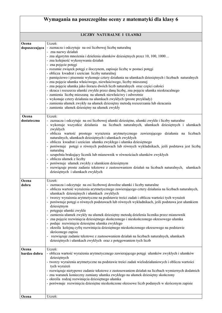 Wymagania na poszczególne oceny z matematyki dla klasy 6