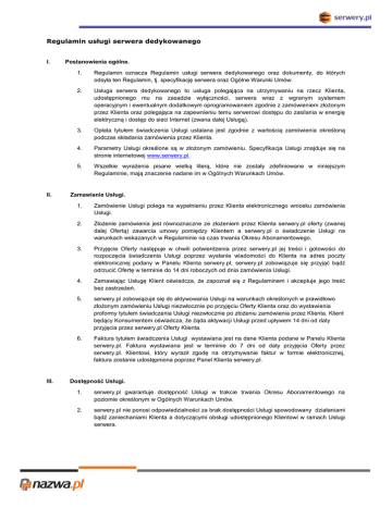 Regulamin usługi serwera dedykowanego I. II. III. 0000 Postanowienia ogólne. 1. Regulamin oznacza Regulamin usługi serwera dedykowanego oraz dokumenty, do których odsyła ten Regulamin, tj. specyfikację serwera oraz Ogólne Warunki Umów. 2. Usługa serwera dedykowanego to usługa polegająca na utrzymywaniu na rzecz Klienta, udostępnionego mu na zasadzie wyłączności, serwera wraz z wgranym systemem operacyjnym i ewentualnym dodatkowym oprogramowaniem zgodnie z zamówieniem złożonym przez Klienta oraz polegająca na zapewnieniu temu serwerowi dostępu do zasilania w energię elektryczną i dostęp do sieci Internet (zwana dalej Usługą). 3. Opłata tytułem świadczenia Usługi ustalana jest zgodnie z wartością zamówienia określoną podczas składania zamówienia przez Klienta. 4. Parametry Usługi określone są w złożonym zamówieniu. Specyfikacja Usługi znajduje się na stronie internetowej www.serwery.pl. 5. Wszelkie wyrażenia pisane wielką literą, które nie zostały zdefiniowane w niniejszym Regulaminie, mają znaczenie nadane im w Ogólnych Warunkach Umów. Zamawianie Usługi. 1. Zamówienie Usługi polega na wypełnieniu przez Klienta elektronicznego wniosku zamówienia Usługi. 2. Złożenie zamówienia jest równoznaczne ze złożeniem przez Klienta serwery.pl oferty (zwanej dalej Ofertą) zawarcia umowy pomiędzy Klientem a serwery.pl o świadczenie Usługi na warunkach wskazanych w Regulaminie na czas trwania Okresu Abonamentowego. 3. Przyjęcie Oferty następuje w chwili potwierdzenia przez serwery.pl jej treści i gotowości do rozpoczęcia świadczenia Usługi poprzez wysłanie wiadomości do Klienta na adres poczty elektronicznej podany w Panelu Klienta serwery.pl. serwery.pl zobowiązuje się przyjąć bądź odrzucić Ofertę w terminie do 14 dni roboczych od dnia zamówienia Usługi. 4. Zamawiając Usługę Klient oświadcza, że zapoznał się z Regulaminem i akceptuje jego treść bez zastrzeżeń. 5. serwery.pl zobowiązuje się do aktywowania Usługi na warunkach określonych w prawidłowo złożonym zamówieniu Usługi niezwłocznie po przyjęciu Oferty Klienta oraz do wystawienia proformy tytułem świadczenia Usługi niezwłocznie po złożeniu zamówienia przez Klienta. Klient będący Konsumentem oświadcza, że żąda aktywacji Usługi przed upływem 14 dni od daty przyjęcia przez serwery.pl Oferty Klienta. 6. Faktura tytułem świadczenia Usługi wystawiana jest na dane Klienta podane w Panelu Klienta serwery.pl. Faktura wystawiana jest w terminie do 7 dni od daty przyjęcia Oferty przez serwery.pl. Klientowi, który wyraził zgodę na otrzymywanie faktur w formie elektronicznej, faktura zostanie udostępniona poprzez Panel Klienta serwery.pl. Dostępność Usługi. 1. serwery.pl gwarantuje dostępność Usługi w trakcie trwania Okresu Abonamentowego na poziomie określonym w Ogólnych Warunkach Umów. 2. serwery.pl nie ponosi odpowiedzialności za brak dostępności Usługi spowodowany działaniami bądź zaniechaniami Klienta a dotyczącymi obsługi udostępnionego Klientowi w ramach Usługi serwera. Regulamin usługi serwera dedykowanego IV. Korzystanie z Usługi. 1. Korzystanie z Usługi podlega warunkom określonym w Ogólnych Warunkach Umów z dodatkowymi zastrzeżeniami i ograniczeniami wynikającymi z niniejszego Regulaminu. 2. Klient oświadcza, że posiada niezbędną wiedzę i doświadczenie w obsłudze serwerów lub korzysta z pomocy osób trzecich posiadających taką wiedzę i doświadczenie. 3. Klient zobowiązany jest do samodzielnego administrowania serwerem udostępnionym mu w ramach Usługi. Klient może zlecić obsługę serwera na własny koszt i ryzyko osobom trzecim. serwery.pl nie ponosi odpowiedzialności za skutki udostępnienia danych dostępowych do serwera osobom trzecim samodzielnie przez Klienta. 4. serwery.pl nie odpowiada za administrowanie serwerem. serwery.pl odpowiada za udostępnienie Klientowi infrastruktury technicznej z niezbędnym oprogramowaniem i usługami określonymi w specyfikacji Usługi. 5. W przypadku przekroczenia terminu płatności tytułem przedłużenia Usługi przez Klienta, dostęp do Usługi może zostać odblokowany do 5 dni od dnia jego zablokowania pod warunkiem zaksięgowania w tym okresie na rachunku bankowym serwery.pl opłaty tytułem przedłużenia Usługi. Brak wpłaty na rachunku bankowym serwery.pl tytułem świadczenia Usługi w kolejnym Okresie Abonamentowym do 5 dnia po zakończeniu poprzedniego Okresu Abonamentowego skutkować będzie usunięciem Usługi oraz usług dodatkowych zamówionych do tej Usługi wraz z danymi w ramach nich zgromadzonymi oraz rozwiązaniem umowy o świadczenie tej Usługi i usług dodatkowych. 6. Klient zobowiązany jest do: 7. V. 0000 a. samodzielnego zabezpieczenia zgromadzonych danych na serwerze poprzez wykonywanie kopii bezpieczeństwa tych danych w sposób przez siebie ustalony, b. zabezpieczenia serwera przed dostępem niepowołanych osób trzecich poprzez stosowanie aktualnych wersji oprogramowania instalowanego we własnym zakresie. Klient oświadcza, że: a. nie będzie wykorzystywał handlowych (spam), serwera do wysyłania niezamówionych informacji b. będzie posiadał niezbędne uprawnienia do korzystania z zainstalowanego we własnym zakresie oprogramowania na serwerze, c. nie będzie wykorzystywał serwera do atakowania bądź zakłócania pracy innych serwerów znajdujących się w sieci Internet lub sieci serwery.pl (np. ataki typu DOS). Postanowienia końcowe 1. Usługa może być świadczona wyłącznie Klientom, którzy korzystają z Panelu Klienta serwery.pl zgodnie z postanowieniami Ogólnych Warunków Umów. Warunkiem świadczenia Usługi przez serwery.pl na rzecz Klienta jest zaakceptowanie przez Klienta Ogólnych Warunków Umów. 2. W sprawach, które nie zostały uregulowane w Regulaminie mają zastosowanie postanowienia Ogólnych Warunków Umów. 3. Regulamin w wersji z dnia 18.12.2014 r.
