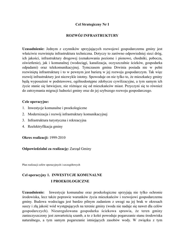 Cel Strategiczny Nr I ROZWÓJ INFRASTRUKTURY Uzasadnienie: Jednym z czynników sprzyjających rozwojowi gospodarczemu gminy jest właściwie rozwinięta infrastruktura techniczna. Dotyczy to zarówno odpowiedniej sieci dróg, ich jakości, infrastruktury drogowej (oznakowania poziome i pionowe, chodniki, pobocza, oświetlenie), jak i komunalnej (wodociągi, kanalizacja, oczyszczalnie ścieków, gospodarka odpadami) oraz telekomunikacyjnej. Tymczasem gmina Drwinia posiada nie w pełni rozwiniętą infrastrukturę i to w pewnym jest barierą w jej rozwoju gospodarczym. Tak więc rozwój infrastruktury jest niezwykle istotny. Spowoduje on nie tylko to, że mieszkańcy gminy będą wyposażeni w podstawowe, ogólnodostępne zdobycze cywilizacyjne, a tym samym ich życie stanie się łatwiejsze, nie różniące się od mieszkańców miast. Przyczyni się to również do zatrzymania migracji ludności gminy oraz do jej szybszego rozwoju gospodarczego. Cele operacyjne: 1. Inwestycje komunalne i proekologiczne 2. Modernizacja i rozwój infrastruktury komunikacyjnej 3. Infrastruktura turystyczna i rekreacyjna 4. Reelektryfikacja gminy Okres realizacji: 1999-2010 Odpowiedzialni za realizację: Zarząd Gminy Plan realizacji celów operacyjnych i szczegółowych Cel operacyjny 1. INWESTYCJE KOMUNALNE I PROEKOLOGICZNE Uzasadnienie: Inwestycje komunalne oraz proekologiczne sprzyjają nie tylko ochronie środowiska, lecz także poprawie warunków życia mieszkańców i rozwojowi gospodarczemu gminy. Budowa wodociągu jest bardzo pilnym zadaniem z uwagi na jej brak w okresach suszy i złą jakość wód występujących na terenie gminy (woda nie nadaje się nawet dla celów gospodarczych). Nieuregulowana gospodarka ściekowa sprawia, że teren gminy zanieczyszczony jest zawartością szamb, a to z kolei powoduje pogarszanie stanu środowiska naturalnego, a tym samym pogarszanie istniejących zasobów wody. W związku z tym niezbędna jest budowa kanalizacji i oczyszczalni ścieków. Stale powiększa się ilość odpadów na terenie gminy, konieczna jest więc właściwa organizacja gospodarki odpadami. Oczekiwane efekty: Efekt podstawowy - ochrona środowiska naturalnego; Poprawa jakości wód gruntowych; Przyłącza wodociągowe do każdego gospodarstwa; Kanalizacja ściekowa; Oczyszczalnia ścieków; Beneficjenci: Mieszkańcy gminy; Podmioty gospodarcze; Okres realizacji: 1999-2010 Cele szczegółowe: 1.1. Rozbudowa wodociĄgu Zadania: 1.1.1. Dokończenie budowy magistrali wodnej; 1.1.2. Budowa sieci rozdzielczych w sołectwach 1.1.3. Wykonanie przyłączy domowych; Okres realizacji: 1999-2003 Niezbędne zasoby: a) posiadane w gminie: 15 km magistrali (ZUW Bochnia-Mikluszowice), projekt na budowę pozostałego odcinka magistrali, część środków budżetowych; b) potrzebne spoza gminy: projekt techniczny sieci rozdzielczej, środki finansowe; Odpowiedzialny za realizację: Zarząd Gminy we współpracy z komitetami budowy wodociągów; Plan finansowania: a) wartość przedsięwzięcia w cenach bieżących (jeśli możliwa do określenia): zgodnie z kosztorysem b) wielkość nakładów własnych (w % lub w zł): 30-50% c) wielkość środków spoza gminy (w % lub w zł): 50-70% 1.2. budowa kanalizacji Zadania: 1.2.1. Opracowanie projektu technicznego 1.2.2. Zgoda mieszkańców 1.2.3. Wykonanie zgodnie z projektem Okres realizacji: 2004-2010 Niezbędne zasoby: a) posiadane w gminie: b) potrzebne spoza gminy: środki finansowe Odpowiedzialny za realizację: Zarząd Gminy we współpracy z wiejskimi komitetami budowy kanalizacji Plan finansowania: a) wartość przedsięwzięcia w cenach bieżących (jeśli możliwa do określenia): zgodnie z kosztorysem b) wielkość nakładów własnych (w % lub w zł): 20-40% c) wielkość środków spoza gminy (w % lub w zł): 60-80% 1.3. budowa oczyszczalni ścieków Zadania: 1.3.1. Wykonanie projektów technicznych 1.3.2. Uzyskanie zgody właścicieli działek - wykup 1.3.3. Organizacja przetargu i wykonanie według projektu Okres realizacji: 2004-2010 Niezbędne zasoby: a) posiadane w gminie: b) potrzebne spoza gminy: środki finansowe Odpowiedzialny za realizację: Zarząd Gminy Plan finansowania: a) wartość przedsięwzięcia w cenach bieżących (jeśli możliwa do określenia): zgodnie z kosztorysem b) wielkość nakładów własnych (w % lub w zł): 20-30% c) wielkość środków spoza gminy (w % lub w zł): 70-80% 1.4. gospodarka odpadami Zadania: 1.4.1. Zawarcie umowy na wywóz odpadów na zorganizowane składowiska na terenie gmin ościennych; 1.4.2. Zwiększenie liczby kontenerów na odpady; 1.4.3. Segregacja odpadów; Rozważa się także możliwość zorganizowania wspólnego składowiska odpadów z inną gminą i prowadzenia tam selektywnej gospodarki. Okres realizacji: 2000-2002 Niezbędne zasoby: a) posiadane w gminie: część kontenerów (30 szt.) oraz 60 000 zł (w 1999 r.) b) potrzebne spoza gminy: kontrahent odbierający odpady lub w przypadku organizacji wspólnego składowiska odpadów - opracowanie dokumentacji technicznej Odpowiedzialny za realizację: Zarząd Gminy Plan finansowania: a) wartość przedsięwzięcia w cenach bieżących (jeśli możliwa do określenia): b) wielkość nakładów własnych (w % lub w zł): 60% c) wielkość środków spoza gminy (w % lub w zł): 40% Cel operacyjny 2. INFRASTRUKTURA KOMUNIKACYJNA Uzasadnienie: Rozwój gospodarczy gminy w dużym stopniu zależy od właściwej infrastruktury. Niezmiernie ważna jest zarówno odpowiednia sieć dróg, jak też jej jakość. Dzięki temu zwiększy się także bezpieczeństwo użytkowników dróg. Problemem gminy jest obecnie komunikacja zbiorowa - zarówno połączenia gminy z Krakowem, połączenia północno-wschodniej części gminy z Bochnią, jak i połączenia komunikacyjne wewnątrz gminy. Jednym z zadań powinno być też doskonalenie łączności telefonicznej. Oczekiwane efekty: Rozwój gospodarczy gminy; Zwiększenie bezpieczeństwa użytkowników dróg; 