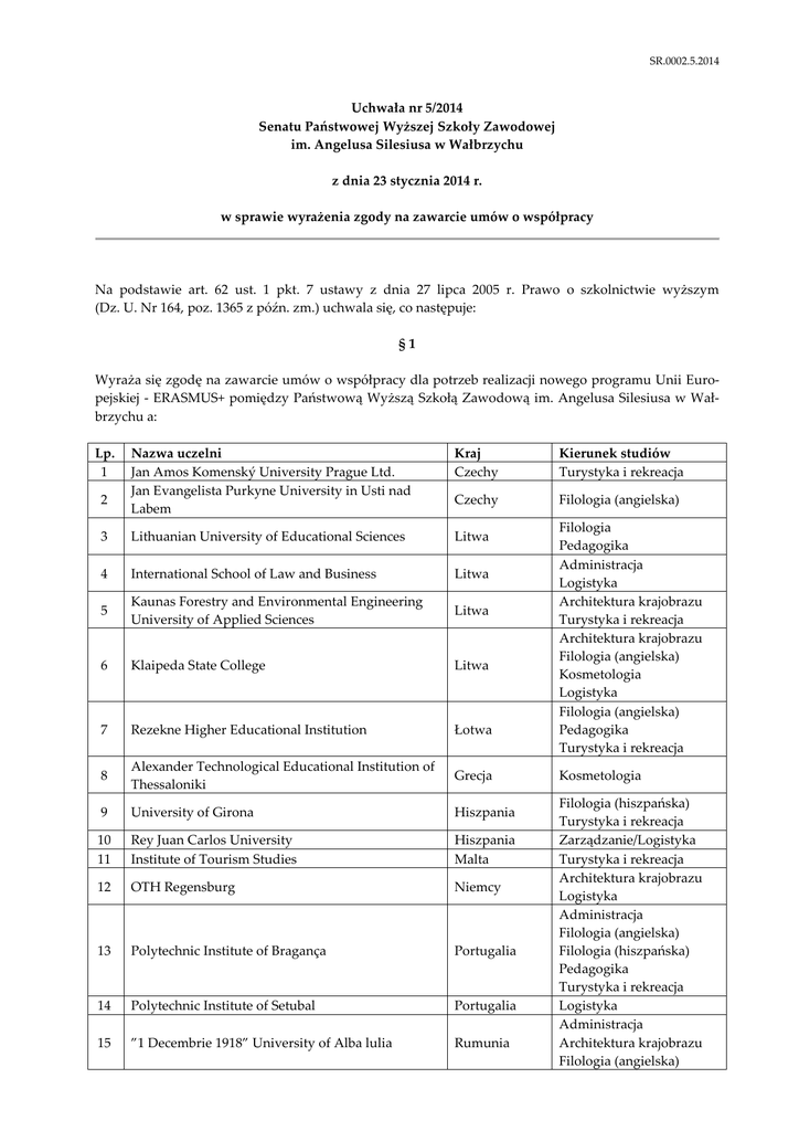 SR.0002.5.2014 Uchwała nr 5/2014 Senatu Państwowej Wyższej Szkoły Zawodowej im. Angelusa Silesiusa w Wałbrzychu z dnia 23 stycznia 2014 r. w sprawie wyrażenia zgody na zawarcie umów o współpracy Na podstawie art. 62 ust. 1 pkt. 7 ustawy z dnia 27 lipca 2005 r. Prawo o szkolnictwie wyższym (Dz. U. Nr 164, poz. 1365 z późn. zm.) uchwala się, co następuje: §1 Wyraża się zgodę na zawarcie umów o współpracy dla potrzeb realizacji nowego programu Unii Europejskiej - ERASMUS+ pomiędzy Państwową Wyższą Szkołą Zawodową im. Angelusa Silesiusa w Wałbrzychu a: Lp. 1 2 Nazwa uczelni Jan Amos Komenský University Prague Ltd. Jan Evangelista Purkyne University in Usti nad Labem Kraj Czechy Kierunek studiów Turystyka i rekreacja Czechy Filologia (angielska) 3 Lithuanian University of Educational Sciences Litwa 4 International School of Law and Business Litwa 5 Kaunas Forestry and Environmental Engineering University of Applied Sciences Litwa 6 Klaipeda State College Litwa 7 Rezekne Higher Educational Institution Łotwa 8 Alexander Technological Educational Institution of Thessaloniki Grecja 9 University of Girona Hiszpania 10 11 Rey Juan Carlos University Institute of Tourism Studies Hiszpania Malta 12 OTH Regensburg Niemcy 13 Polytechnic Institute of Bragança Portugalia 14 Polytechnic Institute of Setubal Portugalia 15 ”1 Decembrie 1918” University of Alba lulia Rumunia Filologia Pedagogika Administracja Logistyka Architektura krajobrazu Turystyka i rekreacja Architektura krajobrazu Filologia (angielska) Kosmetologia Logistyka Filologia (angielska) Pedagogika Turystyka i rekreacja Kosmetologia Filologia (hiszpańska) Turystyka i rekreacja Zarządzanie/Logistyka Turystyka i rekreacja Architektura krajobrazu Logistyka Administracja Filologia (angielska) Filologia (hiszpańska) Pedagogika Turystyka i rekreacja Logistyka Administracja Architektura krajobrazu Filologia (angielska) 16 17 ”Constantin Brâncoveanu” University from Pitesti Slovak Medical University Rumunia Słowacja 18 Ondokuz Mayis University Turcja 19 20 21 Artvin Coruh University Ibrahim Cecen University of Agri Gaziosmanpasa University Turcja Turcja Turcja §2 Uchwała wchodzi w życie z dniem podjęcia. Turystyka i rekreacja Logistyka Kosmetologia Filologia Pedagogika Turystyka i rekreacja Architektura krajobrazu Administracja Filologia (angielska)