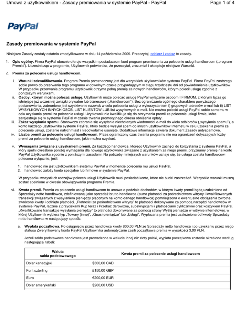 Umowa z użytkownikiem - Zasady premiowania w systemie PayPal - PayPal Page 1 of 4 Zasady premiowania w systemie PayPal Niniejsze Zasady zostały ostatnio zmodyfikowane w dniu 14 października 2009. Przeczytaj, pobierz i zapisz te zasady. 1. Opis ogólny. Firma PayPal obecnie oferuje wszystkim posiadaczom kont program premiowania za polecenie usługi handlowcom („program Premia”). Uczestnicząc w programie, Użytkownik potwierdza, że przeczytał, zrozumiał i akceptuje niniejsze Warunki. 2. Premia za polecenie usługi handlowcom. i. ii. iii. iv. v. Warunki zakwalifikowania. Program Premia przeznaczony jest dla wszystkich użytkowników systemu PayPal. Firma PayPal zastrzega sobie prawo do przerwania tego programu w dowolnym czasie przypadającym w ciągu trzydziestu dni od powiadomienia użytkowników. W przypadku przerwania programu Użytkownik otrzyma pełną premię za nowych handlowców, którym polecił usługę zgodnie z poniższymi warunkami. Osoby, którym można polecać usługę. Użytkownik może polecać usługę PayPal wyłącznie osobom I FIRMOM, z którymi łączą go istniejące już wcześniej związki prywatne lub biznesowe („Handlowcom”). Bez ograniczania ogólnego charakteru powyższego postanowienia, zabronione jest uzyskiwanie nazwisk w celu polecenia usługi z wykorzystaniem i) grupowych adresów e-mail lub ii) LIST WYSYŁKOWYCH INNYCH OSÓB, LIST KLIENTÓW LUB list wysyłkowych e-mail. Nie można polecić usługi PayPal sobie samemu w celu uzyskania premii za polecenie usługi. Użytkownik nie kwalifikuje się do otrzymania premii za polecenie usługi firmie, która zarejestruje się w systemie PayPal w czasie trwania promocyjnego okresu obniżenia opłaty. Zakaz wysyłania spamu. Stanowczo zabrania się wysyłania niechcianych wiadomości e-mail do wielu odbiorców („wysyłania spamu”), a konto każdego użytkownika systemu PayPal, który będzie wysyłał spam do innych użytkowników Internetu w celu uzyskania premii za polecenie usługi, zostanie natychmiast i nieodwołalnie usunięte. Dodatkowe informacje zawiera dokument Zasady antyspamowe. Liczba premii za polecenie usługi handlowcom. Przez ograniczony czas trwania programu nie ma ograniczeń dotyczących liczby premii za polecenie usługi handlowcom, jakie można uzyskać. Wymagania związane z uzyskaniem premii. Za każdego handlowca, którego Użytkownik zachęci do korzystania z systemu PayPal, a który spełni określone poniżej wymagania dla nowego użytkownika związane z uzyskaniem za niego premii, przyznamy premię na konto PayPal Użytkownika zgodnie z poniższymi zasadami. Na potrzeby niniejszych warunków uznaje się, że usługa została handlowcowi polecona wyłącznie, jeśli: 1. 2. handlowiec nie jest użytkownikiem systemu PayPal w momencie polecenia mu usługi PayPal, handlowiec założy konto specjalne lub firmowe w systemie PayPal. W przypadku wszystkich rodzajów poleceń usługi Użytkownik musi posiadać konto, które nie budzi zastrzeżeń. Wszystkie warunki muszą zostać spełnione w okresie obowiązywania programu Premia. vi. Kwota premii. Premia za polecenie usługi handlowcom to umowa o podziale dochodów, w którym kwoty premii będą uzależnione od Sprzedaży netto handlowca, zdefiniowanej jako sprzedaż brutto handlowca (suma płatności za pośrednictwem witryny i kwalifikowanych transakcji związanych z wysyłaniem pieniędzy płaconych na konto danego handlowca) pomniejszona o ewentualne obciążenia zwrotne, zwrócone kwoty i cofnięte płatności. „Płatności za pośrednictwem witryny” to płatności dokonywane za pomocą narzędzi handlowców w systemie PayPal, łącznie z przyciskami Kup teraz i Przekaż darowiznę, subskrypcjami i płatnościami cyklicznymi oraz koszykiem PayPal. „Kwalifikowane transakcje wysyłania pieniędzy” to płatności dokonywane za pomocą strony Wyślij pieniądze w witrynie internetowej, w której Użytkownik wybiera typ „Towary (inne)”, „Quasi-pieniądze” lub „Usługi”. Wypłacana premia jest uzależniona od kwoty Sprzedaży netto handlowca w następujący sposób: a. Wypłata początkowa. Po osiągnięciu przez handlowca kwoty 800,00 PLN ze Sprzedaży netto handlowca i po uzyskaniu przez niego statusu Zweryfikowany konto PayPal Użytkownika automatycznie zasili początkowa premia w wysokości 3,00 PLN. Jeżeli saldo podstawowe handlowca jest prowadzone w walucie innej niż złoty polski, wypłata początkowa zostanie określona według następującej tabeli: Waluta salda podstawowego Kwota premii za polecenie usługi handlowcom Dolar kanadyjski $300,00 CAD Funt szterling £150,00 GBP Euro €200,00 EUR Dolar amerykański $200,00 USD Umowa z użytkownikiem - Zasady premiowania w systemie PayPal - PayPal b. Jen japoński ¥20 000 JPY Dolar australijski $200,00 AUD Frank szwajcarski 300,00 CHF Korona norweska 1 600,00 NOK Korona szwedzka 2 000,00 SEK Korona duńska 1 500,00 DKK Forint węgierski 55 000 HUF Korona czeska 6 000,00 CZK Dolar singapurski $400,00 SGD Dolar hongkoński $1 900,00 HKD Dolar nowozelandzki $380,00 NZD Peso meksykańskie 22 000,00 MXN Nowy szekel izraelski 800,00 ILS Nowy dolar tajwański: 6600,00 TWD Bat tajlandzki: 7200,00 THB Peso filipińskie: 10 000,00 PHP Real brazylijski: 400,00 BRL Peso argentyńskie: 600,00 ARS Page 2 of 4 Jeżeli saldo podstawowe Użytkownika jest prowadzone w walucie innej niż złoty polski, przyznana mu wypłata początkowa zostanie określona według następującej tabeli: Waluta salda podstawowego Polecenie usługi handlowcom Kwota premii Dolar kanadyjski $1,50 CAD Funt szterling £0,50 GBP Euro €1,00 EUR Dolar amerykański $1,00 USD Jen japoński ¥100 JPY Dolar australijski $1,00 AUD Frank szwajcarski 1,30 CHF Korona norweska 6,75 NOK Korona szwedzka 9,00 SEK Korona duńska 6,00 DKK Forint węgierski 210 HUF Korona czeska 24,00 CZK Dolar singapurski $1,60 SGD Dolar hongkoński $7,00 HKD Umowa z użytkownikiem - Zasady premiowania w systemie PayPal 