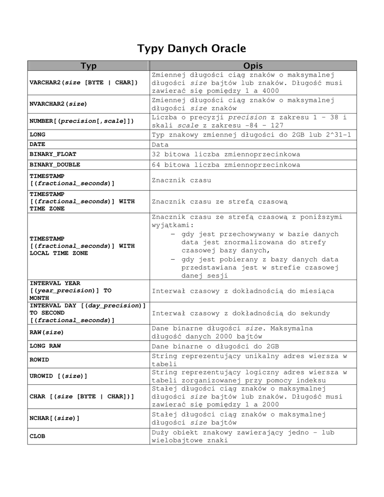 Typy Danych Oracle