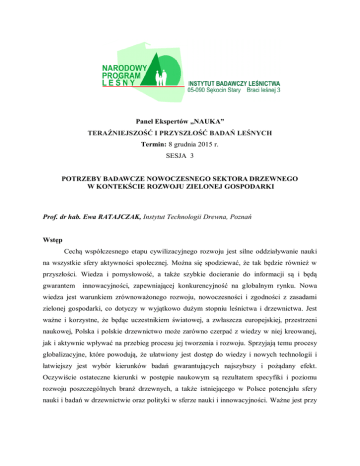 Panel Ekspertów „NAUKA” TERAŹNIEJSZOŚĆ I PRZYSZŁOŚĆ BADAŃ LEŚNYCH Termin: 8 grudnia 2015 r. SESJA 3 POTRZEBY BADAWCZE NOWOCZESNEGO SEKTORA DRZEWNEGO W KONTEKŚCIE ROZWOJU ZIELONEJ GOSPODARKI Prof. dr hab. Ewa RATAJCZAK, Instytut Technologii Drewna, Poznań Wstęp Cechą współczesnego etapu cywilizacyjnego rozwoju jest silne oddziaływanie nauki na wszystkie sfery aktywności społecznej. Można się spodziewać, że tak będzie również w przyszłości. Wiedza i pomysłowość, a także szybkie docieranie do informacji są i będą gwarantem innowacyjności, zapewniającej konkurencyjność na globalnym rynku. Nowa wiedza jest warunkiem zrównoważonego rozwoju, nowoczesności i zgodności z zasadami zielonej gospodarki, co dotyczy w wyjątkowo dużym stopniu leśnictwa i drzewnictwa. Jest ważne i korzystne, że będąc uczestnikiem światowej, a zwłaszcza europejskiej, przestrzeni naukowej, Polska i polskie drzewnictwo może zarówno czerpać z wiedzy w niej kreowanej, jak i aktywnie wpływać na przebieg procesu jej tworzenia i rozwoju. Sprzyjają temu procesy globalizacyjne, które powodują, że ułatwiony jest dostęp do wiedzy i nowych technologii i łatwiejszy jest wybór kierunków badań gwarantujących najszybszy i pożądany efekt. Oczywiście ostateczne kierunki w postępie naukowym są rezultatem specyfiki i poziomu rozwoju poszczególnych branż drzewnych, a także istniejącego w Polsce potencjału sfery nauki i badań w drzewnictwie oraz polityki w sferze nauki i innowacyjności. Ważne jest przy tym nie tylko kreowanie nowej wiedzy, ale także akceptacja społeczna dla preferowanych kierunków badań, zwłaszcza w przypadku ich finansowania ze środków publicznych. Celem opracowania jest identyfikacja potrzeb badawczych polskiego sektora drzewnego zwiększających jego innowacyjność, z uwzględnieniem kontekstu zielonej gospodarki. Jednak o potrzebach badawczych przemysłu można mówić zasadniczo w odniesieniu do krótkiego horyzontu czasu (3-5 lat), w długiej perspektywie są one zawsze odzwierciedleniem potrzeb społecznych, dlatego powinno się raczej mówić o pożądanych czy spodziewanych kierunkach/nurtach badań. Postawiony w tym opracowaniu problem rozpatrywano na tle zmian w procesie kreowania postępu technicznego spowodowanych warunkami gospodarki opartej na wiedzy, roli nauki w budowie takiej gospodarki, zmian w procesie kreowania badań, makrotrendów i wyzwań w sferze badawczej drzewnictwa oraz głównych warunków sukcesu w tej dziedzinie. Wskazano też pożądane kierunki badań ekonomicznych w drzewnictwie, jako dyscyplinie naukowej odzwierciedlającej wszystkie aspekty funkcjonowania i rozwoju sektora drzewnego. W opracowaniu wykorzystano zasadniczo wiedzę wynikającą z własnych zainteresowań naukowych, udziału w krajowych i międzynarodowych gremiach kreujących systemy i programy badawcze w drzewnictwie i jego otoczeniu, a także z realizacji projektu o charakterze foresightu technologicznego w drzewnictwie (Ratajczak 2010, 2010a, 2010b, 2010d, 2011). Nowa rola nauki w gospodarce opartej na wiedzy Koncepcja gospodarki opartej na wiedzy wywodzi się z relatywnie nowego w ekonomii paradygmatu rozwoju gospodarczego, w którym za kluczowe stymulatory rozwoju przyjmuje się kapitał społeczny i rozwiązania instytucjonalne (Pakulska, Poniatowska-Jaksch 2009, s. 193-204). Efektem takiego podejścia jest uznanie wiedzy za czynnik sprawczy rozwoju społeczeństw i gospodarek. Cechą gospodarki opartej na wiedzy jest coraz większa skala wykorzystywania wartości pozamaterialnych (wiedzy, technik informatycznych) w miejsce surowców i energii. Doprowadziło to do sformułowania poglądu o końcu epoki tradycyjnego przemysłu i powstawaniu społeczeństwa postindustrialnego. W ostatnim czasie dostrzega się jednak potrzebę powrotu do uznania przemysłu jako ważnej części współczesnej gospodarki (koncepcja reindustrializacji). Chodzi przy tym o przemysł nowoczesny, na miarę potrzeb społeczeństwa XXI wieku. Cechą zachodzących przekształceń jest stosowanie na niespotykaną dotychczas skalę technik informatycznych i komunikacyjnych jako narzędzi zdobywania wiedzy i 2 wspomagania wszelkich działań, dlatego często dla opisu nowych zjawisk zamiennie traktuje się terminy: gospodarka oparta na wiedzy (knowledge-based economy), gospodarka cyfrowa czy elektroniczna (digital economy) lub gospodarka sieciowa (network economy), chociaż poszczególne pojęcia różnią się zakresem i intensywnością opisywanych zmian (Woroniecki 2001, s. 48). W Europie za bardziej adekwatne do występujących procesów i przeobrażeń uważa się pojęcie gospodarki opartej na wiedzy, a do jej głównych fundamentów zalicza się (Kukliński 2001, s. 15): - nową interpretację roli nauki i badań we współczesnych społeczeństwach (wytwarzanie wiedzy jest procesem coraz bardziej społecznie rozproszonym - nauka nie jest już wyłącznie w gestii specjalnych instytucji), - nową integrację teorii procesów tworzenia i dyfuzji innowacji (złożony mechanizm społeczny w miejsce jednego aktu twórczego; zasada interaktywnego modelu innowacji zamiast linearnego modelu nauki i technologii), - nową teorię rozwoju gospodarczego uznającą wiedzę za najważniejszy endogeniczny czynnik produkcji. Wiedza i umiejętności wsparte nowoczesnymi technikami komunikacji i globalnymi sieciami informatycznymi przyczyniają się do wzrostu znaczenia indywidualizmu (przedsiębiorczości) i odpowiedzialności własnej, w tym również znaczenia firm małych (nawet jednoosobowych) kosztem przedsiębiorstw większych. Jednocześnie, zaawansowane techniki informatyczne i komunikacyjne pozwalające na zachowanie zasady przejrzystości cen w skali światowej (powszechny i szybki dostęp do informacji o nich) umacniają pozycję nabywców i powodują dużą konkurencję cenową. Nasilona konkurencja stymuluje z kolei wzrost zainteresowania wprowadzaniem inno