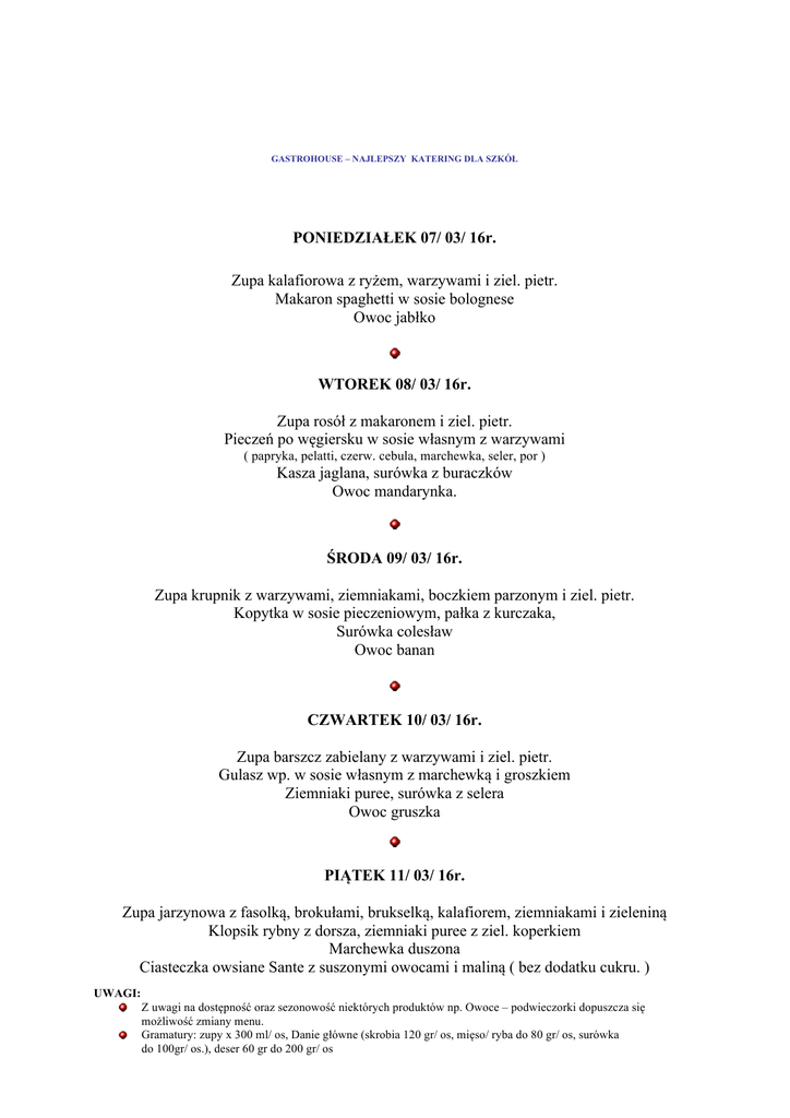 GASTROHOUSE – NAJLEPSZY KATERING DLA SZKÓŁ PONIEDZIAŁEK 07/ 03/ 16r. Zupa kalafiorowa z ryżem, warzywami i ziel. pietr. Makaron spaghetti w sosie bolognese Owoc jabłko WTOREK 08/ 03/ 16r. Zupa rosół z makaronem i ziel. pietr. Pieczeń po węgiersku w sosie własnym z warzywami ( papryka, pelatti, czerw. cebula, marchewka, seler, por ) Kasza jaglana, surówka z buraczków Owoc mandarynka. ŚRODA 09/ 03/ 16r. Zupa krupnik z warzywami, ziemniakami, boczkiem parzonym i ziel. pietr. Kopytka w sosie pieczeniowym, pałka z kurczaka, Surówka colesław Owoc banan CZWARTEK 10/ 03/ 16r. Zupa barszcz zabielany z warzywami i ziel. pietr. Gulasz wp. w sosie własnym z marchewką i groszkiem Ziemniaki puree, surówka z selera Owoc gruszka PIĄTEK 11/ 03/ 16r. Zupa jarzynowa z fasolką, brokułami, brukselką, kalafiorem, ziemniakami i zieleniną Klopsik rybny z dorsza, ziemniaki puree z ziel. koperkiem Marchewka duszona Ciasteczka owsiane Sante z suszonymi owocami i maliną ( bez dodatku cukru. ) UWAGI: Z uwagi na dostępność oraz sezonowość niektórych produktów np. Owoce – podwieczorki dopuszcza się możliwość zmiany menu. Gramatury: zupy x 300 ml/ os, Danie główne (skrobia 120 gr/ os, mięso/ ryba do 80 gr/ os, surówka do 100gr/ os.), deser 60 gr do 200 gr/ os GASTROHOUSE – NAJLEPSZY KATERING DLA SZKÓŁ PONIEDZIAŁEK 14/ 03/ 16r. Zupa pomidorowa z ryżem, warzywami i ziel. pietr. Pierożki Tortelini z mięsem, brokułami w sosie śmietanowym Owoc jabłko WTOREK 15/ 03/ 16r. Zupa brokułowa z warzywami, ziemniakami i ziel. pietr. Pulpeciki wp. w sosie koperkowym, kasza pęczak Surówka z marchewki Owoc mandarynka. ŚRODA 16/ 03/ 16r. Zupa gulaszowa z kurczakiem, ziel. groszkiem, ziemniakami i ziel. pietruszką Pierogi z jagodami i twarogiem/ sos jogurtowy ( osobno ) Owoc banan CZWARTEK 17/ 03/ 16r. Zupa żurek staropolski z jajkiem, warzywami i ziel. pietruszką Roladka drobiowo szpinakowa w sosie holenderskim, puree ziemniaczane Surówka z buraczków Owoc melon PIĄTEK 18/ 03/ 16r. Zupa marchwianka z ziemniakami i ziel. pietr. Pulpety rybne z dorsza w sosie cytrynowym, ziemniaki puree z ziel. koperkiem Surówka z tartego kalafiora i marchewki Ciastko jabłecznik ( obniżona zaw. Cukru ) UWAGI: Z uwagi na dostępność oraz sezonowość niektórych produktów np. Owoce – podwieczorki dopuszcza się możliwość zmiany menu. Gramatury: zupy x 300 ml/ os, Danie główne (skrobia 120 gr/ os, mięso/ ryba do 80 gr/ os, surówka do 100gr/ os.), deser 60 gr do 200 gr/ os GASTROHOUSE – NAJLEPSZY KATERING DLA SZKÓŁ PONIEDZIAŁEK 21/ 03/ 16r. Zupa jarzynowa z fasolką, brokułami, brukselką, kalafiorem, ziemniakami i zieleniną Krokiety z mięsem, surówka z białej kapusty, kukurydzy i ogórka św. Owoc jabłko WTOREK 22/ 03/ 16r. Zupa rosół z makaronem, warzywami i ziel. pietr. Kotlecik zbójnicki w sosie letnim ( bakłażan, cukinia, cebula, warzywa ogrodowe ) Kasza jaglana, surówka z buraczków Owoc gruszka. ŚRODA 23/ 03/ 16r. Zupa z czerwonej soczewicy z warzywami i ziel. pietr. Kluski śląskie z sosem pieczeniowym, surówka z marchewki Owoc banan CZWARTEK 24/ 03/ 16r. Zupa kalafiorowa z warzywami, ziemniakami i ziel. pietruszką. Kotlecik pożarski drobiowy w sosie śmietanowym, ziemniaki puree Surówka z selera Owoc melon św. PIĄTEK 25/ 03/ 16r. ( WIELKI PIĄTEK ) Zupa ogórkowa z warzywami, ziemniakami i ziel. pietr. Paluszki rybne z fileta z mintaja, ziemniaki puree z ziel. koperkiem Fasolka szparagowa na parze Ciasteczka owsiane Sante z suszonymi owocami i wiśnią ( bez dodatku cukru. ) UWAGI: Z uwagi na dostępność oraz sezonowość niektórych produktów np. Owoce – podwieczorki dopuszcza się możliwość zmiany menu. Gramatury: zupy x 300 ml/ os, Danie główne (skrobia 120 gr/ os, mięso/ ryba do 80 gr/ os, surówka do 100gr/ os.), deser 60 gr do 200 gr/ os GASTROHOUSE – NAJLEPSZY KATERING DLA SZKÓŁ PONIEDZIAŁEK 28/ 03/ 16r. PONIEDZIAŁEK WIELKANOCNY WTOREK 29/ 03/ 16r. Zupa pomidorowa z zacierką i ziel. pietr. Potrawka z kurczakiem ( mięso duszone ) i warzywami ( fasolka szparag, brokuły, kukurydza, marchewka ) Ryż brązowy Owoc jabłko ŚRODA 30/ 03/ 16r. Zupa gulaszowa z kurczakiem, ziel. groszkiem, ziemniakami i ziel. pietruszką Naleśniki z twarogiem/ sos jogurtowy ( osobno ) Owoc banan CZWARTEK 31/ 03/ 16r. Zupa wiejska z warzywami, zielonym groszkiem i ziel. pietruszką ( mięso z łopatki wp. mielonej ) Gołąbek w sosie pomidorowym, ziemniaki puree Owoc melon św. PIĄTEK 01/ 03/ 16r. Zupa ogórkowa z warzywami, ziemniakami, ziel. pietruszką Zapiekany filet rybny z serem, ziemniaki puree z ziel. koperkiem Marchewka gotowana z zielonym groszkiem Ciastko marchewkowe ( obniżona zaw. Cukru ) UWAGI: Z uwagi na dostępność oraz sezonowość niektórych produktów np. Owoce – podwieczorki dopuszcza się możliwość zmiany menu. Gramatury: zupy x 300 ml/ os, Danie główne (skrobia 120 gr/ os, mięso/ ryba do 80 gr/ os, surówka do 100gr/ os.), deser 60 gr do 200 gr/ os