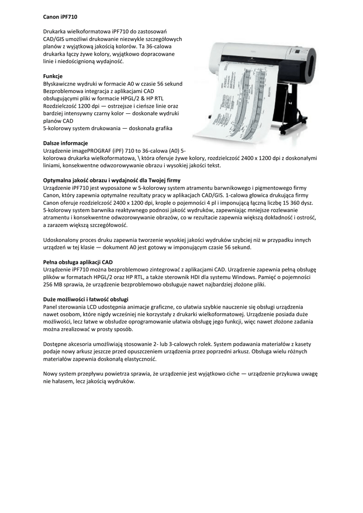 Canon iPF710 Drukarka wielkoformatowa iPF710 do zastosowao CAD/GIS umożliwi drukowanie niezwykle szczegółowych planów z wyjątkową jakością kolorów. Ta 36-calowa drukarka łączy żywe kolory, wyjątkowo dopracowane linie i niedoścignioną wydajnośd. Funkcje Błyskawiczne wydruki w formacie A0 w czasie 56 sekund Bezproblemowa integracja z aplikacjami CAD obsługującymi pliki w formacie HPGL/2 & HP RTL Rozdzielczośd 1200 dpi — ostrzejsze i cieosze linie oraz bardziej intensywny czarny kolor — doskonałe wydruki planów CAD 5-kolorowy system drukowania — doskonała grafika Dalsze informacje Urządzenie imagePROGRAF (iPF) 710 to 36-calowa (A0) 5kolorowa drukarka wielkoformatowa, \ która oferuje żywe kolory, rozdzielczośd 2400 x 1200 dpi z doskonałymi liniami, konsekwentne odwzorowywanie obrazu i wysokiej jakości tekst. Optymalna jakośd obrazu i wydajnośd dla Twojej firmy Urządzenie iPF710 jest wyposażone w 5-kolorowy system atramentu barwnikowego i pigmentowego firmy Canon, który zapewnia optymalne rezultaty pracy w aplikacjach CAD/GIS. 1-calowa głowica drukująca firmy Canon oferuje rozdzielczośd 2400 x 1200 dpi, krople o pojemności 4 pl i imponującą łączną liczbę 15 360 dysz. 5-kolorowy system barwnika reaktywnego podnosi jakośd wydruków, zapewniając mniejsze rozlewanie atramentu i konsekwentne odwzorowywanie obrazów, co w rezultacie zapewnia większą dokładnośd i ostrośd, a zarazem większą szczegółowośd. Udoskonalony proces druku zapewnia tworzenie wysokiej jakości wydruków szybciej niż w przypadku innych urządzeo w tej klasie — dokument A0 jest gotowy w imponującym czasie 56 sekund. Pełna obsługa aplikacji CAD Urządzenie iPF710 można bezproblemowo zintegrowad z aplikacjami CAD. Urządzenie zapewnia pełną obsługę plików w formatach HPGL/2 oraz HP RTL, a także sterownik HDI dla systemu Windows. Pamięd o pojemności 256 MB sprawia, że urządzenie bezproblemowo obsługuje nawet najbardziej złożone pliki. Duże możliwości i łatwośd obsługi Panel sterowania LCD udostępnia animacje graficzne, co ułatwia szybkie nauczenie się obsługi urządzenia nawet osobom, które nigdy wcześniej nie korzystały z drukarki wielkoformatowej. Urządzenie posiada duże możliwości, lecz łatwe w obsłudze oprogramowanie ułatwia obsługę jego funkcji, więc nawet złożone zadania można zrealizowad w prosty sposób. Dostępne akcesoria umożliwiają stosowanie 2- lub 3-calowych rolek. System podawania materiałów z kasety podaje nowy arkusz jeszcze przed opuszczeniem urządzenia przez poprzedni arkusz. Obsługa wielu różnych materiałów zapewnia doskonałą elastycznośd. Nowy system przepływu powietrza sprawia, że urządzenie jest wyjątkowo ciche — urządzenie przykuwa uwagę nie hałasem, lecz jakością wydruków.