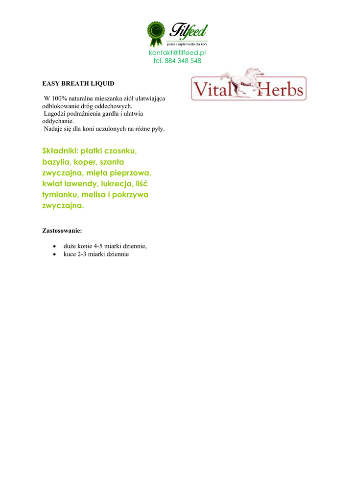 [email protected] tel. 884 348 548 EASY BREATH LIQUID W 100% naturalna mieszanka ziół ułatwiająca odblokowanie dróg oddechowych. Łagodzi podrażnienia gardła i ułatwia oddychanie. Nadaje się dla koni uczulonych na różne pyły. Składniki: płatki czosnku, bazylia, koper, szanta zwyczajna, mięta pieprzowa, kwiat lawendy, lukrecja, liść tymianku, melisa i pokrzywa zwyczajna. Zastosowanie: duże konie 4-5 miarki dziennie, kuce 2-3 miarki dziennie