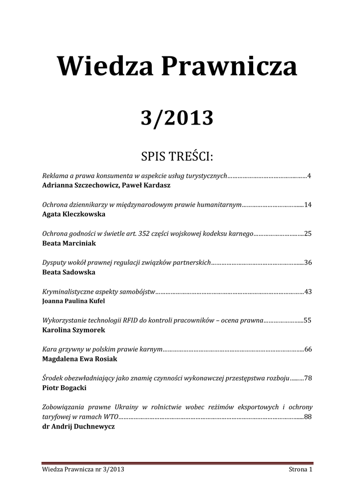 Wiedza Prawnicza 3/2013 SPIS TREŚCI: Reklama a prawa konsumenta w aspekcie usług turystycznych…………………………………..……4 Adrianna Szczechowicz, Paweł Kardasz Ochrona dziennikarzy w międzynarodowym prawie humanitarnym……………………………....14 Agata Kleczkowska Ochrona godności w świetle art. 352 części wojskowej kodeksu karnego……………………..….25 Beata Marciniak Dysputy wokół prawnej regulacji związków partnerskich……………………………………………....36 Beata Sadowska Kryminalistyczne aspekty samobójstw……………………………………………………………………………43 Joanna Paulina Kufel Wykorzystanie technologii RFID do kontroli pracowników – ocena prawna…………………...55 Karolina Szymorek Kara grzywny w polskim prawie karnym………………………………………………………………………..66 Magdalena Ewa Rosiak Środek obezwładniający jako znamię czynności wykonawczej przestępstwa rozboju…...…78 Piotr Bogacki Zobowiązania prawne Ukrainy w rolnictwie wobec reżimów eksportowych i ochrony taryfowej w ramach WTO……………………………………………………………………………………………....88 dr Andrij Duchnewycz Wiedza Prawnicza nr 3/2013 Strona 1 Międzynarodowe standardy w dziedzinie resocjalizacji niepełnoletnich osób płci żeńskiej……………………………………………………………………………………………………………………….....98 Natalia Karpińska O polu kryminalizacyjnym przy usiłowaniu nieudolnym z perspektywy braku przedmiotu nadającego się do popełnienia na nim czynu zabronionego………………………………………..…107 Marcin Berent Umieszczenie i opieka nad osobami psychicznie chorymi w Domach Pomocy Społecznej w świetle nowych regulacji prawnych…………………………………………………………………………..116 Monika Paczyńska Wiedza Prawnicza nr 3/2013 Strona 2 REDAKCJA I WYDAWNICTWO: 91-015 Łódź, ul. Gandhiego 20/29 REDAKTOR NACZELNY I WYDAWCA: Kamil Łukasz Deptuła SEKRETARZ REDAKCJI: Mariusz Wiesław Stobiecki (5318887780) KIEROWNIK SEKCJI PUBLIKACJI: Aleksandra Kwapiszewska CZŁONKOWIE KOLEGIUM REDAKCYJNEGO: Marcin Berent, Kamil Łukasz Deptuła, Mariusz Wiesław Stobiecki, Marcin Krzemiński, Bogusz Bomanowski KONSULTANT REDAKCJI ds. PRAWNYCH: Robert Teler ASYSTENCI MERYTORYCZNI: Szymon Drab, Wojciech Zwoliński, Aneta Sobczyk MIEJSCE I DATA WYDANIA NUMERU 3/2013: Łódź, 30 czerwca 2013 roku DRUK: Drukarnia Cyfrowa „PIKTOR” s.c. NUMER ISSN: 2080-4202 NUMER WPISU DO REJESTRU CZASOPISM:1095 ADRES INTERNETOWY: www.wiedzaprawnicza.pl ADRES E-MAIL: [email protected] RADA NAUKOWA: dr Michał Krakowiak, dr Paweł Baranowski, mec. Marcin Krzemiński Redakcja pragnie serdecznie podziękować za owocną współpracę i życzliwe uwagi wszystkim tym, którzy przyczynili się do rozwoju naszego czasopisma. Szczególne podziękowania kierujemy do: prof. dra hab. Mariana Filara, prof. dra hab. Krzysztofa Indeckiego, prof. dra hab. Zbigniewa Górala, prof. nadzw. dr hab. Ewy Olejniczak-Szałowskiej, prof. dr hab. Igora Jakusheva, dra Roberta Dziembowskiego, dra Marcina Kałduńskiego, dra Tomasza Bekrychta oraz dra Michała Kurowskiego. Wiedza Prawnicza nr 3/2013 Strona 3 Reklama a prawa konsumenta w aspekcie usług turystycznych Adrianna Szczechowicz, Paweł Kardasz Uwagi wstępne W ustawodawstwie polskim brak jest jednego aktu prawnego, który szczegółowo regulowałby pojęcie reklamy. W doktrynie panuje pogląd, iż reklama jest to jedna z form marketingowej prezentacji, odpłatna, a także zgodna z dobrymi obyczajami i prawem, prowadzona w celu zwięk- nia 2006 r. dotycząca reklamy wprowadzającej w błąd i reklamy porównawczej, zgodnie z którą reklama jest to przedstawienie w dowolnej formie w ramach działalności rzemieślniczej, gospodarczej, handlowej lub wykonywania wolnych zawodów w celu wsparcia zbycia towarów lub usług, w tym praw, zobowiązań oraz nieruchomości3. szenia lub utrzymania popytu na określone Odnosząc wyżej wskazane definicje towary lub usługi, mająca wpływ na decy- do usług turystycznych, reklamę należy zję potencjalnych nabywców za pomocą rozumieć szerzej. Pod pojęciem tym należy środków masowej komunikacji oraz innych rozumieć katalogi, foldery, broszury, foldery środków docierania w sposób zorganizo- oraz inne informacje pisemne zachęcające wany w interesie reklamodawcy1. do uczestnictwa w imprezie turystycznej Natomiast zgodnie z wyrokiem Sądu Najwyższego z dnia 26 stycznia 2006 r. reklamą jest każda wypowiedź skierowana do potencjalnych konsumentów, odnosząca się do towarów lub usług, a także przedsiębiorcy oferującego towary lub usługi, mająca na celu skłonienie oraz zachęcenie adresatów do nabywania towarów i korzystania z usług. Przy czym zachęta może być wyrażona bezpośrednio oraz pośrednio – przez stworzenie sugestywnego obrazu towarów lub do skorzystania z niniejszej usługi4. Powyższe stanowiska, dają możliwość wyróżnienia dwóch wyznaczników, pozwalających na uznanie określonej wypowiedzi za reklamę – celu przekazu oraz jego formy. Dokonanie ustalenia, w jakiej formie i celu rozpowszechnia się informacje o własnym przedsiębiorstwie, świadczonych usługach i produkowanych towarach, pozwala ocenić, czy możemy zakwalifikować dany przekaz jako reklamę5. lub usług2. Pojęcie reklamy definiuje rów- Natomiast nie każda reklama jest nież art. 2 dyrektywy 2006/114/WE Parla- zgodna z prawem i dobrymi obyczajami, mentu Europejskiego i Rady z dnia 12 grud- co zauważono już w XIX wieku. Konwencja M. Barańska, Reklama i jej ograniczenia, Warszawa 2011, s.24. 2 M. Sieradzka, Reklama aspekty prawne, red. M. Namysłowska, Warszawa 2012, s.118. 3 1 Wiedza Prawnicza nr 3/2013 Ibidem, s.117. K. Grzybczyk, Pra
