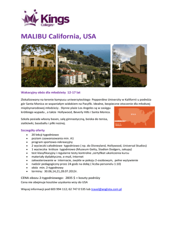 MALIBU California, USA Wakacyjny obóz dla młodzieży 12-17 lat Zlokalizowany na terenie kampusu uniwersyteckiego Pepperdine University w Kalifornii u podnóża gór Santa Monica ze wspaniałym widokiem na Pacyfik. Idealne, bezpieczne otoczenie dla młodszej międzynarodowej młodzieży . Słynne plaże Los Angeles są w zasięgu krótkiego wypadu , a także Hollywood, Beverly Hills i Santa Monica. Szkoła posiada własny basen, salę gimnastyczną, boiska do tenisa, siatkówki, baseballu i piłki nożnej. Szczegóły oferty 20 lekcji tygodniowo poziom zaawansowania min. A1 program sportowo-rekreacyjny 2 wycieczki całodniowe tygodniowo ( np. do Disneyland, Hollywood, Universal Studios) 1 wycieczka krótsze tygodniowo (Muzeum Getty, Stadion Dodgers, zakupy) test klasyfikacyjny i regularne testy kontrolne ,certyfikat ukończenia kursu materiały dydaktyczne, e-mail, Internet zakwaterowanie w internacie, zwykle w pokoju 2-osobowym, pełne wyżywienie nadzór pedagogiczny przez 24 godz na dobę ( liczba personelu 1:10) obóz min. 2-tygodnowy terminy: 30.06,14,21,28.07.2013r. CENA obozu 2-tygodniowego: 2835 $ + koszty podróży Cena nie obejmuje kosztów uzyskania wizy do USA Więcej informacji pod 603 994 112; 62 747 0 535 lub [email protected]
