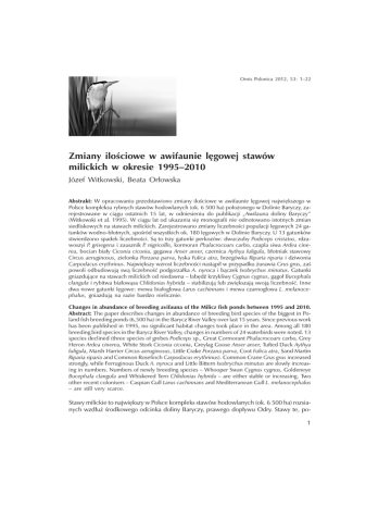 Ornis Polonica 2012, 53: 1–22 Zmiany ilościowe w awifaunie lęgowej stawów milickich w okresie 1995–2010 Józef Witkowski, Beata Orłowska Abstrakt: W opracowaniu przedstawiono zmiany ilościowe w awifaunie lęgowej największego w Polsce kompleksu rybnych stawów hodowlanych (ok. 6 500 ha) położonego w Dolinie Baryczy, zarejestrowane w ciągu ostatnich 15 lat, w odniesieniu do publikacji „Awifauna doliny Baryczy” (Witkowski et al. 1995). W ciągu lat od ukazania się monografii nie odnotowano istotnych zmian siedliskowych na stawach milickich. Zarejestrowano zmiany liczebności populacji lęgowych 24 gatunków wodno-błotnych, spośród wszystkich ok. 180 lęgowych w Dolinie Baryczy. U 13 gatunków stwierdzono spadek liczebności. Są to trzy gatunki perkozów: dwuczuby Podiceps cristatus, rdzawoszyi P. grisegena i zausznik P. nigricollis, kormoran Phalacrocoarx carbo, czapla siwa Ardea cinerea, bocian biały Ciconia ciconia, gęgawa Anser anser, czernica Aythya fuligula, błotniak stawowy Circus aeruginosus, zielonka Porzana parva, łyska Fulica atra, brzegówka Riparia riparia i dziwonia Carpodacus erythrinus. Największy wzrost liczebności nastąpił w przypadku żurawia Grus grus, zaś powoli odbudowują swą liczebność podgorzałka A. nyroca i bączek Ixobrychus minutus. Gatunki gniazdujące na stawach milickich od niedawna – łabędź krzykliwy Cygnus cygnus, gągoł Bucephala clangula i rybitwa białowąsa Chlidonias hybrida – stabilizują lub zwiększają swoją liczebność. Inne dwa nowe gatunki lęgowe: mewa białogłowa Larus cachinnans i mewa czarnogłowa L. melanocephalus, gniazdują na razie bardzo nielicznie. Changes in abundance of breeding avifauna of the Milicz fish ponds between 1995 and 2010. Abstract: The paper describes changes in abundance of breeding bird species of the biggest in Poland fish breeding ponds (6,500 ha) in the Barycz River Valley over last 15 years. Since previous work has been published in 1995, no significant habitat changes took place in the area. Among all 180 breeding bird species in the Barycz River Valley, changes in numbers of 24 waterbirds were noted. 13 species declined (three species of grebes Podiceps sp., Great Cormorant Phalacrocoarx carbo, Grey Heron Ardea cinerea, White Stork Ciconia ciconia, Greylag Goose Anser anser, Tufted Duck Aythya fuligula, Marsh Harrier Circus aeruginosus, Little Crake Porzana parva, Coot Fulica atra, Sand Martin Riparia riparia and Common Rosefinch Carpodacus erythrinus). Common Crane Grus grus increased strongly, while Ferruginous Duck A. nyroca and Little Bittern Ixobrychus minutus are slowly increasing in numbers. Numbers of newly breeding species – Whooper Swan Cygnus cygnus, Goldeneye Bucephala clangula and Whiskered Tern Chlidonias hybrida – are either stable or increasing. Two other recent colonisers – Caspian Gull Larus cachinnans and Mediterranean Gull L. melanocephalus – are still very scarce. Stawy milickie to największy w Polsce kompleks stawów hodowlanych (ok. 6 500 ha) rozsianych wzdłuż środkowego odcinka doliny Baryczy, prawego dopływu Odry. Stawy te, po1 dzielone na kilka kompleksów, wraz z otaczającymi je lasami i łąkami stanowią najważniejszą ostoję ptaków w południowo-zachodniej Polsce. Bogactwo tutejszej awifauny zwraca uwagę ornitologów od ponad 120 lat. Stąd unikalne dane umożliwiające porównywanie i wnioskowanie o zmianach w dużej skali czasowej. Celem niniejszej pracy jest prześledzenie zmian ilościowych w awifaunie tego obszaru w ciągu ostatnich 15 lat. Metody i teren badań Praca obejmuje obszar byłego powiatu milickiego (ok. 950 km ). Badania dotyczące większości omawianych niżej gatunków prowadzone były w latach 1995–2010, a tylko w przypadku kilku w latach 1995–2006. W niniejszym opracowaniu zaprezentowano zmiany ilościowe w odniesieniu do stanu z początku lat 1990. przedstawionych w monografii „Awifauna doliny Baryczy” (Witkowski et al. 1995). Szczególny nacisk położono na ptaki stawów, które zostały najlepiej zbadane. Ponieważ w ramach niniejszych badań nie prowadzono systematycznych obserwacji na niewielkich kompleksach stawów Zielony Dąb, Sanie i Marchwiska ujętych w poprzedniej monografii, dane z tych kompleksów wykluczono z analizy. Stąd, w przypadku niektórych gatunków wystąpiły niewielkie różnice w liczbie osobników czy par w wykresach i tabelach w porównaniu z wynikami opublikowanymi w monografii z roku 1995. Do analizy nie włączono również obserwacji z nowo zbudowanych stawów prywatnych w Rudzie Żmigrodzkiej. Pominięte w niniejszym opracowaniu stawy, ze względu na ich stosunkowo niewielką powierzchnię i walory siedliskowe, nie są istotne dla porównań i wniosków o zmianach liczebności omawianych gatunków ptaków na stawach milickich. Dane dotyczące liczebności populacji lęgowych, w zależności od specyfiki poszczególnych gatunków, zbierano trzema sposobami. W przypadku zausznika Podiceps nigricollis, kormorana Phalacrocorax carbo, czapli siwej Ardea cinerea, bociana białego Ciconia ciconia, łabędzia krzykliwego Cygnus cygnus, mew Laridae, rybitw Sternidae i brzegówki Riparia riparia wyszukiwano i liczono czynne gniazda, a w przypadku łabędzia krzykliwego i mewy białogłowej Larus cachinnans – także rodzin z młodymi. To samo dotyczyło perkoza rdzawoszyjego P. grisegena, choć niekiedy za parę lęgową przyjmowano kilkakrotne obserwacje pary w tym samym miejscu. Liczenia gniazd w koloniach prowadzono najczęściej, gdy zaczynały wykluwać się pierwsze pisklęta. Dla czterech gatunków liczebność oceniano na podstawie rejestrowanych głosów godowych terytorialnych samców. W przypadku bąka Botaurus stellaris, w ciągu kolejnych kontroli nanoszono na mapę buczące samce. Gdy na jakimś stawie zanotowano kilka stanowisk, podczas następnej kontroli starano się weryfikować ich rzeczywistą liczbę poprzez jednoczesne stwierdzenia. Podobnie po