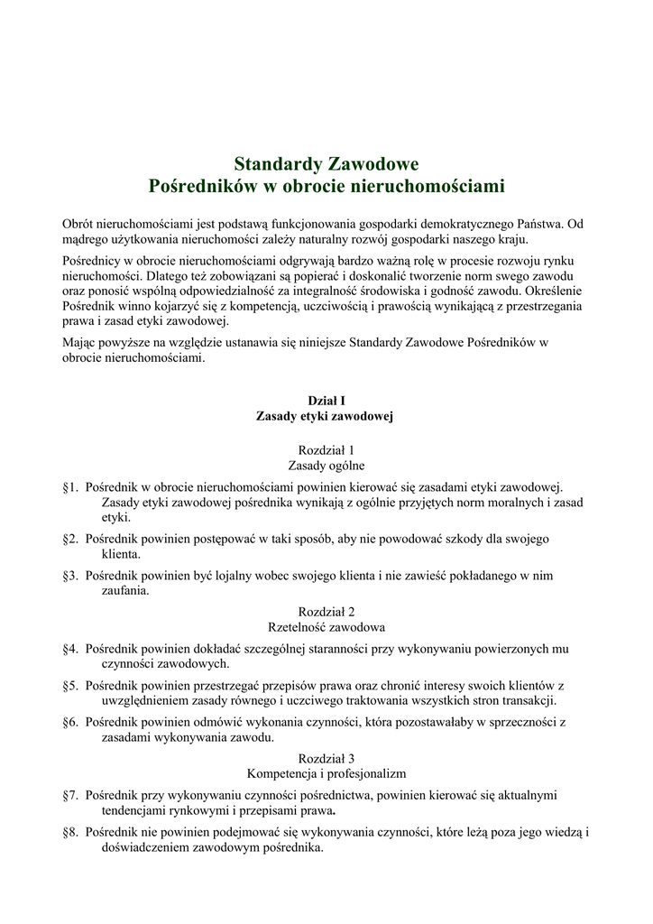 Standardy Zawodowe Pośredników w obrocie nieruchomościami Obrót nieruchomościami jest podstawą funkcjonowania gospodarki demokratycznego Państwa. Od mądrego użytkowania nieruchomości zależy naturalny rozwój gospodarki naszego kraju. Pośrednicy w obrocie nieruchomościami odgrywają bardzo ważną rolę w procesie rozwoju rynku nieruchomości. Dlatego też zobowiązani są popierać i doskonalić tworzenie norm swego zawodu oraz ponosić wspólną odpowiedzialność za integralność środowiska i godność zawodu. Określenie Pośrednik winno kojarzyć się z kompetencją, uczciwością i prawością wynikającą z przestrzegania prawa i zasad etyki zawodowej. Mając powyższe na względzie ustanawia się niniejsze Standardy Zawodowe Pośredników w obrocie nieruchomościami. Dział I Zasady etyki zawodowej Rozdział 1 Zasady ogólne §1. Pośrednik w obrocie nieruchomościami powinien kierować się zasadami etyki zawodowej. Zasady etyki zawodowej pośrednika wynikają z ogólnie przyjętych norm moralnych i zasad etyki. §2. Pośrednik powinien postępować w taki sposób, aby nie powodować szkody dla swojego klienta. §3. Pośrednik powinien być lojalny wobec swojego klienta i nie zawieść pokładanego w nim zaufania. Rozdział 2 Rzetelność zawodowa §4. Pośrednik powinien dokładać szczególnej staranności przy wykonywaniu powierzonych mu czynności zawodowych. §5. Pośrednik powinien przestrzegać przepisów prawa oraz chronić interesy swoich klientów z uwzględnieniem zasady równego i uczciwego traktowania wszystkich stron transakcji. §6. Pośrednik powinien odmówić wykonania czynności, która pozostawałaby w sprzeczności z zasadami wykonywania zawodu. Rozdział 3 Kompetencja i profesjonalizm §7. Pośrednik przy wykonywaniu czynności pośrednictwa, powinien kierować się aktualnymi tendencjami rynkowymi i przepisami prawa. §8. Pośrednik nie powinien podejmować się wykonywania czynności, które leżą poza jego wiedzą i doświadczeniem zawodowym pośrednika. Rozdział 4 Tajemnica zawodowa §9. Pośrednik powinien przestrzegać tajemnicy zawodowej obejmującej wszystko, czego dowiedział się w związku z wykonywaniem czynności pośrednictwa, a której ujawnienie osobom nieuprawnionym wiązałoby się z narażeniem na szkodę interes zamawiającego. Tajemnica nie obowiązuje przy przekazywaniu informacji niezbędnych dla właściwego wykonania usługi oraz informacji mogących mieć wpływ na bezpieczeństwo transakcji. Rozdział 5 Prestiż zawodu §10. Pośrednik powinien zapewnić, aby relacje z innymi pośrednikami były oparte na zasadach uczciwej konkurencji, lojalności i szacunku. §11. Pośrednik nie powinien zachowywać się w sposób godzący w interesy zatrudniającego go przedsiębiorcy. §12. Pośrednikowi nie wolno formułować fałszywych lub wprowadzających w błąd stwierdzeń dotyczących konkurentów, ich przedsiębiorców lub stosowanych przez nich praktyk zawodowych. §13. Pośrednik powinien wspierać działalność organizacji zawodowych i przyczyniać się do zapewnienia wysokiej pozycji zawodu. §14. Pośrednik powinien dążyć do wyeliminowania w swym otoczeniu praktyk sprzecznych z przepisami prawa, standardami zawodowymi lub uchybiających godności zawodu. §15. Pośrednik pełniący funkcje w organizacji zawodowej nie może wykorzystywać ich dla własnych korzyści. Dział II Standardy zawodowe §16. Pośrednik świadczy usługę tylko na podstawie zawartej z Zamawiającym pisemnej umowy pośrednictwa z podaniem numeru licencji zawodowej i informacji o ubezpieczeniu zawodowym OC. Zakres czynności pośrednictwa określa umowa. §17. Rola pośrednika polega na udzieleniu informacji w zakresie warunków ekonomicznorynkowych i sposobu realizacji zamówionej usługi, podjęciu czynności zmierzających do wyszukania kontrahenta, kojarzeniu stron, aranżowaniu oględzin nieruchomości, a także na życzenie klienta - na udziale w negocjacjach, pomocy przy finalizacji transakcji poprzez podjęcie czynności organizacyjnych, chyba, że umowa stanowi inaczej. §18. Pośrednik nie może odmówić świadczenia usług z powodów rasy, wyznania, płci lub narodowości. §19. Pośrednik zobowiązany jest zawsze ujawnić status pośrednika przy wykonywaniu czynności pośrednictwa. §20. Pośrednik nie może składać zamawiającemu nieprawdziwych oświadczeń dotyczących możliwej ceny sprzedaży lub czynszu najmu, reklamować do sprzedaży, wynajmu lub innego obrotu tych nieruchomości, co, do których nie zawarł uprzednio umowy pośrednictwa poza przypadkami, które wynikają ze szczególnych ustaleń między pośrednikami. §21. Jakiekolwiek ogłoszenie, druk, pisemna czy ustna informacja udzielona przez pośrednika powinna być zgodna ze znanym mu stanem faktycznym. §22. Pośrednik może wykonywać usługę pośrednictwa dla obu stron transakcji. §23. Pośrednikowi nie wolno oferować usług pośrednictwa przedstawiając je jako wolne od wynagrodzenia, co nie wyklucza pobierania wynagrodzenia wyłącznie od jednej strony transakcji. §24. Pośrednik powinien dążyć do zawierania umów z klauzulą wyłączności. Przez klauzulę wyłączności zamawiający powierza wykonywanie usługi pośrednictwa jedynie wybranemu przedsiębiorcy (pośrednikowi). §25. Przed zawarciem umowy pośrednictwa oraz w treści umowy z klauzulą wyłączności przedsiębiorca (pośrednik) zobowiązany jest do poinformowania zamawiającego o konsekwencjach wynikających z wpisania takiej klauzuli. §26. Przed zawarciem umowy pośrednictwa pośrednik ma obowiązek uzyskania od Zamawiającego informacji, czy nieruchomość nie jest przedmiotem zawartej uprzednio umowy z klauzulą wyłączności. §27. Pośrednik, który zawarł umowę pośrednictwa z klauzulą wyłączności, powinien dążyć do jak najszerszego uzasadnionego wyeksponowania nieruchomości i nie powinien utrudniać dostępu do informacji o nieruchomości, której dotyczy umo