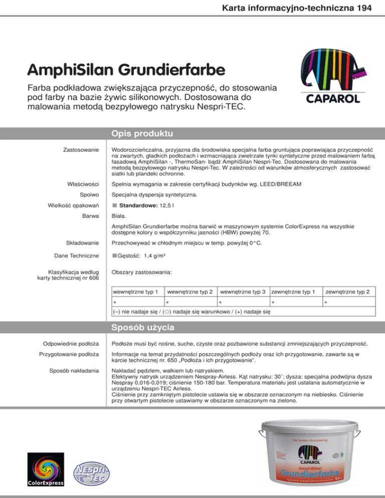 Karta informacyjno-techniczna 194 AmphiSilan Grundierfarbe Farba podkładowa zwiększająca przyczepność, do stosowania pod farby na bazie żywic silikonowych. Dostosowana do malowania metodą bezpyłowego natrysku Nespri-TEC. Opis produktu Zastosowanie Właściwości Spoiwo Wielkość opakowań Barwa Wodorozcieńczalna, przyjazna dla środowiska specjalna farba gruntująca poprawiająca przyczepność na zwartych, gładkich podłożach i wzmacniająca zwietrzałe tynki syntetyczne przed malowaniem farbą fasadową AmphiSilan -, ThermoSan- bądź AmphiSilan Nespri-Tec. Dostosowana do malowania metodą bezpyłowego natrysku Nespri-Tec. W zależności od warunków atmosferycznych zastosować siatki lub plandeki ochronne. Spełnia wymagania w zakresie certyfikacji budynków wg. LEED/BREEAM Specjalna dyspersja syntetyczna. ■ Standardowe: 12,5 l Biała. AmphiSilan Grundierfarbe można barwić w maszynowym systemie ColorExpress na wszystkie dostępne kolory o współczynniku jasności (HBW) powyżej 70. Składowanie Dane Techniczne Klasyfikacja według karty technicznej nr 606 Przechowywać w chłodnym miejscu w temp. powyżej 0°C. ■Gęstość: 1,4 g/m³ Obszary zastosowania: wewnętrzne typ 1 wewnętrzne typ 2 wewnętrzne typ 3 zewnętrzne typ 1 zewnętrzne typ 2 + + + + + (–) nie nadaje się / (○) nadaje się warunkowo / (+) nadaje się Sposób użycia Odpowiednie podłoża Przygotowanie podłoża Sposób nakładania Podłoże musi być nośne, suche, czyste oraz pozbawione substancji zmniejszających przyczepność. Informacje na temat przydatności poszczególnych podłoży oraz ich przygotowanie, zawarte są w karcie technicznej nr. 650 „Podłoża i ich przygotowanie”. Nakładać pędzlem, wałkiem lub natryskiem. Efektywny natrysk urządzeniem Nespray-Airless. Kąt natrysku: 30˚; dysza: specjalna podwójna dysza Nespray 0,016-0,019; ciśnienie 150-180 bar. Temperatura materiału jest ustalana automatycznie w urządzeniu Nespri-TEC Airless. Ciśnienie przy zamkniętym pistolecie ustawia się w obszarze oznaczonym na niebiesko. Ciśnienie przy otwartym pistolecie ustawiamy w obszarze oznaczonym na zielono. Karta informacyjno-techniczna 194 Układ warstw Zużycie Warunki obróbki Czas schnięcia Wskazówka AmphiSilan Grundierfarbe nakładać bez rozcieńczenia. Około 150-250 ml/m2 w zależności od stanu podłoża. Dokładne zużycie należy ustalić poprzez malowanie próbne. Minimalna temperatura stosowania: +5°C dla (otoczenia, podłoża i materiału). W temp. +20°C i względnej wilgotności powietrza 65% warstwa nadaje się do powtórnego malowania po 12 godz. W niższych temperaturach i przy wyższej wilgotności powietrza czasy te ulegają wydłużeniu. AmphiSilan Grundierfarbe nie należy stosować na powierzchniach poziomych narażonych na długotrwałe działanie wody. Aby zachować specjalne właściwości, nie mieszać z innymi materiałami. Producent nie ponosi odpowiedzialności za straty i szkody, w szczególności złą jakość wymalowania, będące wynikiem nieprzestrzegania zaleceń zawartych w tej karcie. Wskazówki Wskazówki bezpieczeństwa (stan na dzień wydania) Utylizacja Dopuszczalna zawartośc LZO Kod produktu farby i lakiery Bliższe informacje Doradztwo techniczne Infolinia Chronić przed dziećmi. Nie pić , nie jeść ani nie palić w trakcie używania produktu. Stosować wymagane środki ochrony indywidualnej. W PRZYPADKU KONTAKTU ZE SKÓRĄ: umyć dużą ilością wody. W PRZYPADKU DOSTANIA SIĘ DO OCZU: Ostrożnie płukać wodą przez kilka minut. Wyjąć soczewki kontaktowe, jeżeli są i można je łatwo usunąć. Unikać uwolnienia do środowiska. Do recycling oddawać wyłącznie opróżnione opakowania. Pozostałe resztki materiału utylizować jak odpady budowlane. Zgodnie z Dyrektywą UE wartość dopuszczalna maksymalnej zawartości LZO (lotnych związków organicznych) dla tego typu produktu (typ A/c) wynosi: 40 g/l (2010). Ten produkt zawiera maksymalnie 25 g/l LZO. M-GP01 Patrz karta charakterystyki. W karcie niniejszej niemożliwe jest opisanie sposobów przygotowania wszystkich występujących w praktyce podłoży. W przypadkach, które nie zostały opisane powyżej, pomocnym może okazać się kontakt z naszym Działem technicznym. Chętnie udzielimy Państwu szczegółowych informacji związanych z konkretnym obiektem. Doradztwo techniczne: Tel. (22) 544 20 40 Fax (22) 544 20 41 [email protected] Karta informacyjno-techniczna194, stan na listopad 2015 Niniejsza karta informacyjna została sporządzona na bazie najnowszych osiągnięć techniki i naszych doświadczeń. Ze względu na różnorodność możliwych podłoży i warunków wykonawstwa każdorazowy Kupujący / Użytkownik jest zobowiązany sprawdzić na własną odpowiedzialność przydatność naszych produktów do zamierzonego celu przy każdorazowym uwzględnieniu warunków obiektowych wykonawstwa oraz wymogów i zasad sztuki i rzemiosła. Po ukazaniu się następnej wersji niniejsza karta traci swoją ważność. Caparol Polska Sp. z o. o. · ul. Puławska 393 · PL – 02-801 Warszawa · tel. 022 544 20 40, faks 022 544 20 41 · internet: www.caparol.pl Caparol Farben Lacke Bautenschutz GmbH · Roßdörfer Straße 50 · D – 64372 Ober Ramstadt · tel. +49 6154 71-0, faks +49 6154 711391 · internet: www.caparol.de