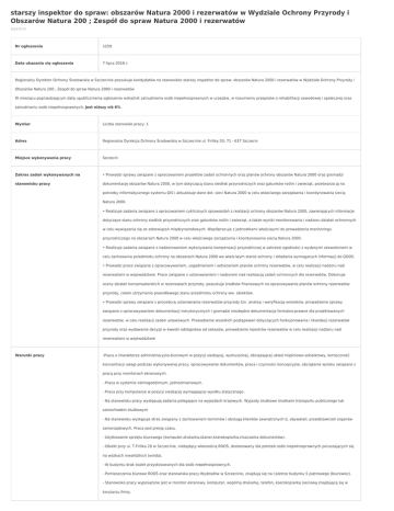 starszy inspektor do spraw: obszarów Natura 2000 i rezerwatów w Wydziale Ochrony Przyrody i Obszarów Natura 200 ; Zespół do spraw Natura 2000 i rezerwatów 2016-07-07 Nr ogłoszenia 1259 Data ukazania się ogłoszenia 7 lipca 2016 r. Regionalny Dyrektor Ochrony Środowiska w Szczecinie poszukuje kandydatów na stanowisko starszy inspektor do spraw: obszarów Natura 2000 i rezerwatów w Wydziale Ochrony Przyrody i Obszarów Natura 200 ; Zespół do spraw Natura 2000 i rezerwatów W miesiącu poprzedzającym datę upublicznienia ogłoszenia wskaźnik zatrudnienia osób niepełnosprawnych w urzędzie, w rozumieniu przepisów o rehabilitacji zawodowej i społecznej oraz zatrudnianiu osób niepełnosprawnych, jest niższy niż 6%. Wymiar Liczba stanowisk pracy: 1 Adres Regionalna Dyrekcja Ochrony Środowiska w Szczecinie ul. Firlika 20; 71 - 637 Szczecin Miejsce wykonywania pracy Szczecin Zakres zadań wykonywanych na • Prowadzi sprawy związane z opracowaniem projektów zadań ochronnych oraz planów ochrony obszarów Natura 2000 oraz gromadzi stanowisku pracy dokumentację obszarów Natura 2000, w tym dotyczącą stanu siedlisk przyrodniczych oraz gatunków roślin i zwierząt, przetwarza ją na potrzeby informatycznego systemu GIS i aktualizuje dane dot. sieci Natura 2000 w celu właściwego zarządzania i koordynowania siecią Natura 2000. • Realizuje zadania związane z opracowaniem cyklicznych sprawozdań z realizacji ochrony obszarów Natura 2000, zawierających informacje dotyczące stanu ochrony siedlisk przyrodniczych oraz gatunków roślin i zwierząt, a także wyniki monitorowania i nadzoru działań ochronnych w celu wywiązania się ze zobowiązań międzynarodowych. Współpracuje z jednostkami właściwymi do prowadzenia monitoringu przyrodniczego na obszarach Natura 2000 w celu właściwego zarządzania i koordynowania siecią Natura 2000. • Realizuje zadania związane z nadzorowaniem wykonywania kompensacji przyrodniczej w zakresie zgodności z wydanymi zezwoleniami w celu zachowania przedmiotu ochrony na obszarach Natura 2000 we właściwym stanie ochrony i składania wymaganych informacji do GDOS. • Prowadzi prace związane z opracowywaniem, uzgadnianiem i wdrażaniem planów ochrony rezerwatów, w celu realizacji nadzoru nad rezerwatami w województwie. Prace związane z ustanawianiem i nadzorem nad realizacją zadań ochronnych dla rezerwatów. Dokonuje oceny działań konserwatorskich w rezerwatach przyrody, poszukuje środków finansowych na opracowywanie planów ochrony rezerwatów przyrody, celem utrzymania prawidłowego stanu przedmiotu ochrony ww. obiektów. • Prowadzi sprawy związane z procedurą ustanawiania rezerwatów przyrody tzn. analizę i weryfikację wniosków, prowadzenie sprawy związane z opracowywaniem dokumentacji merytorycznych i gromadzi niezbędne dokumentacje formalno-prawne dla projektowanych rezerwatów, w celu realizacji zadań ustawowych. Prowadzenie wszelkich postępowań dotyczących funkcjonowania i likwidacji rezerwatów przyrody oraz wydawanie decyzji w kwestii odstępstwa od zakazów, prowadzenie rejestrów rezerwatów w celu realizacji nadzoru nad rezerwatami w województwie Warunki pracy -Praca o charakterze administracyjno-biurowym w pozycji siedzącej, wymuszonej, obciążającej układ mięśniowo-szkieletowy, konieczność koncentracji uwagi podczas wykonywanej pracy, opracowywanie dokumentów, praca i czynności koncepcyjne, obciążenie wzroku związane z pracą przy monitorach ekranowych. - Praca w systemie ośmiogodzinnym, jednozmianowym. - Praca przy komputerze w pozycji siedzącej wymagającej wysiłku statycznego. - Na stanowisku pracy występują zadania polegające na wyjazdach krajowych. Wyjazdy służbowe środkami transportu publicznego lub samochodem służbowym - Na stanowisku występuje stres związany z zachowaniem terminów i obsługą klientów zewnętrznych tj. obywateli, przedstawicieli organów samorządowych. Praca pod presją czasu. - Użytkowanie sprzętu biurowego (komputer,drukarka,skaner,kserokopiarka,niszczarka dokumentów). - Obiekt przy ul. T.Firlika 20 w Szczecinie, niebędący własnością RDOŚ, dostosowany dla potrzeb osób niepełnosprawnych poruszających się na wózkach inwalidzkich (winda), - W budynku brak toalet przystosowanych dla osób niepełnosprawnych. - Pomieszczenia biurowe RDOŚ oraz stanowiska pracy Wydziałów w Szczecinie, znajdują się na I pietrze budynku 5 piętrowego (biurowiec). - Stanowisko pracy wyposażone jest w monitor ekranowy, komputer, wspólną drukarkę, telefon, kserokopiarkę sieciową znajdującą się w korytarzu firmy. Wymagania związane ze stanowiskiem WYMAGANIA NIEZBĘDNE pracy • Wykształcenie: średnie • doświadczenie zawodowe: 6 miesięcy w pracy w administracji publicznej w obszarze ochrony przyrody lub środowiska • znajomość ustawy o ochronie przyrody oraz znajomość kpa,ogólna wiedza przyrodnicza, • umiejętność rozpoznawania gatunków podlegających ochronie i ich siedlisk, znajomość form ochrony przyrody, komunikatywność i umiejętność pracy w zespole, umiejętność organizacji pracy i umiejętność obsługi komputera • Posiadanie obywatelstwa polskiego • Korzystanie z pełni praw publicznych • Nieskazanie prawomocnym wyrokiem za umyślne przestępstwo lub umyślne przestępstwo skarbowe Wymagane dokumenty i oświadczenia WYMAGANIA DODATKOWE • Wykształcenie: wyższe profilowane z zakresu ochrony środowiska, przyrody lub leśne • doświadczenie zawodowe: 6 miesięcy w pracy w jednostkach zajmujących się ochroną przyrody lub środowiska • posiadanie prawa jady kat. B • umiejętność pracy z systemami GIS Inne dokumenty i oświadczenia DOKUMENTY I OŚWIADCZENIA NIEZBĘDNE • Życiorys/CV i list motywacyjny • Kopie dokumentów potwierdzających spełnienie wymagania niezbędnego w zakresie wykształcenia • Kopie dokumentów potwierdzających spełnienie wymagania niezbędnego w zakresie d
