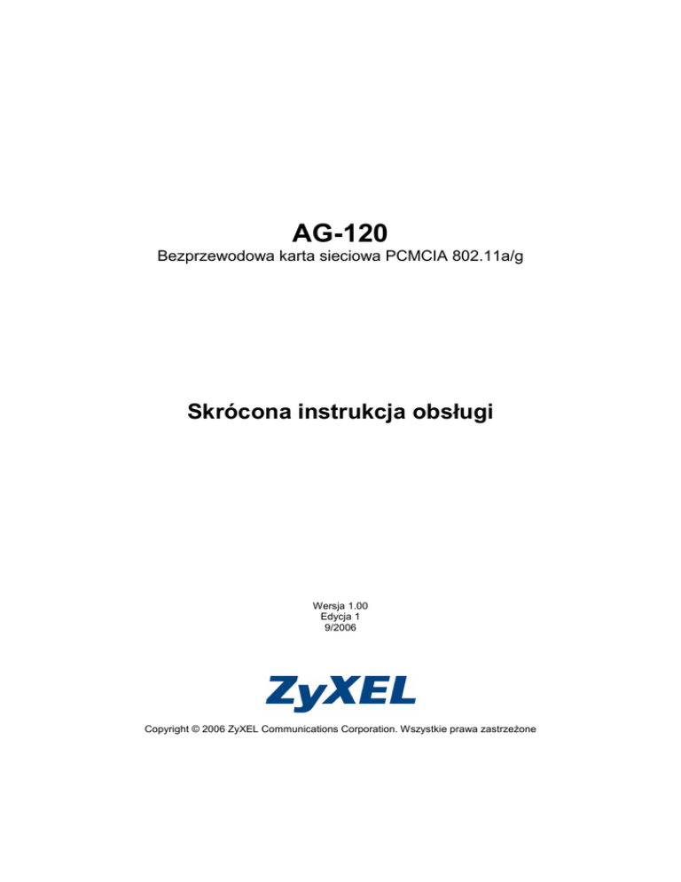 AG-120 Bezprzewodowa karta sieciowa PCMCIA 802.11a/g Skrócona instrukcja obsługi Wersja 1.00 Edycja 1 9/2006 Copyright © 2006 ZyXEL Communications Corporation. Wszystkie prawa zastrzeŜone ZyXEL ZyXEL AG-120 – informacje ZyXEL AG-120 to bezprzewodowa karta sieciowa, przeznaczona do komputerów przenośnych. Wymagania systemowe Zanim przystąpisz do instalacji, upewnij się, Ŝe Twój komputer jest zgodny z poniŜszymi wymaganiami: • • • • • • • procesor Pentium II 300 MHz lub szybszy; co najmniej 20 MB wolnego miejsca na dysku twardym; co najmniej 32 MB pamięci RAM; napęd CD-ROM; Gniazdo CardBus PCMCIA; Windows 98 Second Edition (SE), Windows ME, 2000 lub Windows XP; UŜytkownicy systemu Windows 98 mogą potrzebować płyty instalacyjnej Windows 98 Jeśli instalowałeś juŜ wcześniej na swoim komputerze oprogramowanie Funk Odyssey Client, naleŜy je odinstalować przed przystąpieniem do instalacji karty. Instalacja Jeśli chcesz korzystać z usługi konfiguracji zerowej sieci bezprzewodowej w systemie Windows XP, zobacz sekcję Uwaga dla uŜytkowników Windows XP. Procedura instalacji jest podobna dla wszystkich obsługiwanych wersji Windows. Oprogramowanie ZyXEL Utility naleŜy zainstalować przed włoŜeniem karty AG-120 do komputera. 1. WłóŜ znajdującą się w zestawie płytę CD do napędu CD-ROM w komputerze. Gdy pojawi się poniŜszy ekran, kliknij Setup (Konfiguracja). Jeśli ekran się nie pojawi, odszukaj na płycie plik autorun.exe i kliknij na nim dwukrotnie. 2. Wybierz wersję językową i kliknij Next (Dalej) -2- ZyXEL 3. Pojawi się poniŜszy ekran. Kliknij Next (Dalej). 4. Wybierz Driver and Utility aby zainstalować sterownik oraz program zarządzający na swoim komputerze. Jeśli chcesz zainstalować tylko sterownik i uŜywać aplikacji Windows Zero Configuration (WZC) w systemie Windows XP, wybierze Driver Only. Kliknij Next (Dalej) 5. 6. 7. 8. Kliknij Install (Instaluj), aby rozpocząć instalację. Kliknij Finish (Zakończ), aby ponownie uruchomić komputer. Odszukaj w swoim komputerze gniazdo do kart. Ustaw kartę w taki sposób, aby złącze było skierowane w stronę komputera, a strona z lampkami kontrolnymi w górę, a następnie wsuń AG-120 do gniazda. Jeśli karta zostanie włoŜona poprawnie, włączą się lampki kontrolne. Nigdy nie zginaj, nie uŜywaj siły i nie przekręcaj karty AG-120 podczas wkładania jej do gniazda. Po zainstalowaniu oprogramowania ZyXEL Utility i włoŜeniu karty AG-120 do gniazda, w zasobniku systemowym (zwykle na dole pulpitu) pojawi się ikona . -3- ZyXEL Jeśli ikona jest koloru zielonego i/lub widzisz poniŜszy dymek na swoim pulpicie, jesteś juŜ podłączony do sieci bezprzewodowej. Zapoznaj się z Podręcznikiem uŜytkownika, aby uzyskać informacje o konfiguracji zabezpieczeń lub podłączaniu do konkretnej sieci bezprzewodowej. Uwaga dla uŜytkowników Windows XP Jeśli chcesz korzystać z usługi konfiguracji zerowej sieci bezprzewodowej, wyłącz oprogramowanie ZyXEL (jeśli juŜ je zainstalowałeś) lub po prostu zainstaluj sam sterownik. • • Aby wyłączyć oprogramowanie ZyXEL, kliknij prawym klawiszem myszy na ikonie w zasobniku systemowym i wybierz opcję Use Windows Zero Configuration. Aby i kliknij OK. ponownie uaktywnić oprogramowanie ZyXEL, kliknij dwa razy na ikonie Aby zainstalować sam sterownik Odszukaj w swoim komputerze gniazdo do kart. Ustaw kartę w taki sposób, aby złącze było skierowane w stronę komputera, a strona z lampkami kontrolnymi w górę, a następnie wsuń AG-120 do gniazda. Jeśli karta zostanie włoŜona poprawnie, włączą się lampki kontrolne. Nigdy nie zginaj, nie uŜywaj siły i nie przekręcaj karty AG-120 podczas wkładania jej do gniazda. 1. Pojawi się okno kreatora Znaleziono nowy sprzęt. (W Windows XP SP2 wybierz Nie, nie tym razem i kliknij Dalej.) 2. Wybierz Zainstaluj z listy lub określonej lokalizacji (zaawansowane) i kliknij Dalej. 3. WłóŜ dołączoną do zestawu płytę CD do napędu CD-ROM, wybierz opcję Przeszukaj nośniki wymienne (dyskietka, dysk CD-ROM...) i kliknij Dalej. 4. Kliknij Zakończ na ostatnim ekranie kreatora, aby zakończyć instalację. Rozwiązywanie problemów • • • • Jeśli karta AG-120 nie pasuje do gniazda w komputerze, sprawdź jego specyfikację, aby upewnić się, Ŝe jest on wyposaŜony w gniazdo CardBus. Jeśli lampki na karcie AG-120 nie włączyły się po zainstalowaniu oprogramowania i karty, upewnij się, Ŝe karta jest prawidłowo włoŜona do gniazda. Jeśli nie pojawia się ikona Z, odinstaluj i ponownie zainstaluj oprogramowanie ZyXEL. Zapoznaj się z Podręcznikiem uŜytkownika, aby uzyskać opis odinstalowania programu. Jeśli karta AG-120 nie nawiązuje połączenia z siecią bezprzewodową, upewnij się, Ŝe w zasięgu karty dostępna jest taka sieć (zobacz informacje w Podręczniku uŜytkownika na temat funkcji analizy otoczenia (site survey)). Jeśli w danej sieci włączone są zabezpieczenia, konieczna będzie konfiguracja zabezpieczeń po strony karty AG-120 (zobacz Podręcznik uŜytkownika). -4- ZyXEL Aby obejrzeć certyfikaty produktu 1. Przejdź pod adres www.zyxel.com. 2. Wybierz produkt z listy rozwijanej na stronie głównej firmy ZyXEL, aby przejść do tego strony tego produktu. 3. Kliknij Ŝądany certyfikat, aby go obejrzeć. -5- ZyXEL -6-