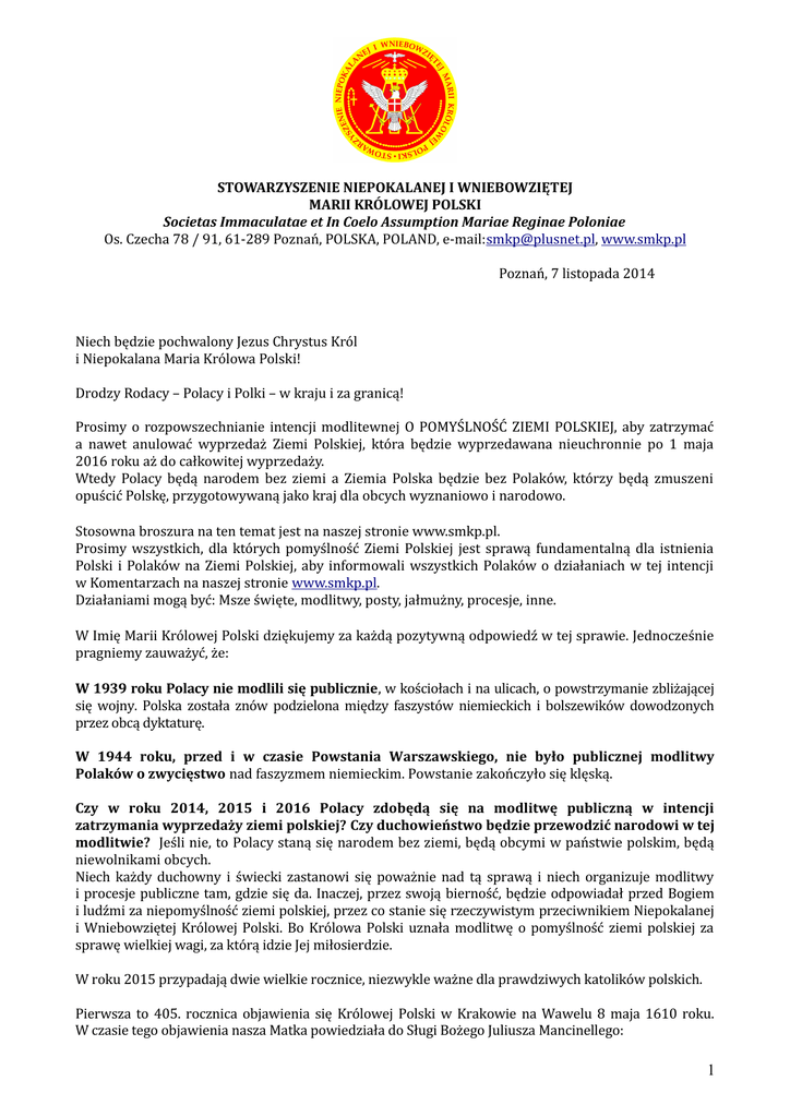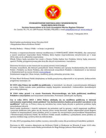STOWARZYSZENIE NIEPOKALANEJ I WNIEBOWZIĘTEJ MARII KRÓLOWEJ POLSKI Societas Immaculatae et In Coelo Assumption Mariae Reginae Poloniae Os. Czecha 78 / 91, 61-289 Poznań, POLSKA, POLAND, e-mail:[email protected], www.smkp.pl Poznań, 7 listopada 2014 Niech będzie pochwalony Jezus Chrystus Król i Niepokalana Maria Królowa Polski! Drodzy Rodacy – Polacy i Polki – w kraju i za granicą! Prosimy o rozpowszechnianie intencji modlitewnej O POMYŚLNOŚĆ ZIEMI POLSKIEJ, aby zatrzymać a nawet anulować wyprzedaż Ziemi Polskiej, która będzie wyprzedawana nieuchronnie po 1 maja 2016 roku aż do całkowitej wyprzedaży. Wtedy Polacy będą narodem bez ziemi a Ziemia Polska będzie bez Polaków, którzy będą zmuszeni opuścić Polskę, przygotowywaną jako kraj dla obcych wyznaniowo i narodowo. Stosowna broszura na ten temat jest na naszej stronie www.smkp.pl. Prosimy wszystkich, dla których pomyślność Ziemi Polskiej jest sprawą fundamentalną dla istnienia Polski i Polaków na Ziemi Polskiej, aby informowali wszystkich Polaków o działaniach w tej intencji w Komentarzach na naszej stronie www.smkp.pl. Działaniami mogą być: Msze święte, modlitwy, posty, jałmużny, procesje, inne. W Imię Marii Królowej Polski dziękujemy za każdą pozytywną odpowiedź w tej sprawie. Jednocześnie pragniemy zauważyć, że: W 1939 roku Polacy nie modlili się publicznie, w kościołach i na ulicach, o powstrzymanie zbliżającej się wojny. Polska została znów podzielona między faszystów niemieckich i bolszewików dowodzonych przez obcą dyktaturę. W 1944 roku, przed i w czasie Powstania Warszawskiego, nie było publicznej modlitwy Polaków o zwycięstwo nad faszyzmem niemieckim. Powstanie zakończyło się klęską. Czy w roku 2014, 2015 i 2016 Polacy zdobędą się na modlitwę publiczną w intencji zatrzymania wyprzedaży ziemi polskiej? Czy duchowieństwo będzie przewodzić narodowi w tej modlitwie? Jeśli nie, to Polacy staną się narodem bez ziemi, będą obcymi w państwie polskim, będą niewolnikami obcych. Niech każdy duchowny i świecki zastanowi się poważnie nad tą sprawą i niech organizuje modlitwy i procesje publiczne tam, gdzie się da. Inaczej, przez swoją bierność, będzie odpowiadał przed Bogiem i ludźmi za niepomyślność ziemi polskiej, przez co stanie się rzeczywistym przeciwnikiem Niepokalanej i Wniebowziętej Królowej Polski. Bo Królowa Polski uznała modlitwę o pomyślność ziemi polskiej za sprawę wielkiej wagi, za którą idzie Jej miłosierdzie. W roku 2015 przypadają dwie wielkie rocznice, niezwykle ważne dla prawdziwych katolików polskich. Pierwsza to 405. rocznica objawienia się Królowej Polski w Krakowie na Wawelu 8 maja 1610 roku. W czasie tego objawienia nasza Matka powiedziała do Sługi Bożego Juliusza Mancinellego: 1 JA JESTEM KRÓLOWĄ POLSKI, JESTEM MATKĄ TEGO NARODU, KTÓRY JEST MI BARDZO DROGI, WIĘC WSTAWIAJ SIĘ DO MNIE ZA NIM, A JA CI ZAWSZE BĘDĘ, JAK JESTEM TERAZ, MIŁOŚCIWĄ. Objawienie to ma wielokrotne imprimatur. Druga wielka data to 165. rocznica objawienia się Królowej Polski w Grąblinie k/Lichenia – wielokrotnie od maja do sierpnia 1850 roku. W tym czasie nasza Matka, objawiając się z Orłem Białym na Niepokalanym Sercu, skierowała wiele słów do Narodu Polskiego. Między innymi powiedziała: Ten Naród, ile razy będzie się do Mnie uciekał, nigdy go nie opuszczę i do Swego Serca przygarnę jak tego Orła Białego. (…) Tu, do Mego Obrazu, przyjdą pielgrzymi z całej Polski. (…) JA TU BĘDĘ KRÓLOWAŁA MEMU NARODOWI NA WIEKI. Czyż nie warto organizować pielgrzymek do Krakowa i do Grąblina oraz Lichenia, do naszej KRÓLOWEJ PAŃSTWA POLSKIEGO, w intencji pomyślności ziemi polskiej? Czyż duchowieństwo nie powinno przewodzić tym pielgrzymkom? Czyż duchowieństwo polskie nie powinno udowodnić, że sprawa Ziemi Polskiej leży mu na sercu – że jest z Narodem Polskim w tej sprawie? Czyż księża i osoby duchowne nie powinny udowodnić Narodowi Polskiemu, że interesuje ich cały byt Narodu Polskiego – nie tylko duchowy, ale materialny również? Przecież duchowni w czasie II Rzeczypospolitej, przed i w czasie II wojny światowej, udowodnili swój patriotyzm, udowodnili swoją przynależność do Narodu Polskiego, wspierając inicjatywy Polaków walczących o odzyskanie Ziemi Polskiej oraz bytu narodowego Polaków a także oczyszczenia Państwa Polskiego z wrogów katolicyzmu i polskości. Czy dzisiaj duchowieństwo w Polsce wybrało postawę kapłana i lewity z przypowieści „O miłosiernym samarytaninie” przechodząc obojętnie nad cierpieniami cielesnymi i materialnymi Narodu Polskiego? Dlaczego dzisiaj duchowieństwo jest bierne w sprawach narodowych i państwowych Narodu Polskiego i nie wspiera go nawet publiczną modlitwą i czynem? A jeśli jest modlitwa, to sama modlitwa nie wystarczy – do zwycięstwa nad wrogami katolicyzmu i polskości potrzebny jest również czyn – choćby organizowanie publicznych modlitw i procesji w intencji pomyślności Ziemi Polskiej. Duchowni Polacy! Pokażcie Polakom, że jesteście z Narodem Polskim, którego dobro czynnie popieracie a nie przyglądacie się biernie jak Polska umiera! Boicie się wrogów katolicyzmu i polskości? Miejcie wiarę, jak prawdziwi Polacy! JEŚLI BÓG Z NAMI, KTÓŻ PRZECIWKO NAM? Czyż Polacy i Polki nie powinni czynić wszystkiego – modlitwy i postu oraz edukować Narodu Polskiego słowem i czynem w sprawie pomyślności Ziemi Polskiej – tak aby cała Ziemia Polska pozostała własnością rdzennych Polaków na zawsze! Jeśli chętni na pielgrzymki w intencji pomyślności Ziemi Polskiej do nas napiszą i będzie ich odpowiednia liczba – będziemy te pielgrzymki organizować. Niech powstanie Polska zjednoczona w Duchu Świętym! Amen. Wszyscy członkowie Stowarzyszenia Niepokalanej i Wniebowziętej Marii Królowej Polski PS. Powyższy list znajduje się na stronie głównej stowarzyszenia www.smkp.