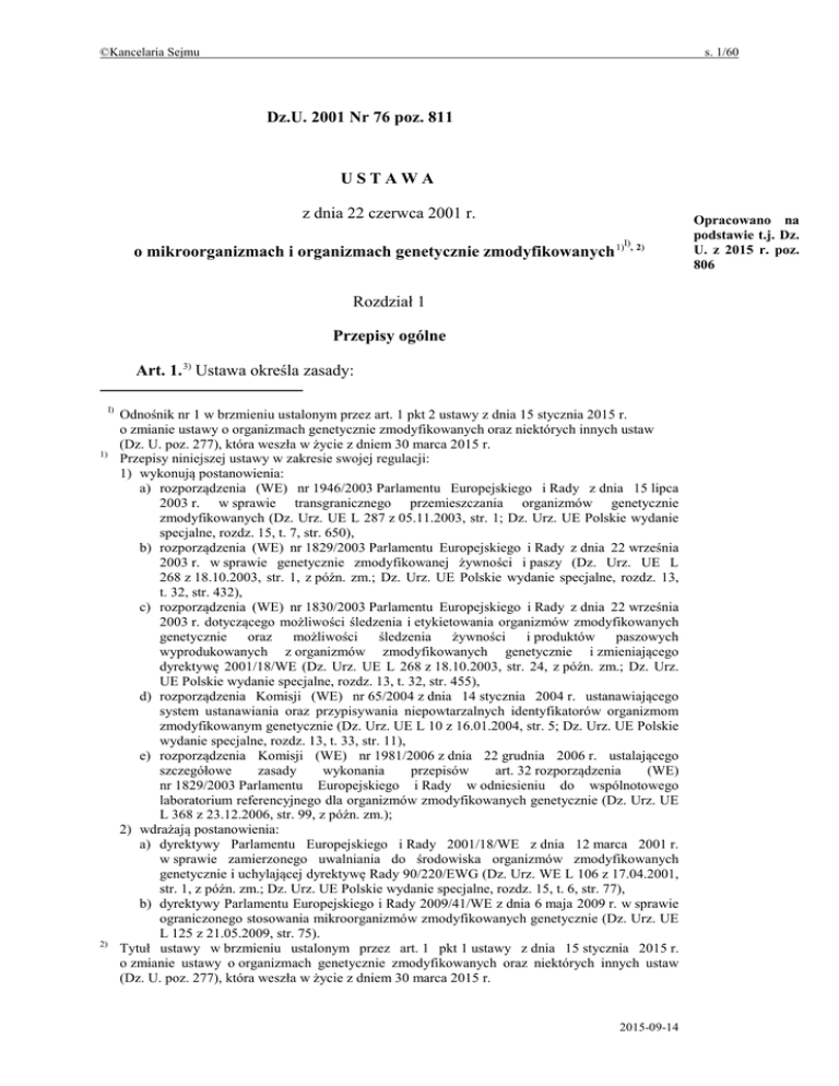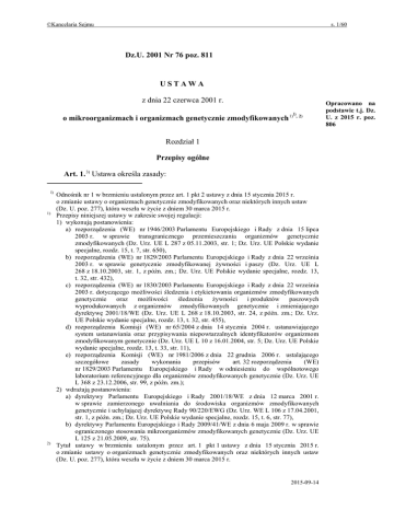 ©Kancelaria Sejmu s. 1/60 Dz.U. 2001 Nr 76 poz. 811 USTAWA z dnia 22 czerwca 2001 r. I), 2) o mikroorganizmach i organizmach genetycznie zmodyfikowanych 1) Rozdział 1 Przepisy ogólne Art. 1. 3) Ustawa określa zasady: I) 1) 2) Odnośnik nr 1 w brzmieniu ustalonym przez art. 1 pkt 2 ustawy z dnia 15 stycznia 2015 r. o zmianie ustawy o organizmach genetycznie zmodyfikowanych oraz niektórych innych ustaw (Dz. U. poz. 277), która weszła w życie z dniem 30 marca 2015 r. Przepisy niniejszej ustawy w zakresie swojej regulacji: 1) wykonują postanowienia: a) rozporządzenia (WE) nr 1946/2003 Parlamentu Europejskiego i Rady z dnia 15 lipca 2003 r. w sprawie transgranicznego przemieszczania organizmów genetycznie zmodyfikowanych (Dz. Urz. UE L 287 z 05.11.2003, str. 1; Dz. Urz. UE Polskie wydanie specjalne, rozdz. 15, t. 7, str. 650), b) rozporządzenia (WE) nr 1829/2003 Parlamentu Europejskiego i Rady z dnia 22 września 2003 r. w sprawie genetycznie zmodyfikowanej żywności i paszy (Dz. Urz. UE L 268 z 18.10.2003, str. 1, z późn. zm.; Dz. Urz. UE Polskie wydanie specjalne, rozdz. 13, t. 32, str. 432), c) rozporządzenia (WE) nr 1830/2003 Parlamentu Europejskiego i Rady z dnia 22 września 2003 r. dotyczącego możliwości śledzenia i etykietowania organizmów zmodyfikowanych genetycznie oraz możliwości śledzenia żywności i produktów paszowych wyprodukowanych z organizmów zmodyfikowanych genetycznie i zmieniającego dyrektywę 2001/18/WE (Dz. Urz. UE L 268 z 18.10.2003, str. 24, z późn. zm.; Dz. Urz. UE Polskie wydanie specjalne, rozdz. 13, t. 32, str. 455), d) rozporządzenia Komisji (WE) nr 65/2004 z dnia 14 stycznia 2004 r. ustanawiającego system ustanawiania oraz przypisywania niepowtarzalnych identyfikatorów organizmom zmodyfikowanym genetycznie (Dz. Urz. UE L 10 z 16.01.2004, str. 5; Dz. Urz. UE Polskie wydanie specjalne, rozdz. 13, t. 33, str. 11), e) rozporządzenia Komisji (WE) nr 1981/2006 z dnia 22 grudnia 2006 r. ustalającego szczegółowe zasady wykonania przepisów art. 32 rozporządzenia (WE) nr 1829/2003 Parlamentu Europejskiego i Rady w odniesieniu do wspólnotowego laboratorium referencyjnego dla organizmów zmodyfikowanych genetycznie (Dz. Urz. UE L 368 z 23.12.2006, str. 99, z późn. zm.); 2) wdrażają postanowienia: a) dyrektywy Parlamentu Europejskiego i Rady 2001/18/WE z dnia 12 marca 2001 r. w sprawie zamierzonego uwalniania do środowiska organizmów zmodyfikowanych genetycznie i uchylającej dyrektywę Rady 90/220/EWG (Dz. Urz. WE L 106 z 17.04.2001, str. 1, z późn. zm.; Dz. Urz. UE Polskie wydanie specjalne, rozdz. 15, t. 6, str. 77), b) dyrektywy Parlamentu Europejskiego i Rady 2009/41/WE z dnia 6 maja 2009 r. w sprawie ograniczonego stosowania mikroorganizmów zmodyfikowanych genetycznie (Dz. Urz. UE L 125 z 21.05.2009, str. 75). Tytuł ustawy w brzmieniu ustalonym przez art. 1 pkt 1 ustawy z dnia 15 stycznia 2015 r. o zmianie ustawy o organizmach genetycznie zmodyfikowanych oraz niektórych innych ustaw (Dz. U. poz. 277), która weszła w życie z dniem 30 marca 2015 r. 2015-09-14 Opracowano na podstawie t.j. Dz. U. z 2015 r. poz. 806 ©Kancelaria Sejmu s. 2/60 1) zamkniętego użycia mikroorganizmów genetycznie zmodyfikowanych; 2) zamkniętego użycia organizmów genetycznie zmodyfikowanych; 3) zamierzonego uwalniania organizmów genetycznie zmodyfikowanych do środowiska; 4) wprowadzania do obrotu produktów genetycznie zmodyfikowanych. Art. 2.3) 1. Ustawy nie stosuje się do modyfikacji genetycznych organizmu ludzkiego, w tym także w prenatalnej fazie jego rozwoju. 2. Przepisów ustawy nie stosuje się do magazynowania, hodowania, transportu, niszczenia, usuwania lub wykorzystywania mikroorganizmów genetycznie zmodyfikowanych, które zostały wprowadzone do obrotu na podstawie decyzji Komisji Europejskiej w sprawie ich wprowadzenia do obrotu, w tym decyzji wydanej na podstawie przepisów rozporządzenia (WE) nr 1829/2003 Parlamentu Europejskiego i Rady z dnia 22 września 2003 r. w sprawie genetycznie zmodyfikowanej żywności i paszy (Dz. Urz. UE L 268 z 18.10.2003, str. 1, z późn. zm.; Dz. Urz. UE Polskie wydanie specjalne rozdz. 13, t. 32, str. 432) albo na podstawie decyzji państwa członkowskiego Unii Europejskiej wydanej zgodnie z przepisami wdrażającymi część C dyrektywy Parlamentu Europejskiego i Rady 2001/18/WE z dnia 12 marca 2001 r. w sprawie zamierzonego uwalniania do środowiska organizmów zmodyfikowanych genetycznie i uchylającej dyrektywę Rady 90/220/EWG (Dz. Urz. WE L 106 z 17.04.2001, str. 1, z późn. zm.; Dz. Urz. UE Polskie wydanie specjalne, rozdz. 15, t. 6, str. 77). 3. Do transportu mikroorganizmów genetycznie zmodyfikowanych stosuje się odpowiednio rozdziały 1–2a, z wyłączeniem przepisów art. 6 ust. 7–9, art. 6a, art. 6b, art. 12, art. 13, art. 15a–15n, art. 15r, art. 15s i art. 15v. Art. 3.3) Ilekroć w ustawie jest mowa o: 1) awarii – rozumie się przez to każde niezamierzone uwolnienie mikroorganizmu genetycznie zmodyfikowanego do środowiska podczas jego zamkniętego użycia, które może stanowić natychmiastowe albo opóźnione zagrożenie dla zdrowia ludzi lub dla środowiska; 2) biorcy – rozumie się przez to mikroorganizm lub organizm, do którego wprowadza się kwas nukleinowy; 3) W brzmieniu ustalonym przez art. 1 pkt 3 ustawy, o której mowa w odnośniku 2. 2015-09-14 ©Kancelaria Sejmu 3) s. 3/60 dawcy – rozumie się przez to mikroorganizm lub organizm, z którego pobiera się kwas nukleinowy; 4) fuzji protoplastów – rozumie się przez to proces prowadzący do połączenia się co najmniej dwóch protoplastów w jeden protoplast mieszańcowy; 5) hodowli komórkowej – rozumie się przez to hodowlę in vitro komórek pochodzących z organizmów wielokomórkowych; 6) insercie – rozumie się przez to fragment kwasu nukleinowego włączony do genomu biorcy, odpowiedzialny za modyfikację genetyczną; 7) koniugacji, transformacji lub transdukcji – rozumie się prze
